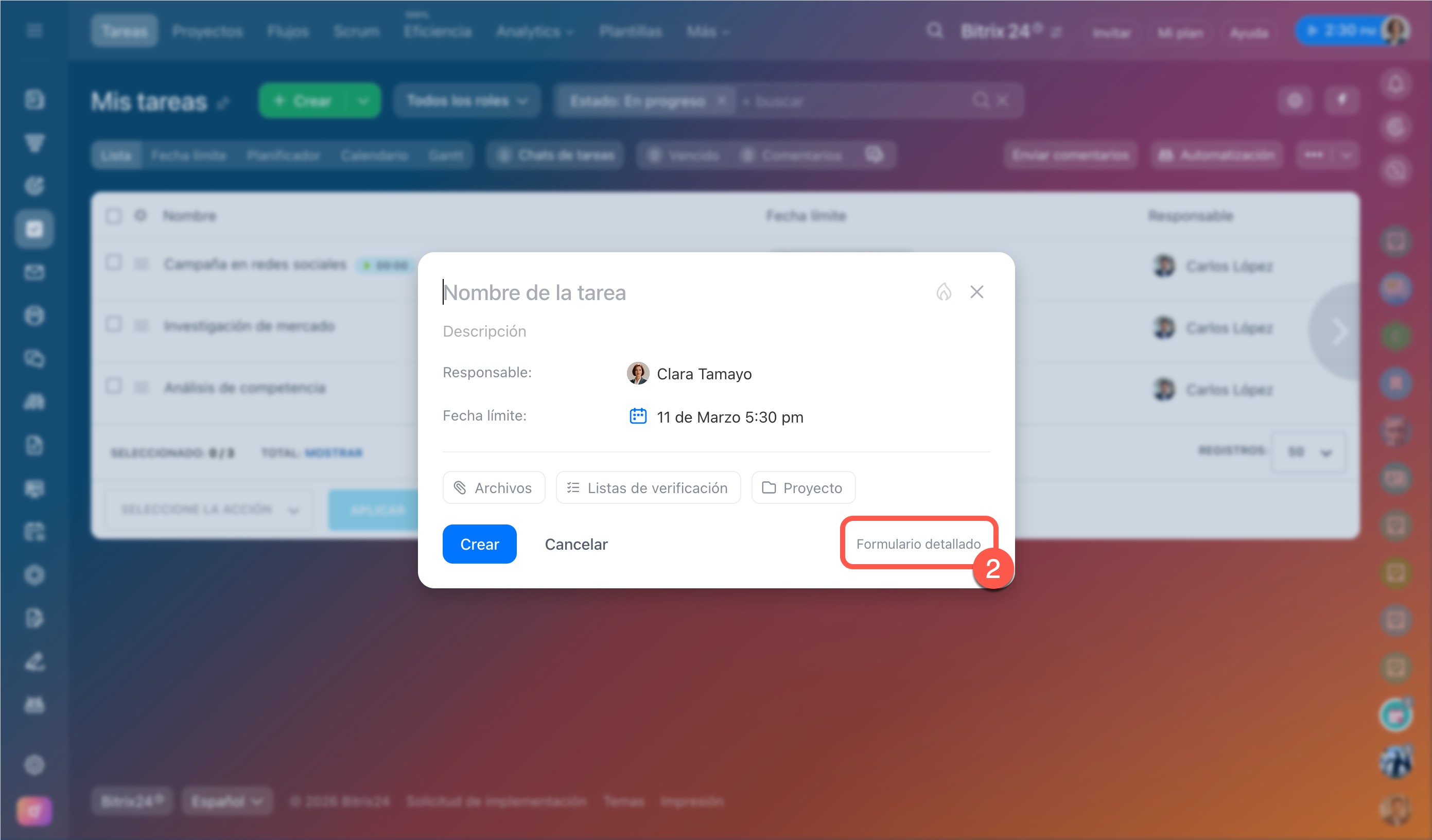 En la ficha de una nueva tarea: en la sección Tareas y proyectos, haz clic en Crear. En la ficha de la tarea, selecciona Formulario detallado. Haz clic en el bloque Plantillas en la parte inferior de la ficha y selecciona la que necesitas.