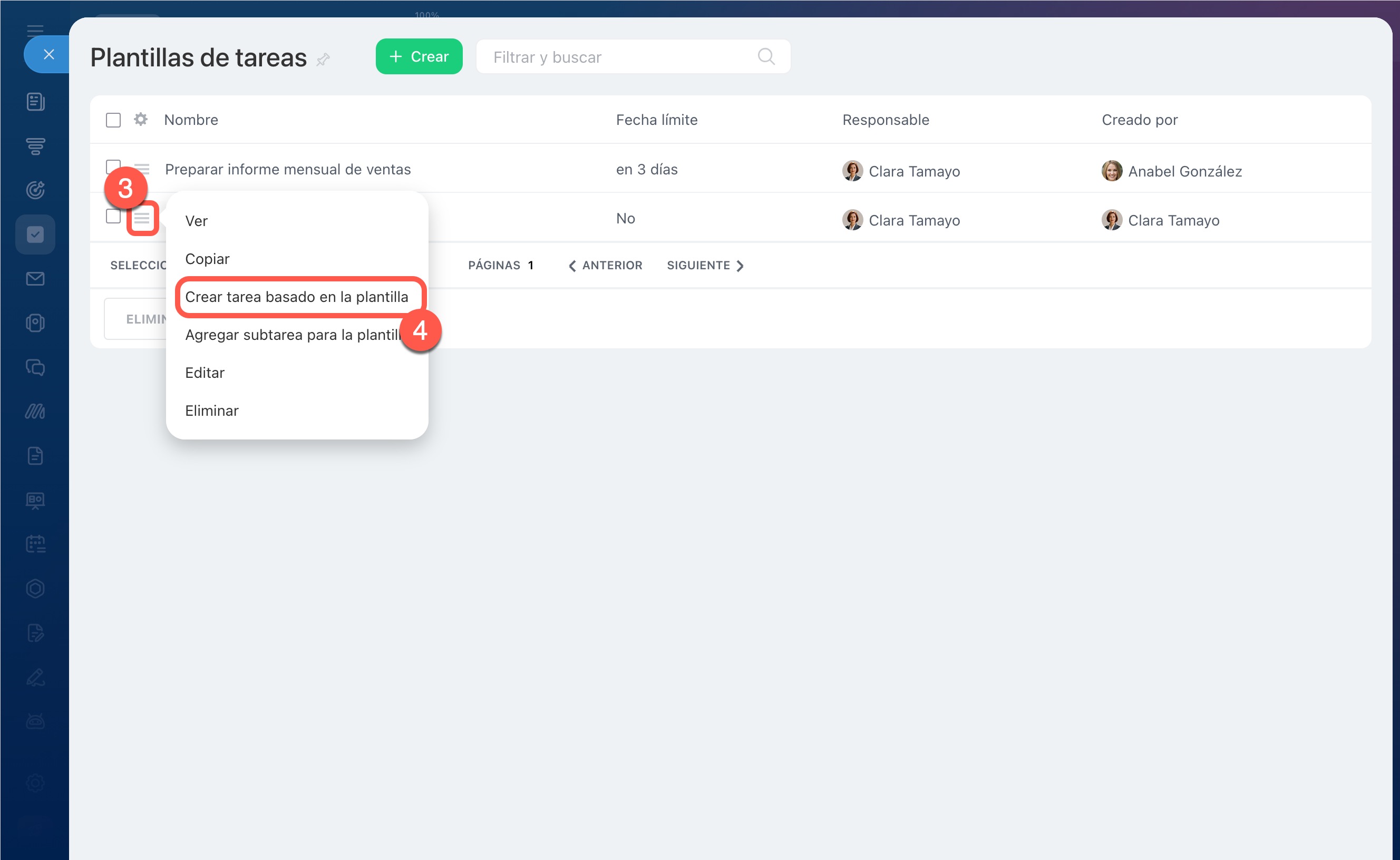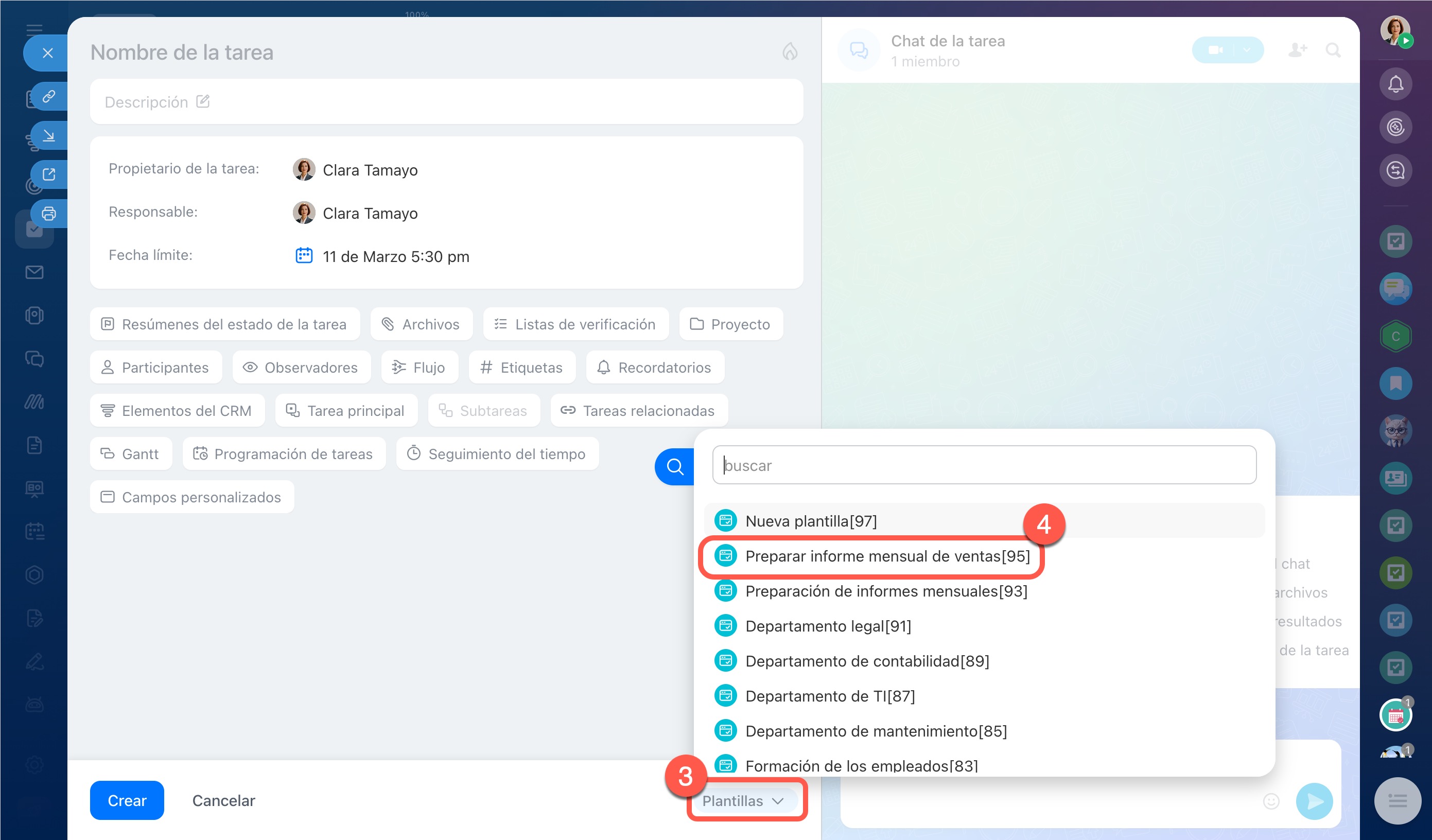 5–6. Junto a la plantilla que necesitas, haz clic en Menú (≡) > Crear tarea basado en la plantilla. En la ficha de la tarea se mostrarán todos los parámetros configurados en la plantilla. Si es necesario, puedes editarlos; la plantilla en sí no cambiará.