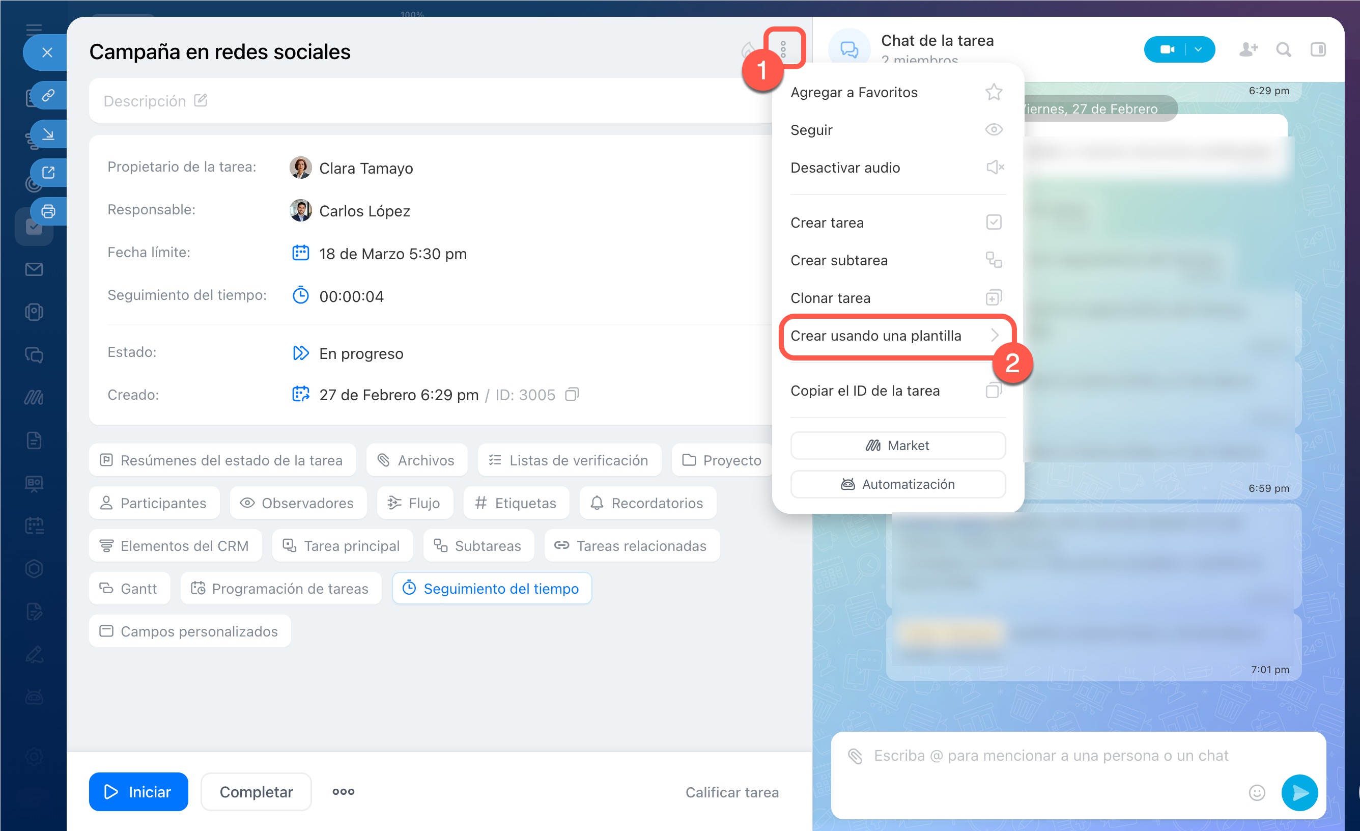 Añade funcionalidades adicionales: por ejemplo, puedes añadir a la plantilla una lista de verificación, archivos, activar el seguimiento del tiempo o hacer que la tarea sea regular. Esto permite establecer un orden de acciones, adjuntar los materiales necesarios, registrar el tiempo invertido y repetir automáticamente la tarea según un calendario.