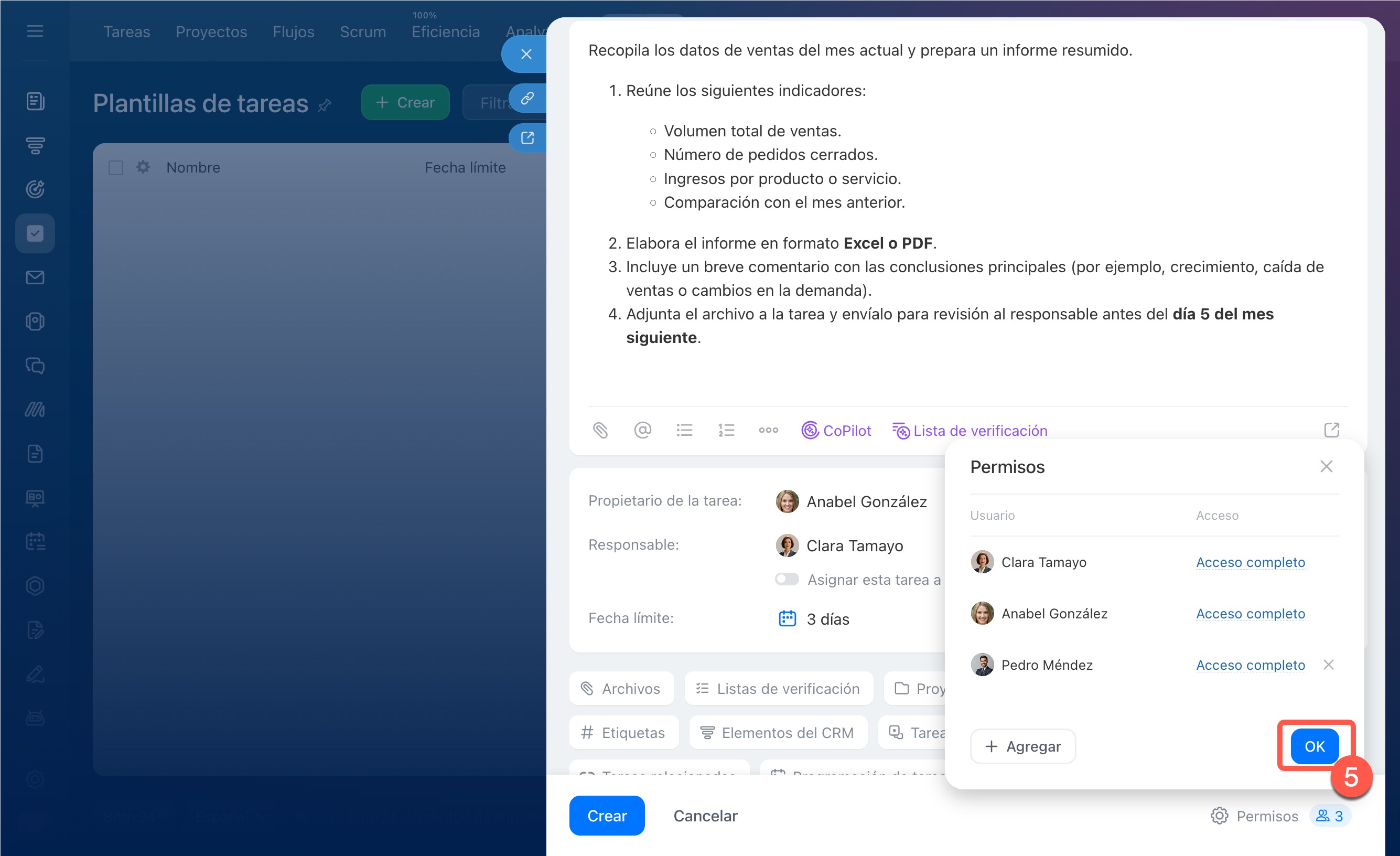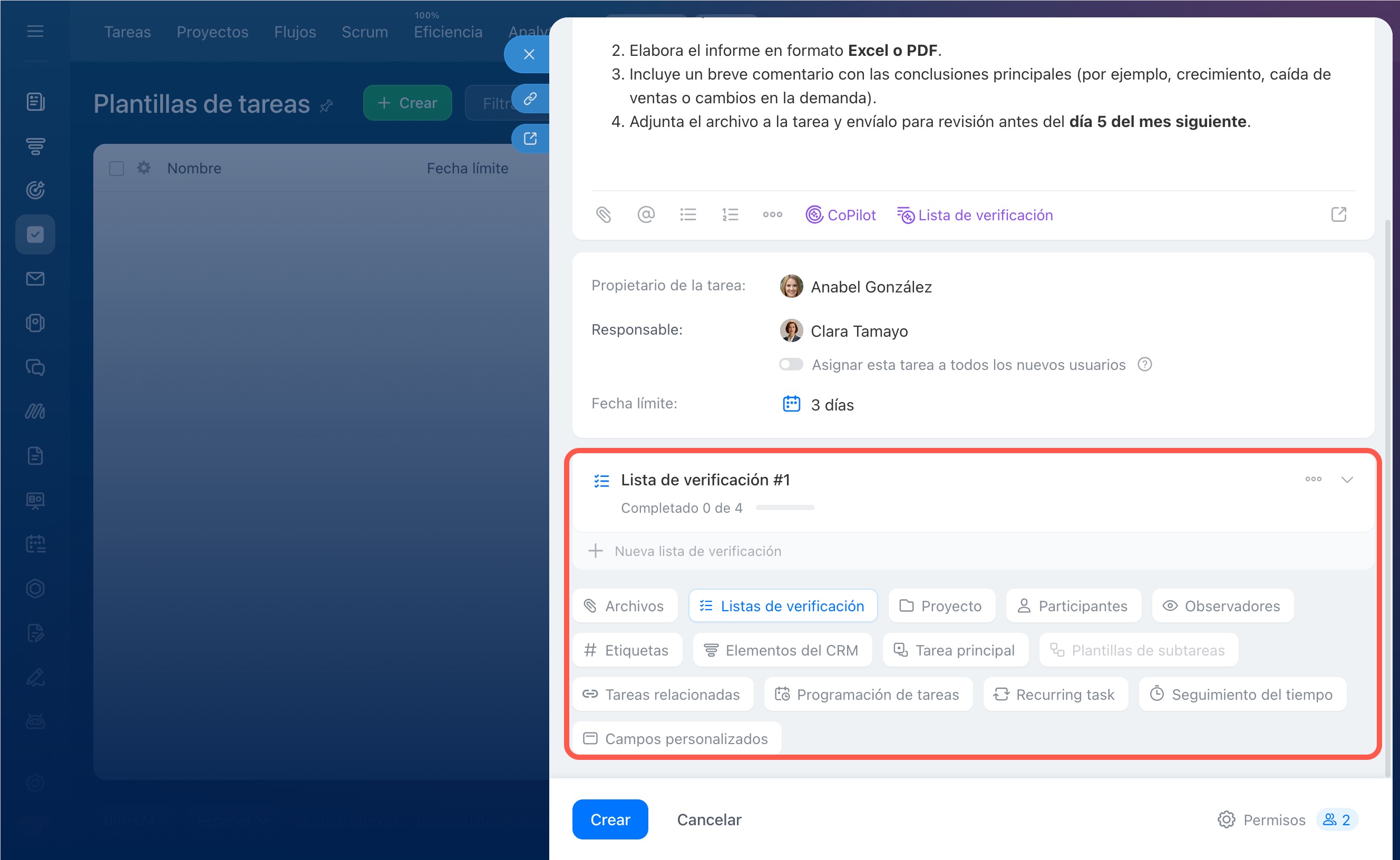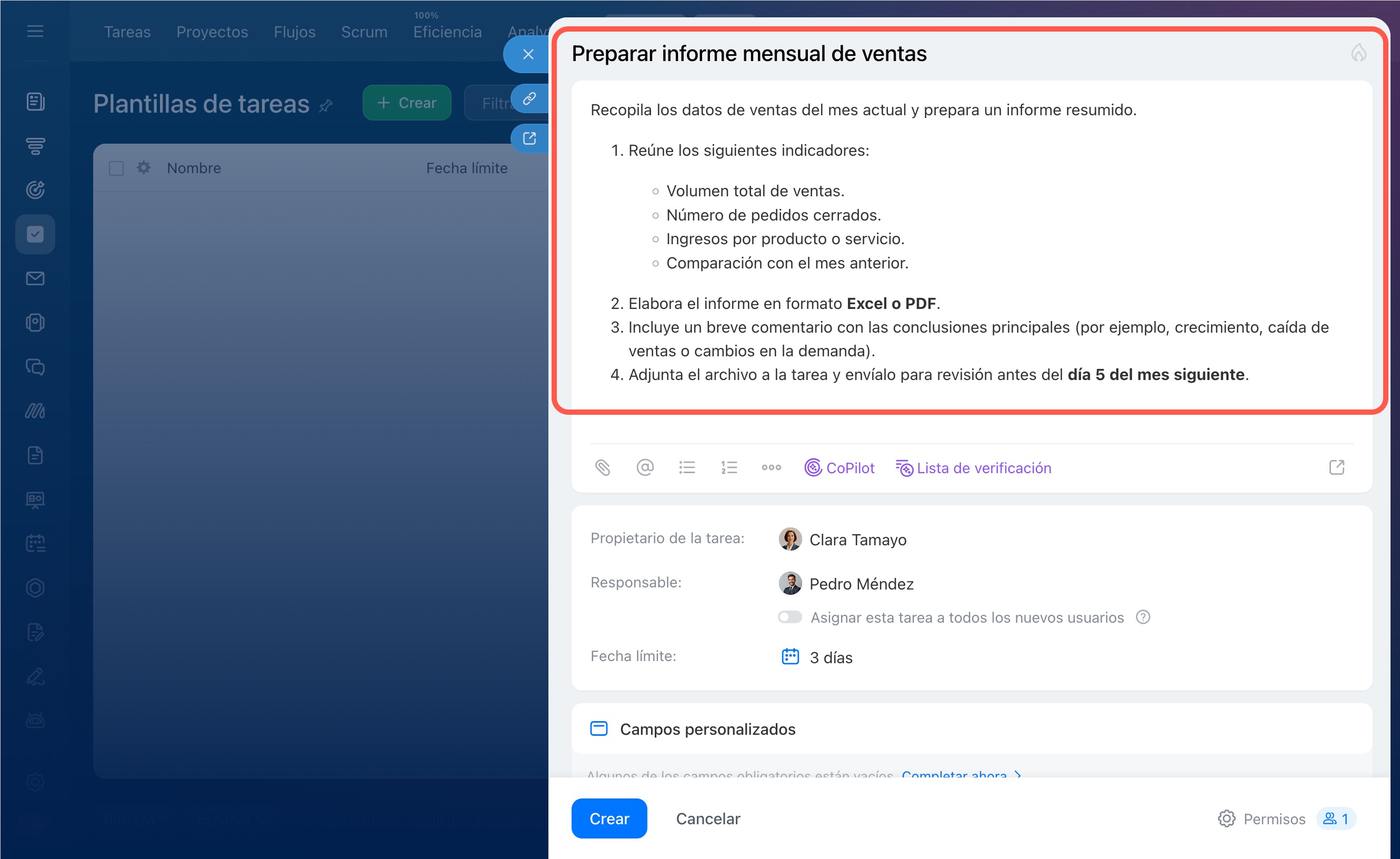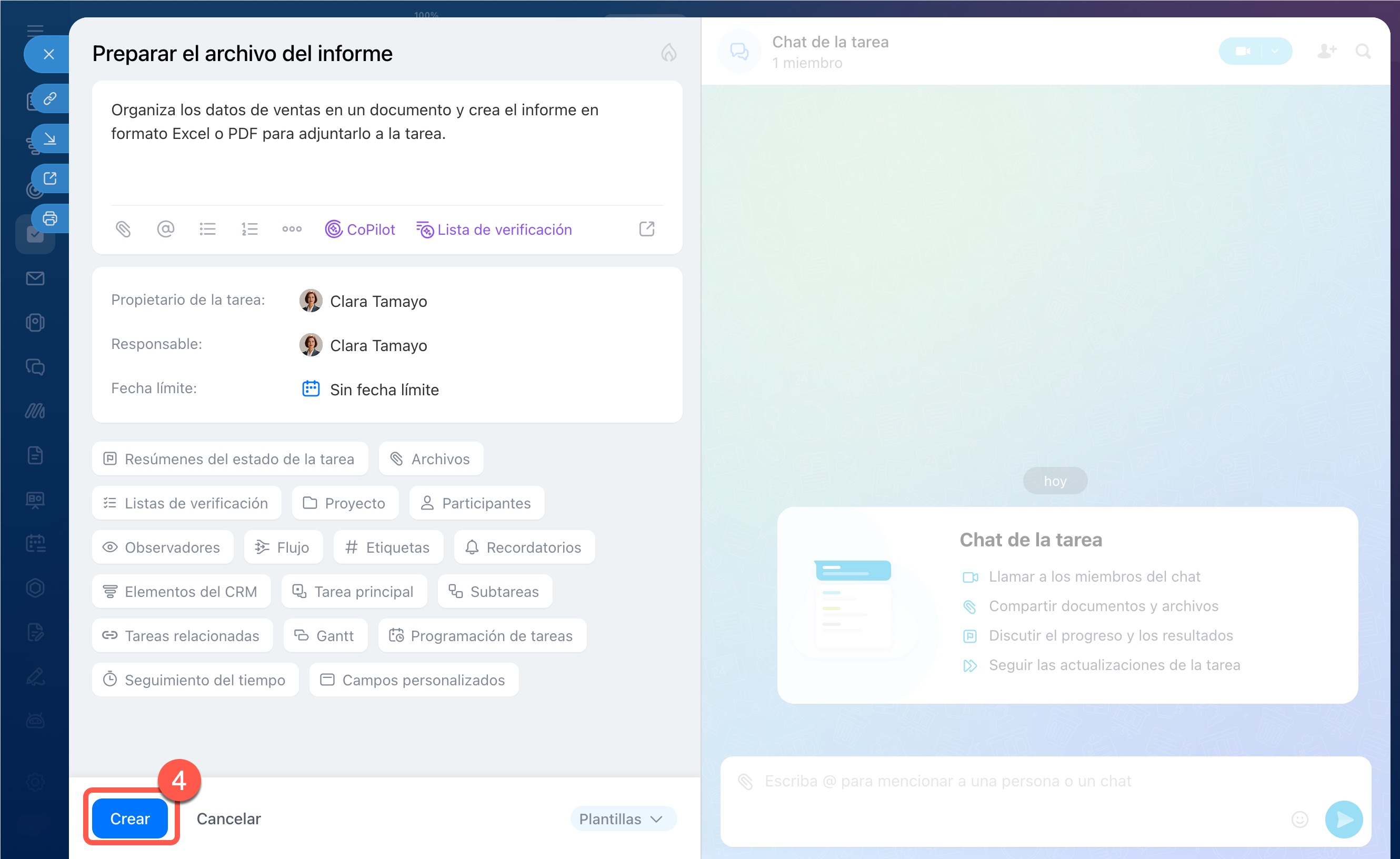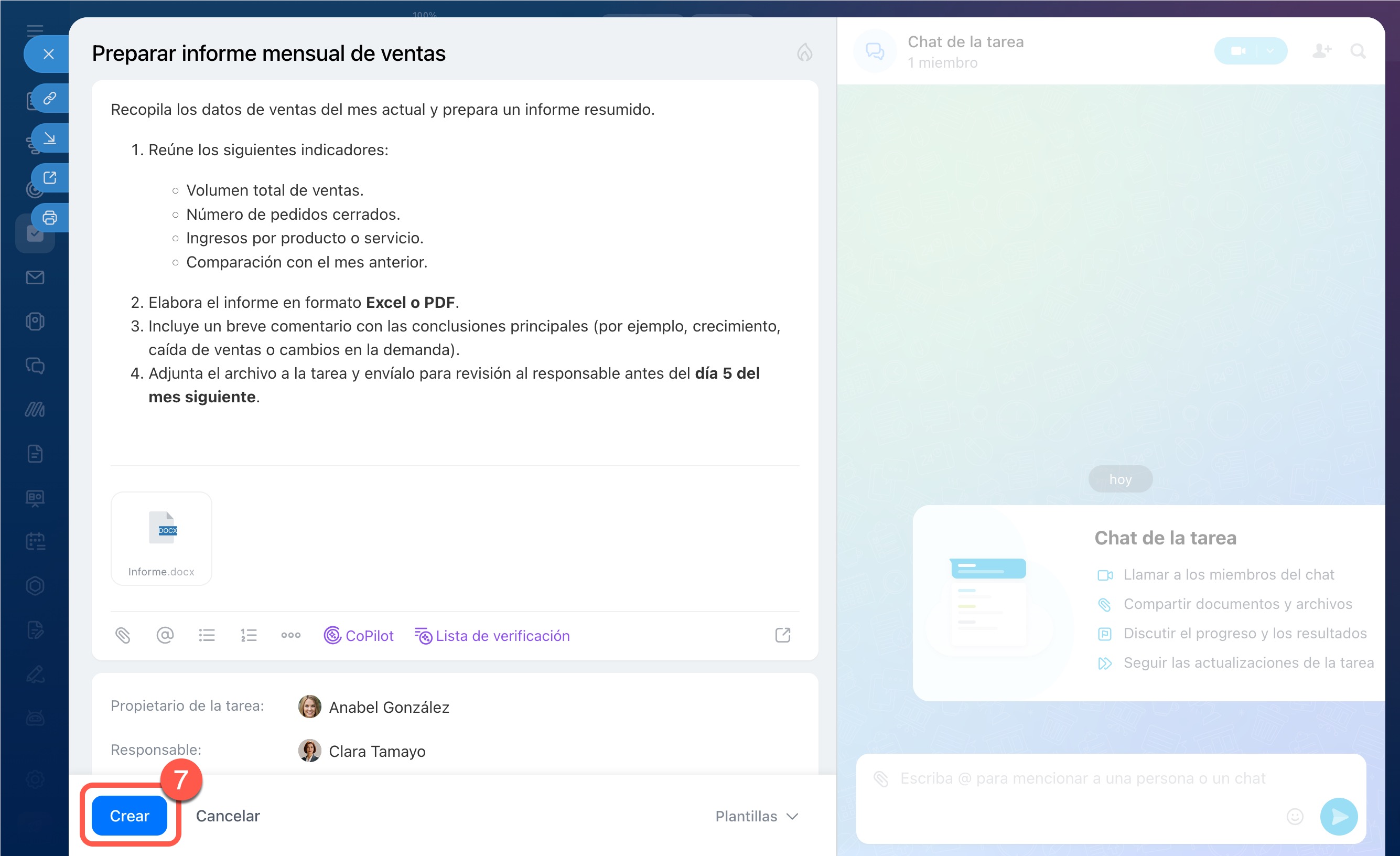 3. Se abrirá la ficha de la tarea; edítala si es necesario y haz clic en Crear.