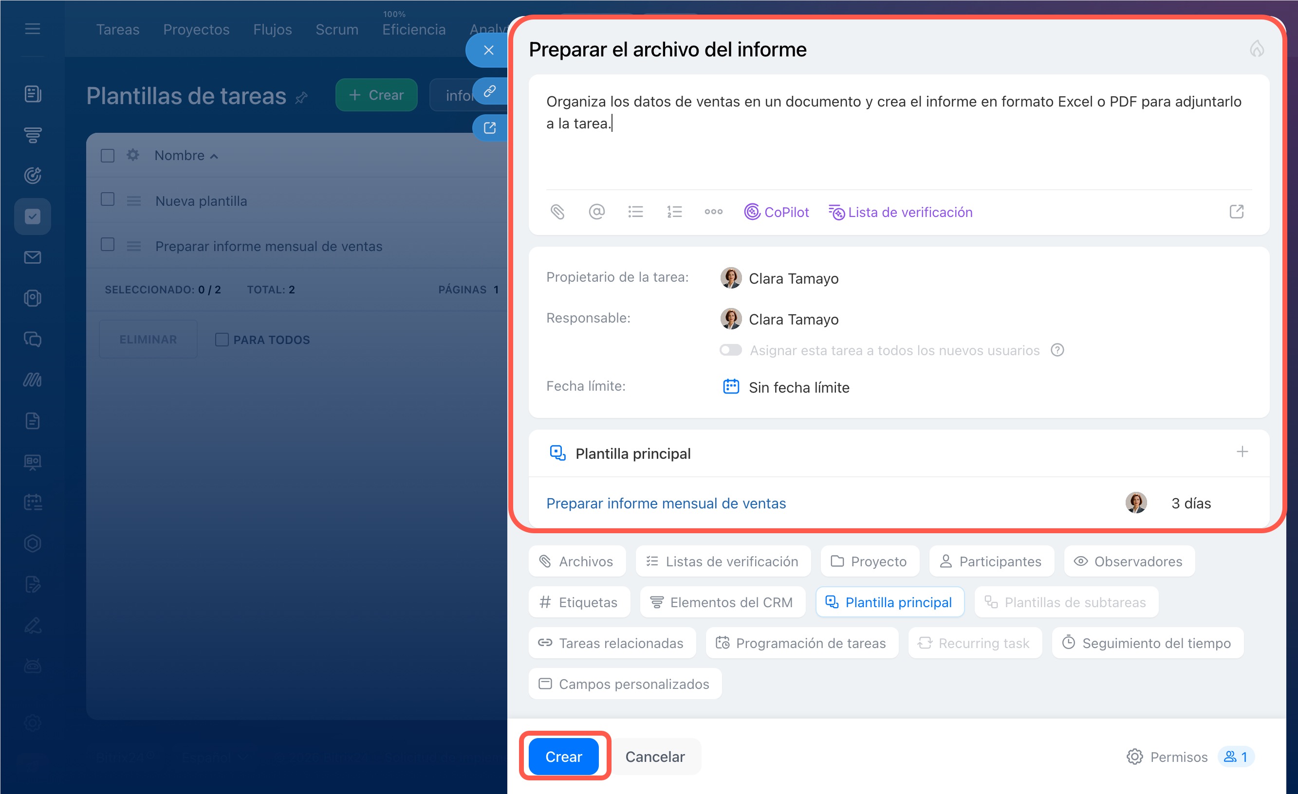 Se abrirá la ficha de la nueva plantilla para subtareas; complétala. Bitrix24 indicará automáticamente la plantilla principal. Haz clic en Crear.