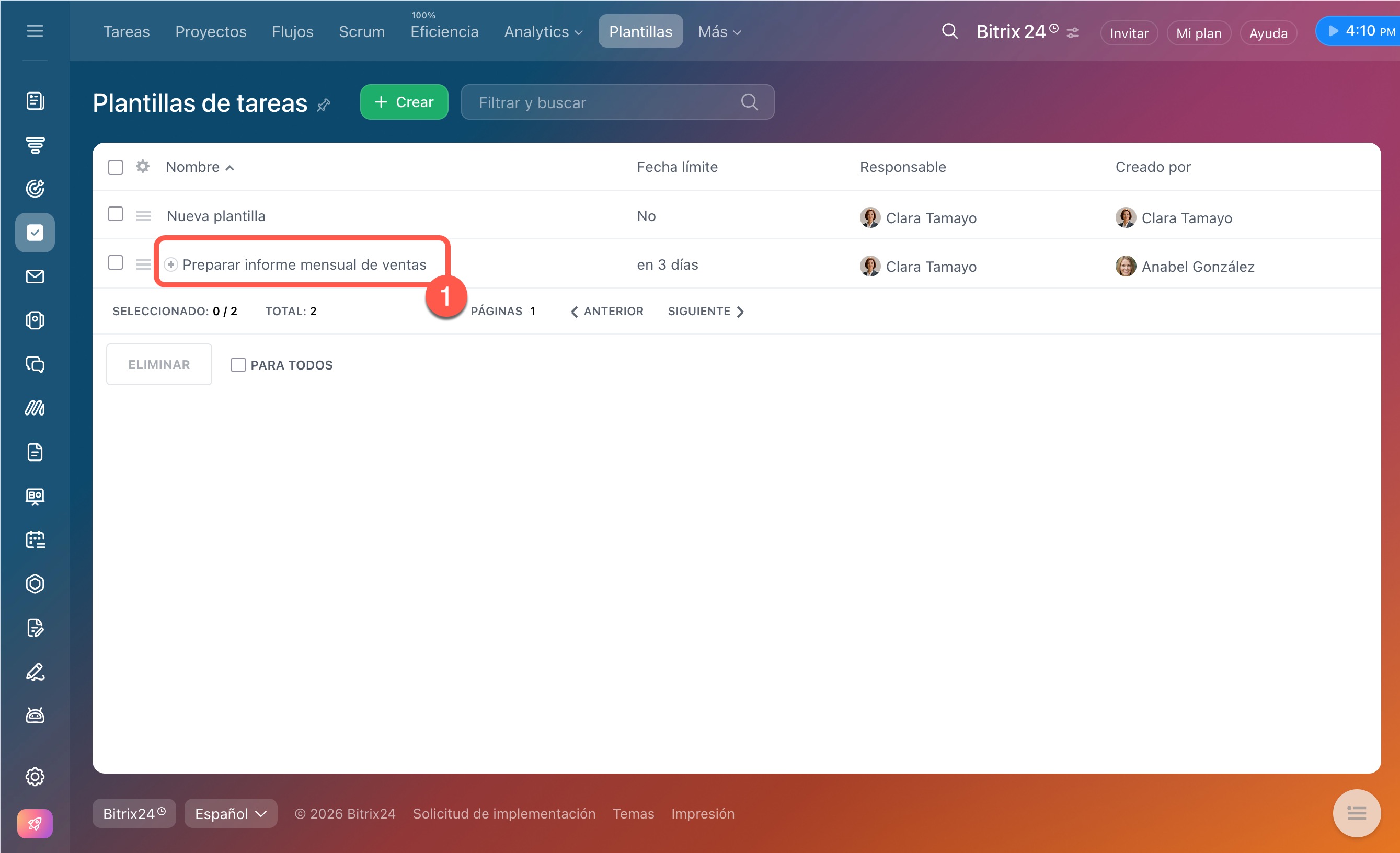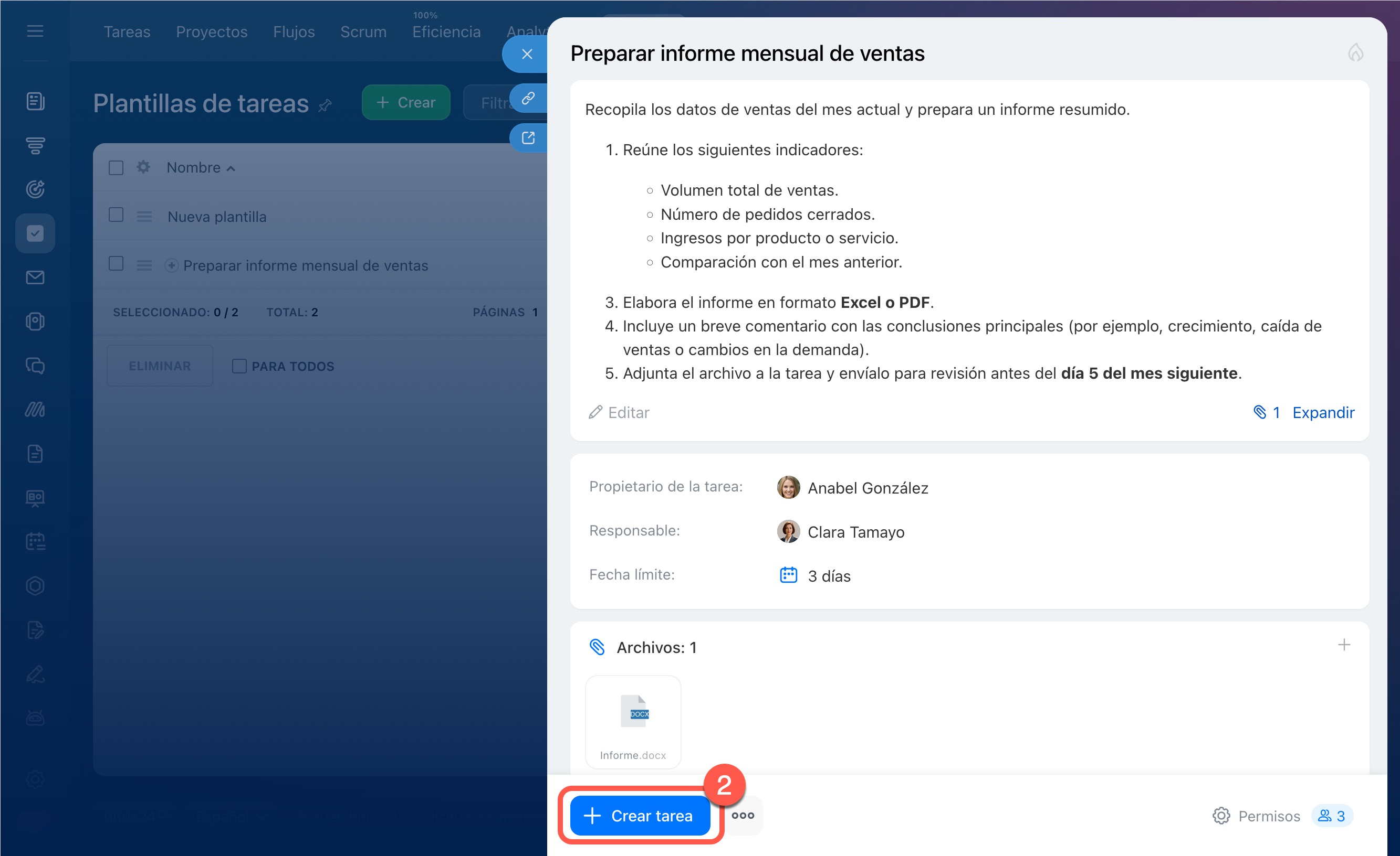 1–2. Abre la plantilla principal y haz clic en Crear tarea.