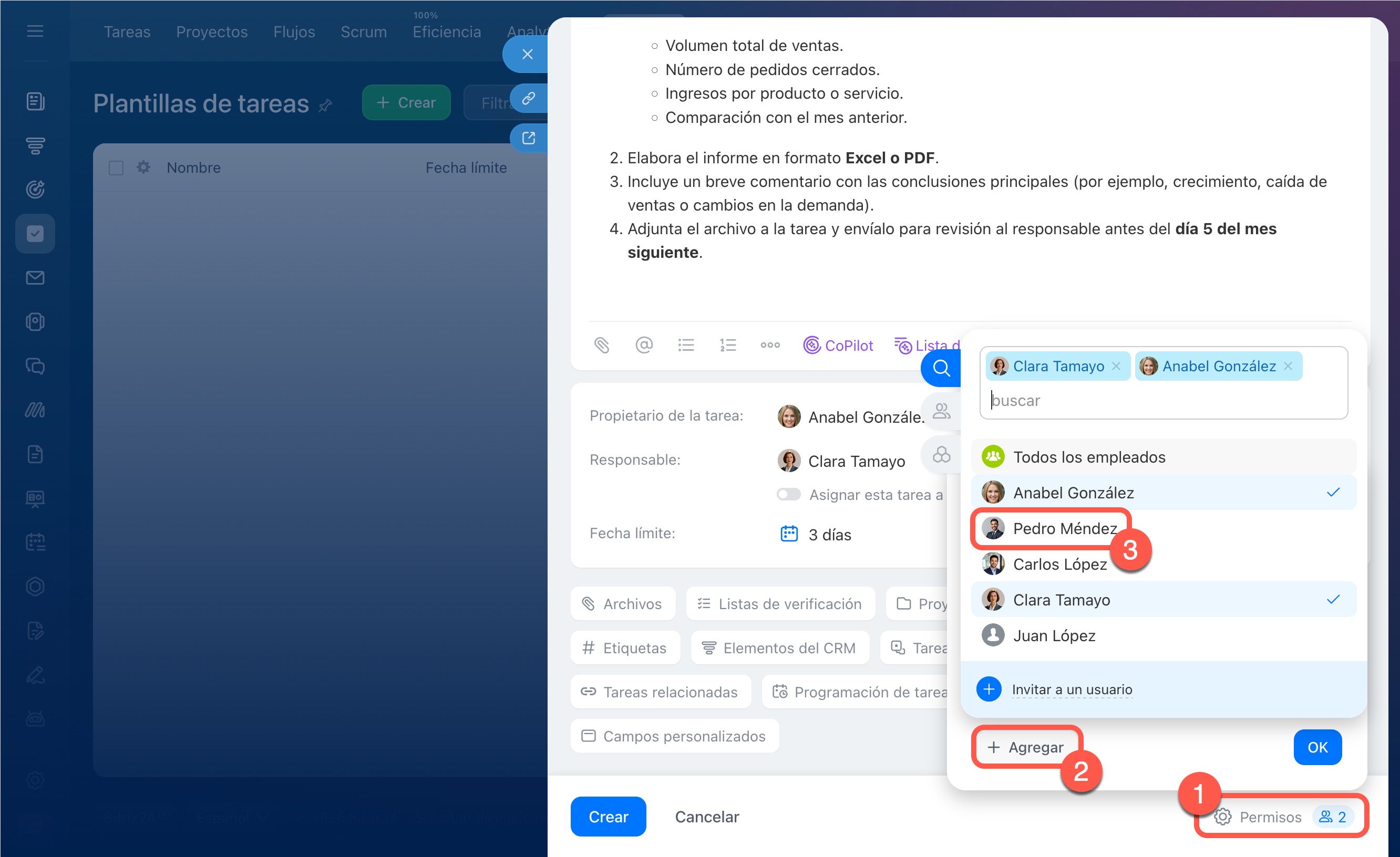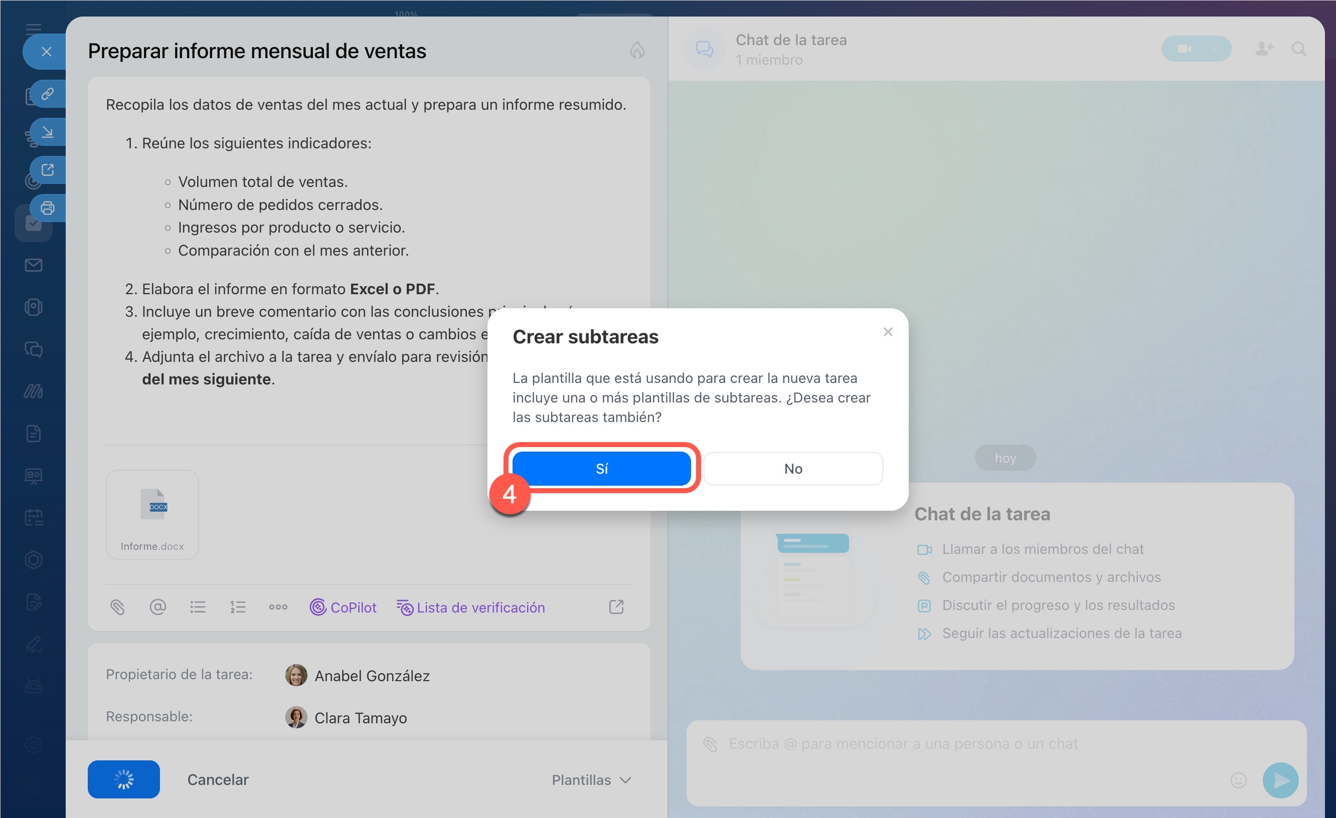 Esto es conveniente si asignas tareas similares con regularidad, por ejemplo, al incorporar a un nuevo empleado o preparar un informe mensual. No es necesario completar la descripción, adjuntar archivos y detallar los pasos cada vez. El empleado recibe de inmediato una asignación completa y estructurada, y comprende qué debe hacer.