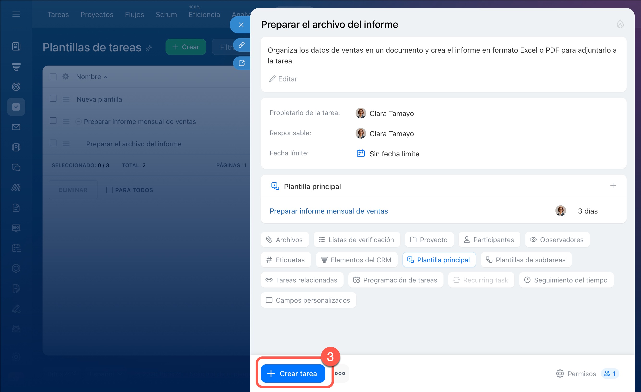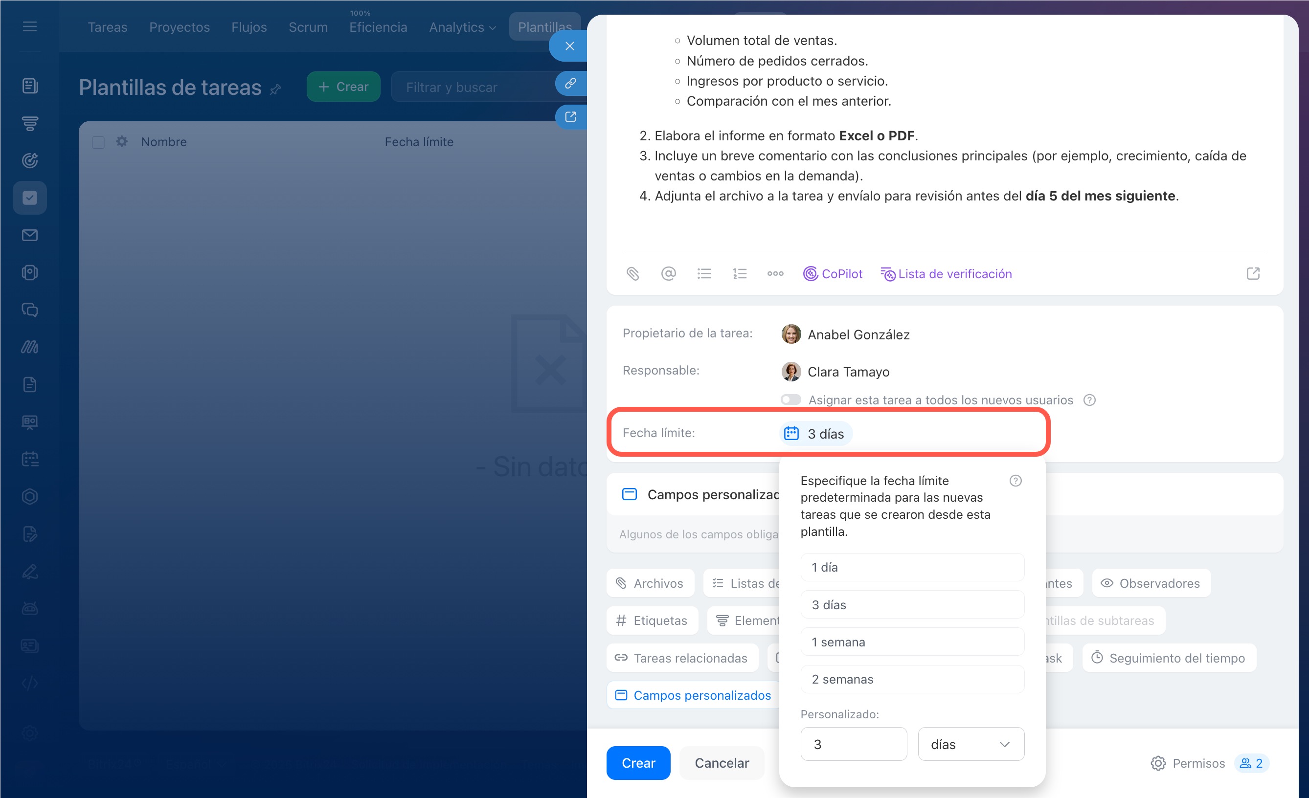 Indica la fecha límite: cuánto tiempo se necesita para completar las tareas basadas en esta plantilla. Se aplicará automáticamente a todas las tareas creadas. Puedes elegir una opción de la lista o indicar una propia. Por ejemplo, establecer un plazo de tres días: cada tarea basada en la plantilla debe completarse en ese período.
