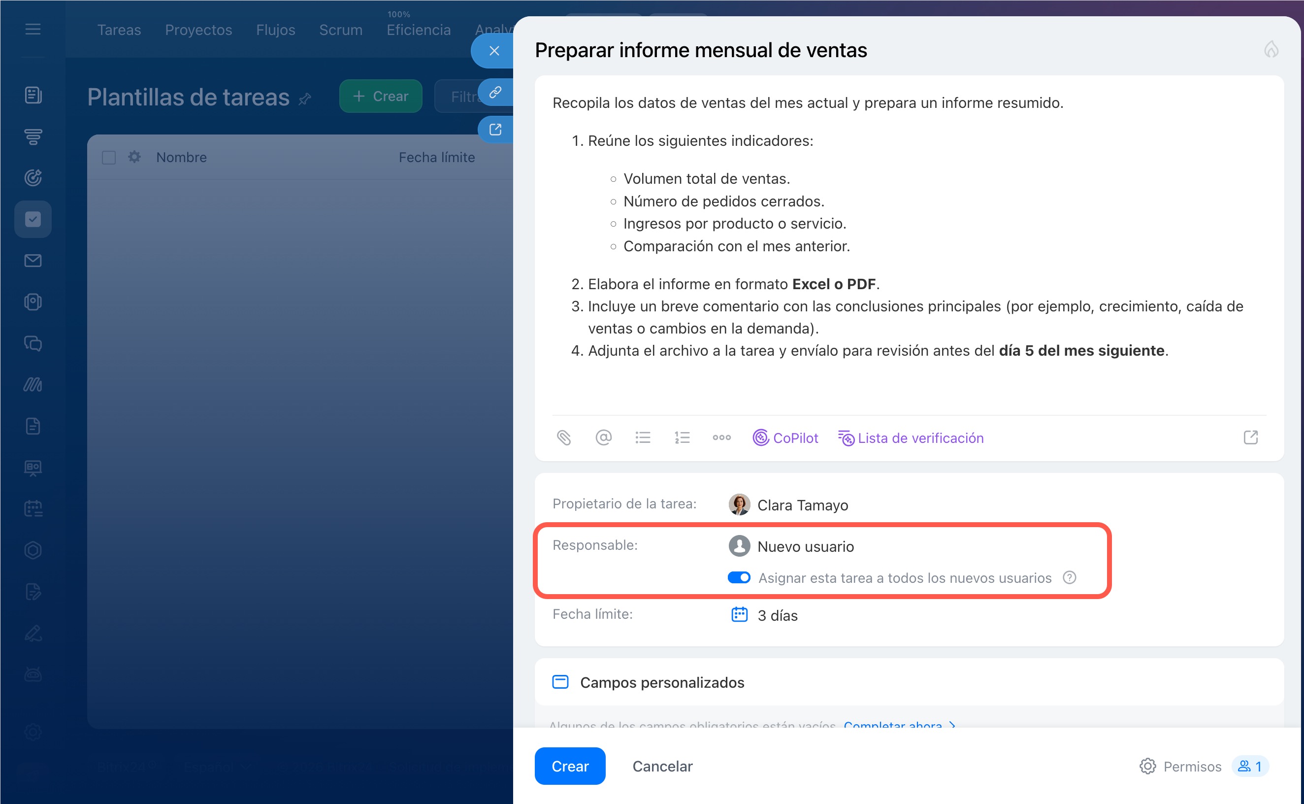 Activa la opción "Asignar esta tarea a todos los nuevos usuarios": las tareas basadas en esta plantilla se crearán automáticamente para cada nuevo empleado en Bitrix24. El nuevo empleado será asignado como responsable. Por ejemplo, puedes configurar una plantilla con instrucciones de adaptación; esta tarea se asignará automáticamente a cada nuevo empleado.