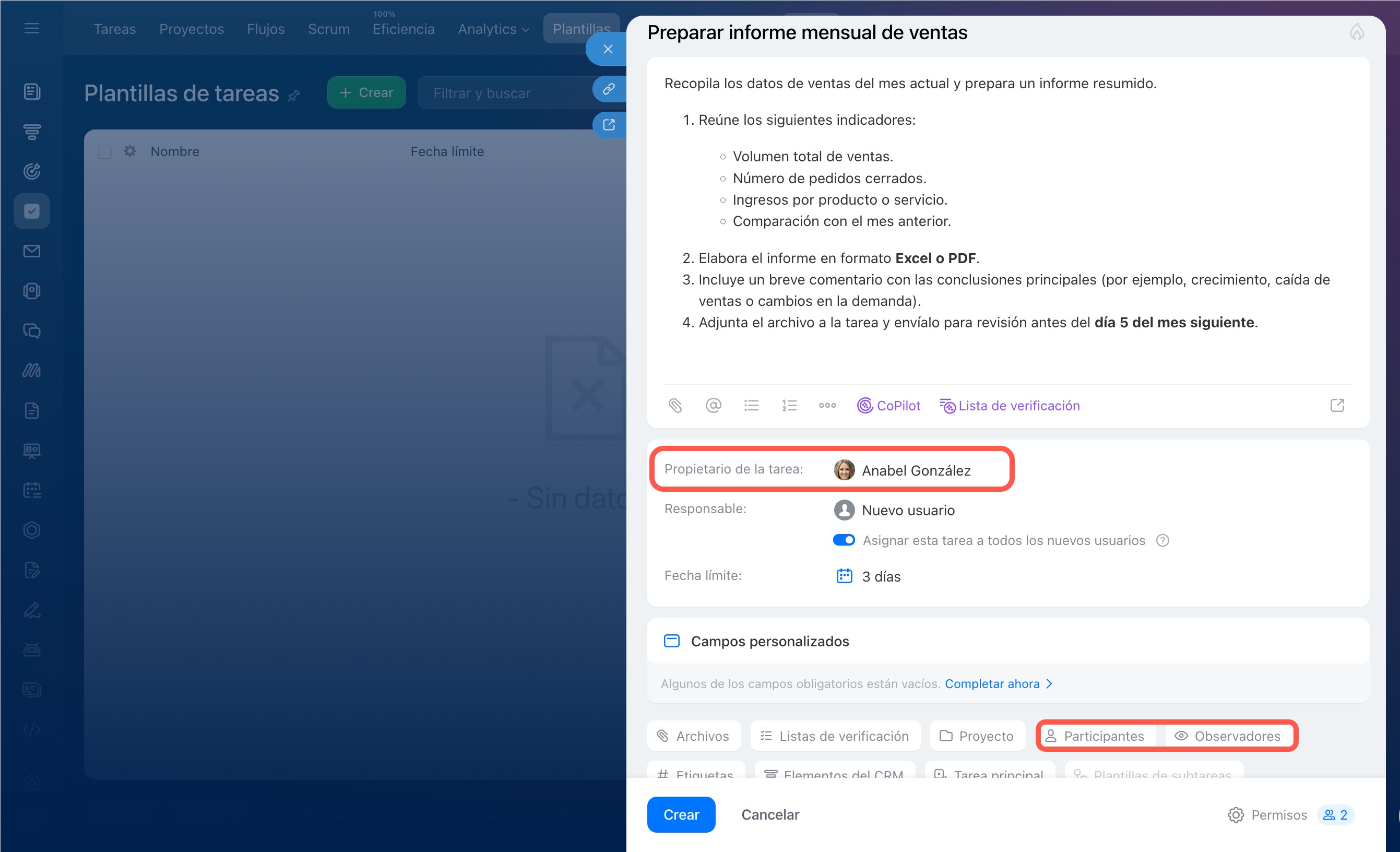 Indica el creador (propietario): por defecto, en la plantilla puedes seleccionar al creador. Al crear una tarea a partir de esta plantilla, el creador será el empleado que la asignó, incluso si en la plantilla se indica otro usuario.