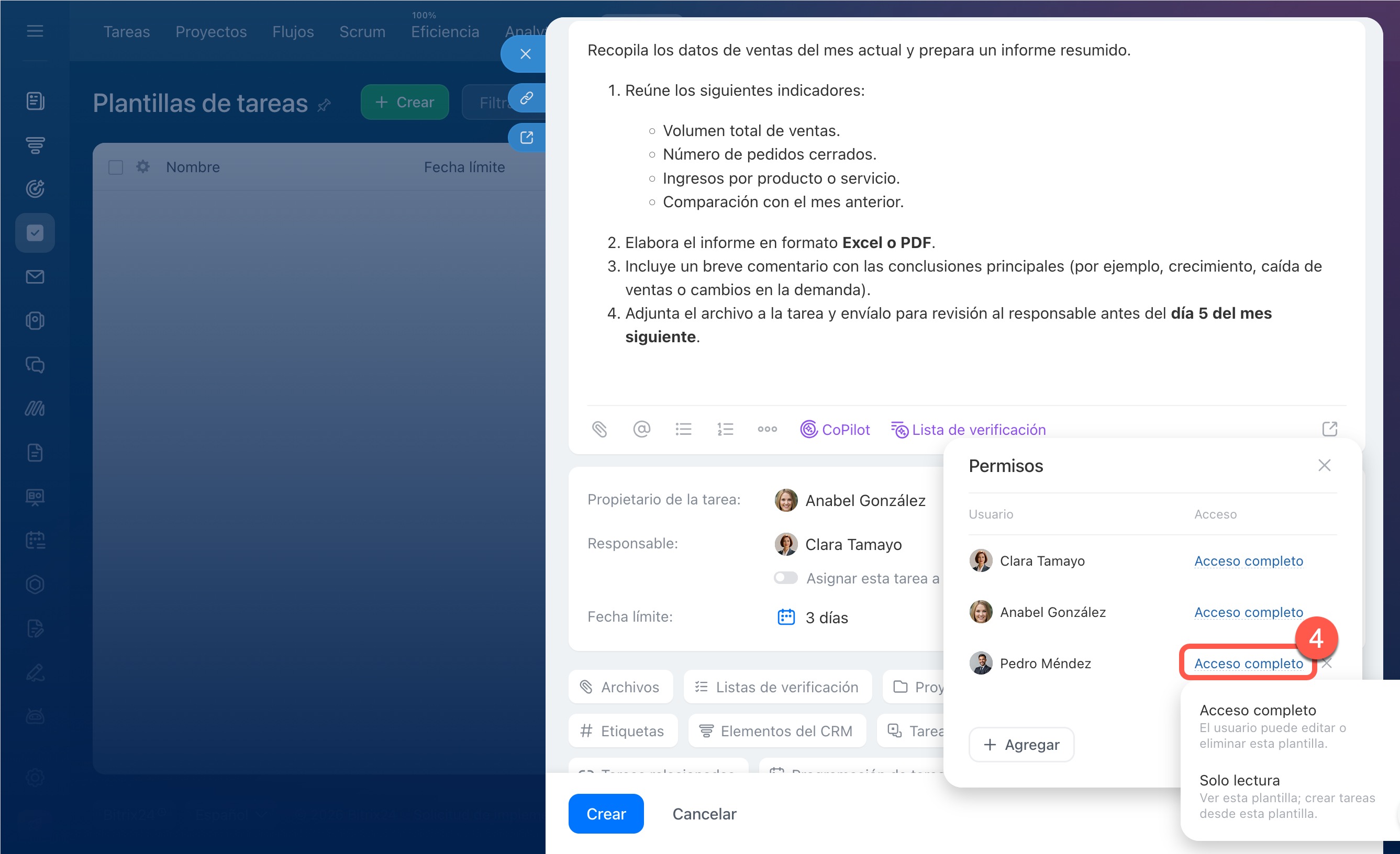 Configura los permisos de acceso: indica quién puede solo crear tareas a partir de esta plantilla y quién puede editar la plantilla en sí.