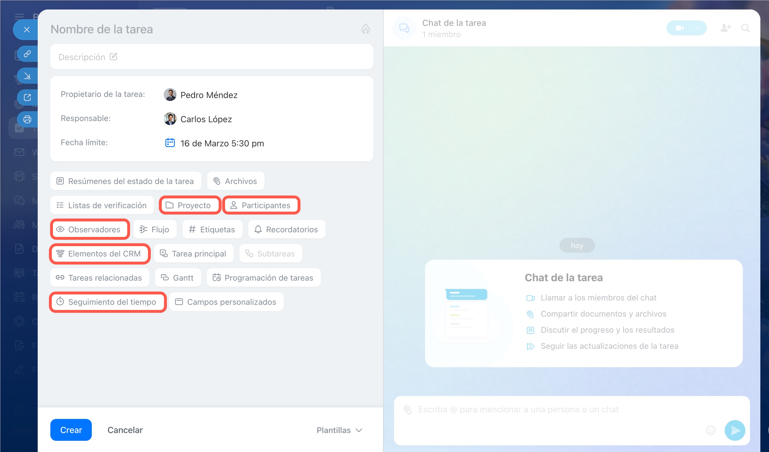 - Añadir participantes u observadores.