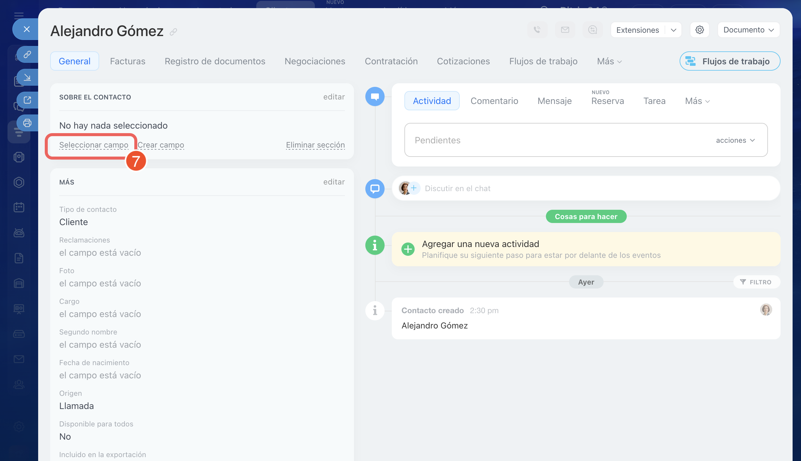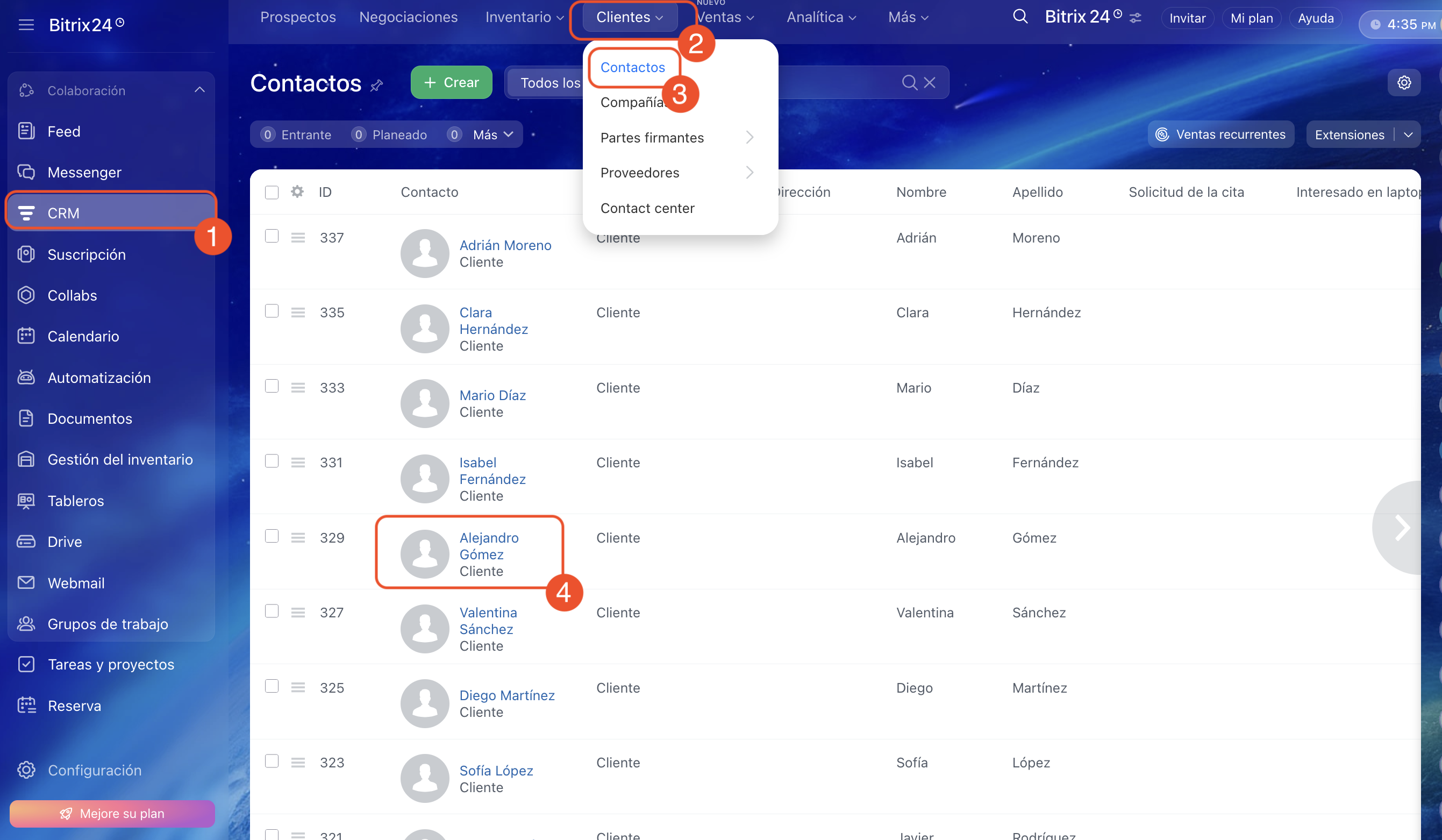 1–4. Ve a CRM > Clientes > Contactos y abre la ficha necesaria.