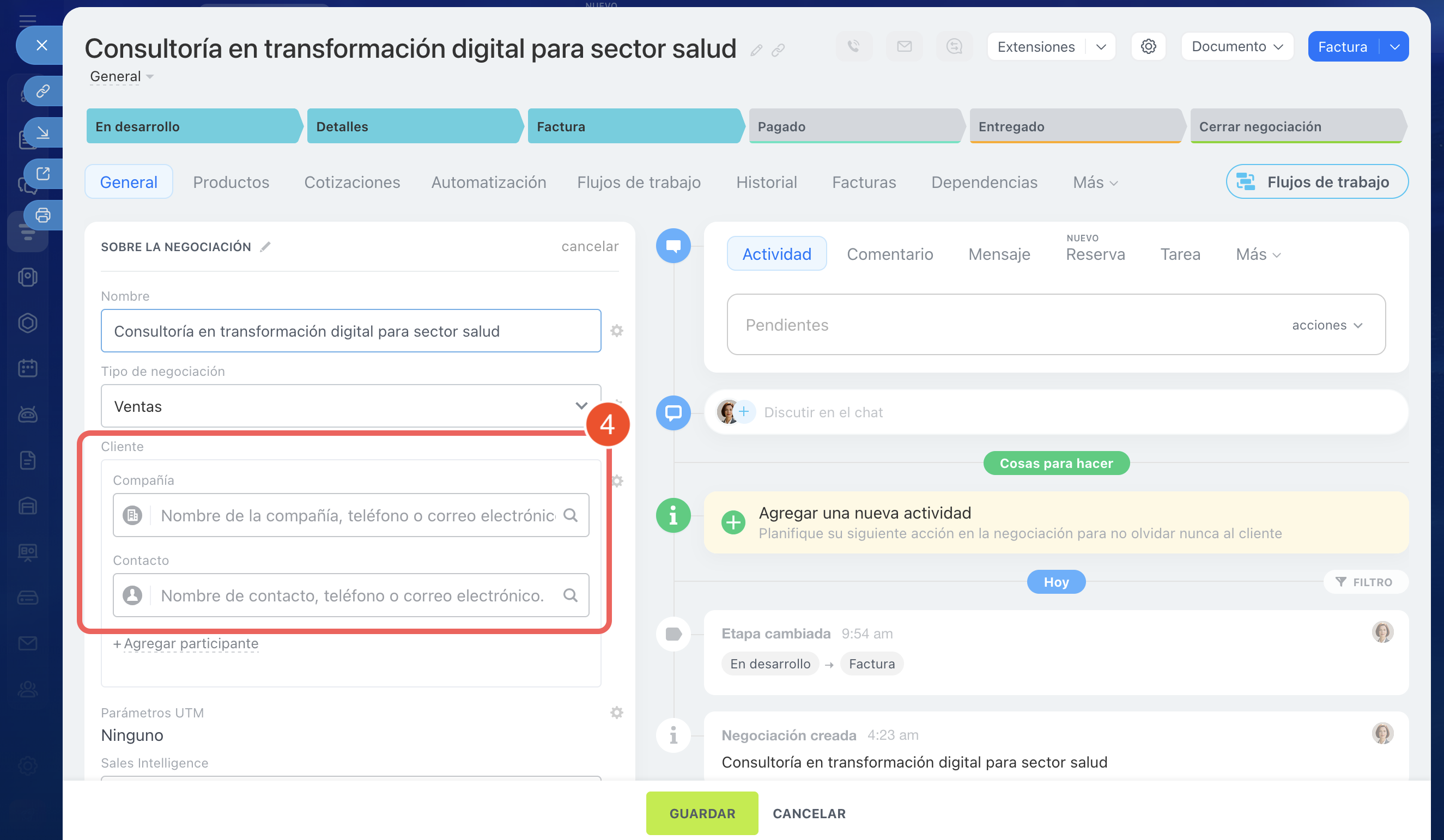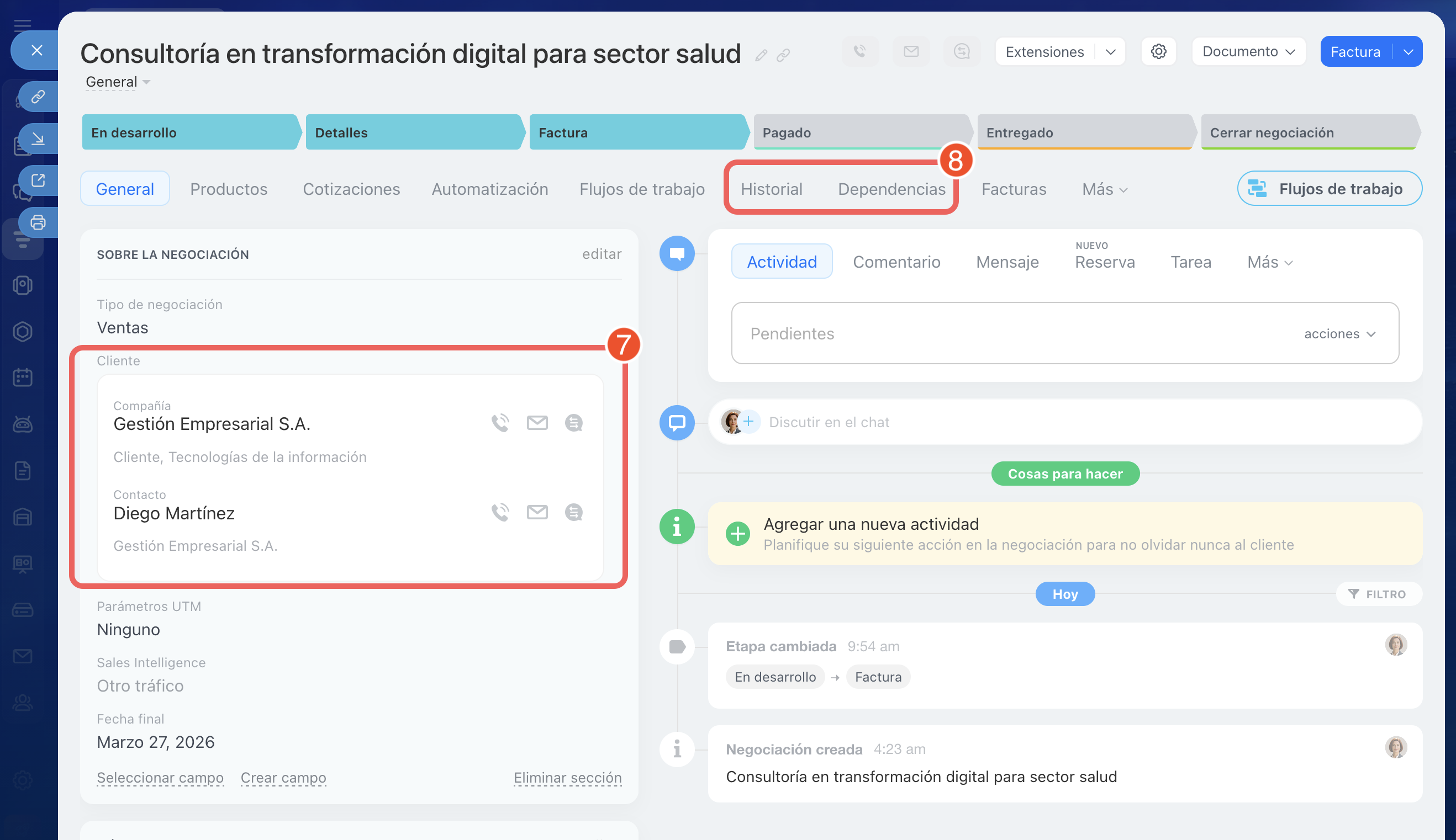 6–8. Haz clic en Guardar. La negociación se vinculará con la compañía y los contactos. Para ir a la ficha del elemento vinculado, haz clic en su nombre: en el campo Cliente, en las pestañas Dependencias e Historial.