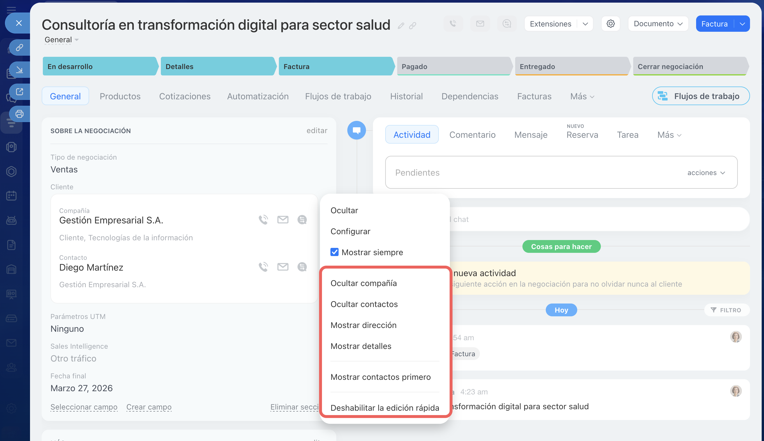 - Deshabilitar la edición rápida. Por defecto, los datos del cliente se pueden editar directamente desde la ficha de la negociación. Si desactivas la edición rápida, para cambiar los datos se abrirá la ficha del contacto o de la compañía.