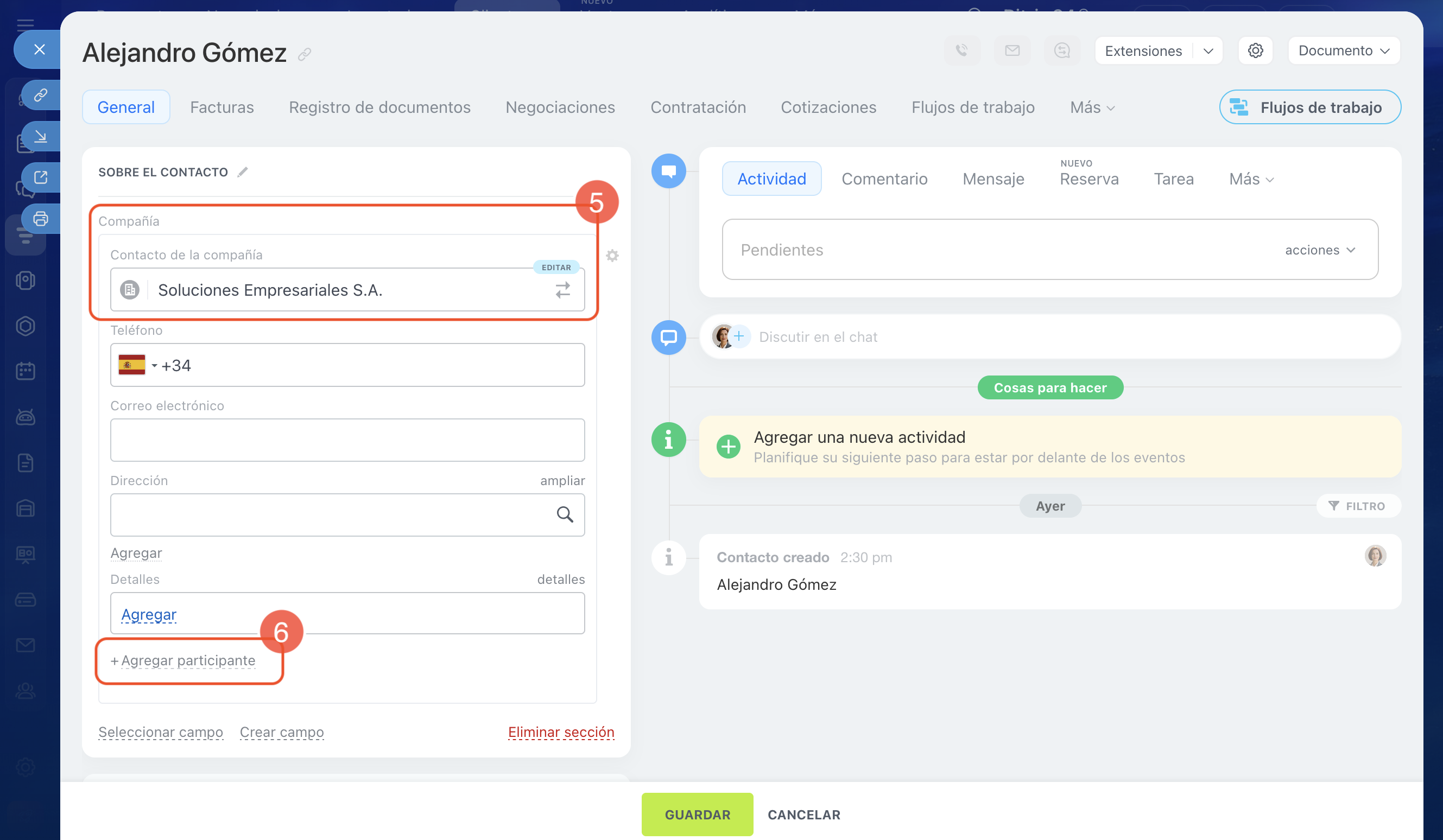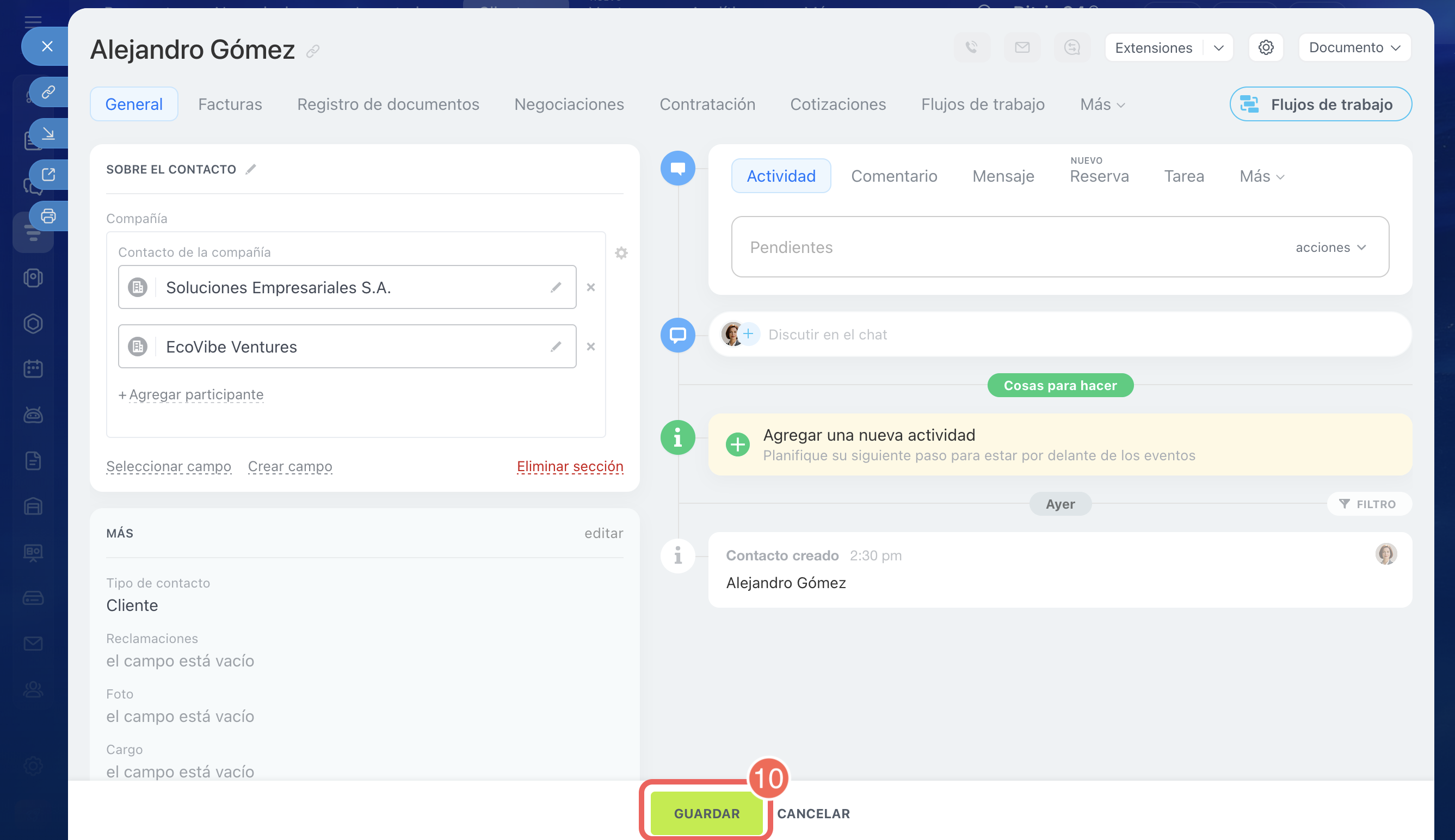 10. Cuando hayas añadido las compañías necesarias, haz clic en Guardar. El contacto se vinculará con las compañías seleccionadas, y en las fichas de estas compañías se completará automáticamente el campo Contacto.