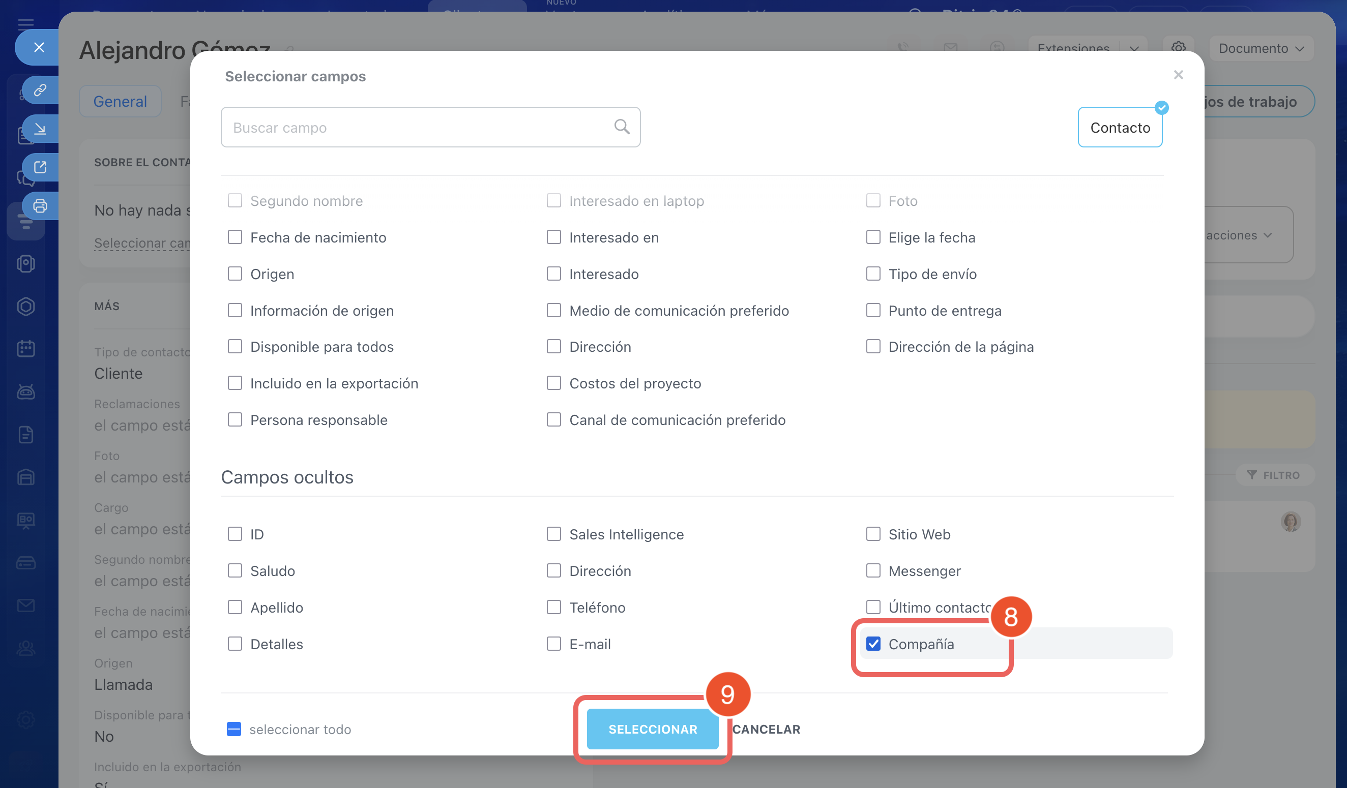 7–9. Si el campo Compañía no se muestra, significa que está oculto. Para restaurarlo, haz clic en Seleccionar campo en cualquier sección de la ficha y busca el campo en la lista o mediante la búsqueda. Márcalo con una casilla y haz clic en Seleccionar.