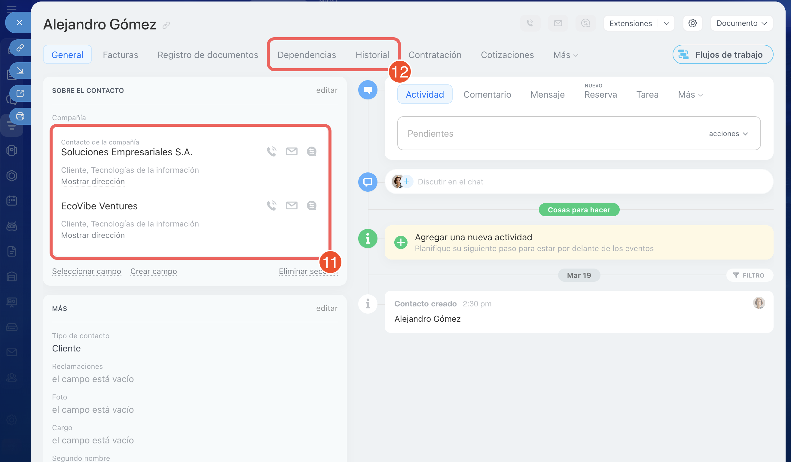 11–12. Para abrir la ficha vinculada, haz clic en su nombre en el campo Compañía o en las pestañas Dependencias e Historial