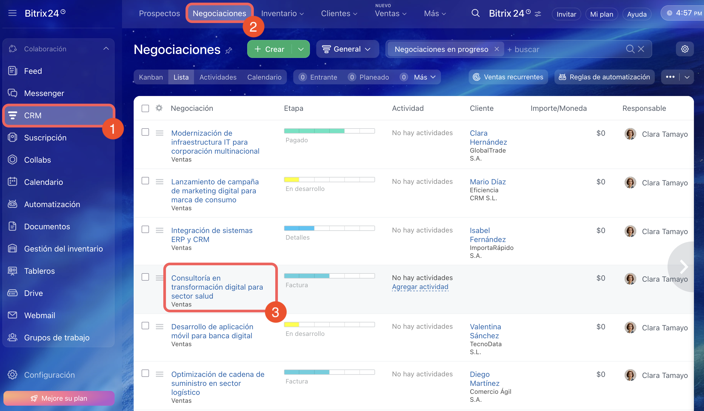 1–3. Ve a CRM > Negociaciones y abre la ficha necesaria.