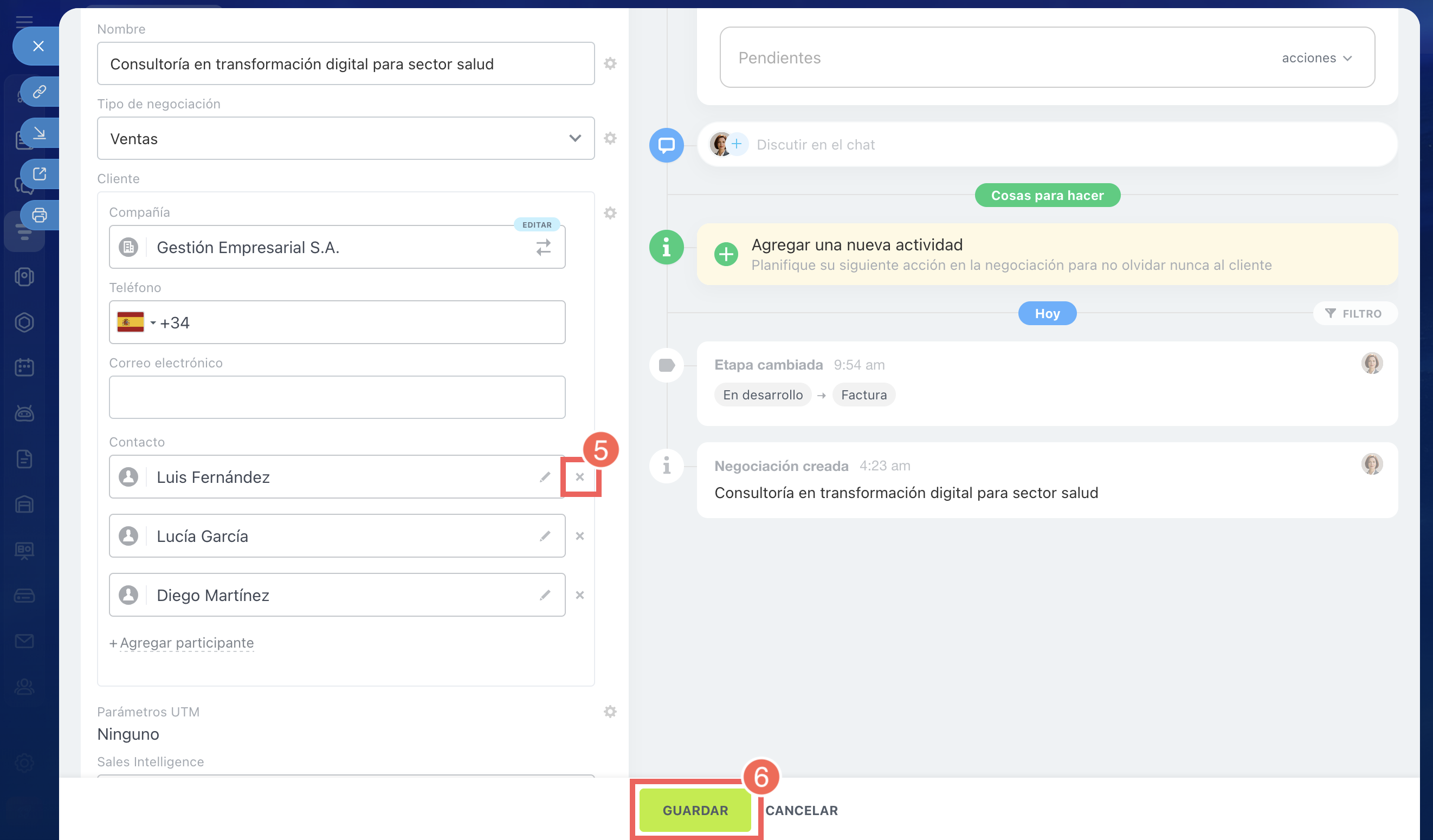 5. Los contactos que se añadieron automáticamente junto con la compañía pueden eliminarse de la negociación: haz clic en la cruz junto al nombre.