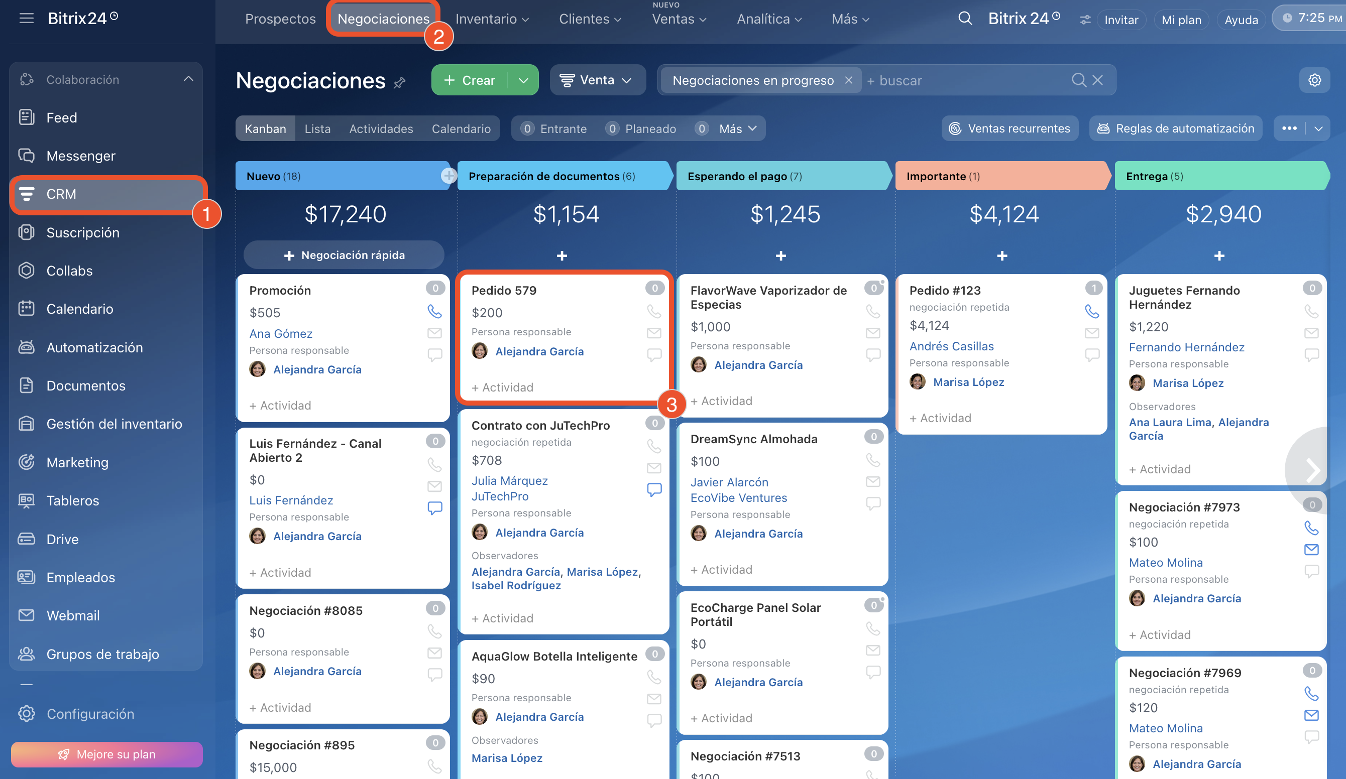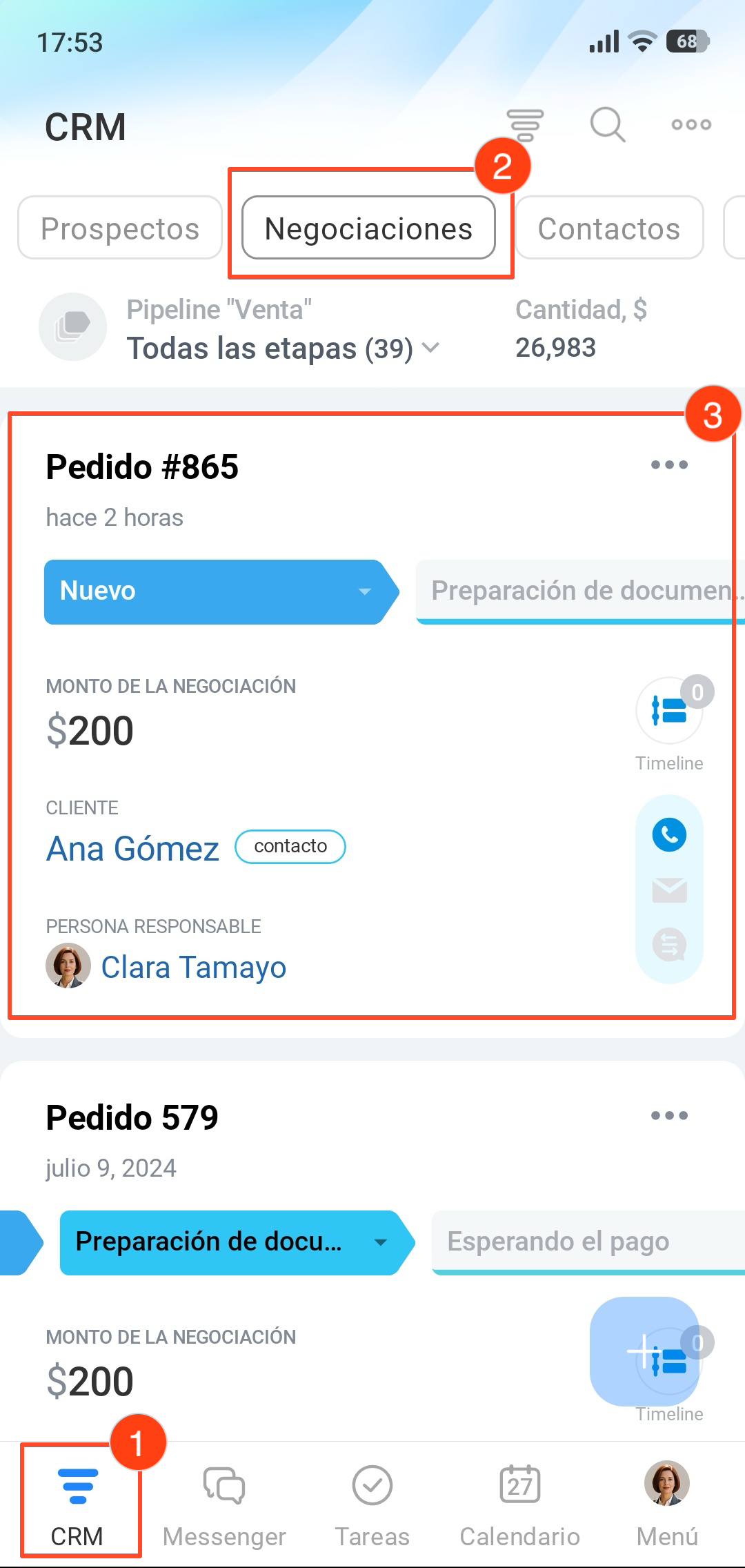 1–3. Ve a CRM > Negociaciones y abre la ficha necesaria.