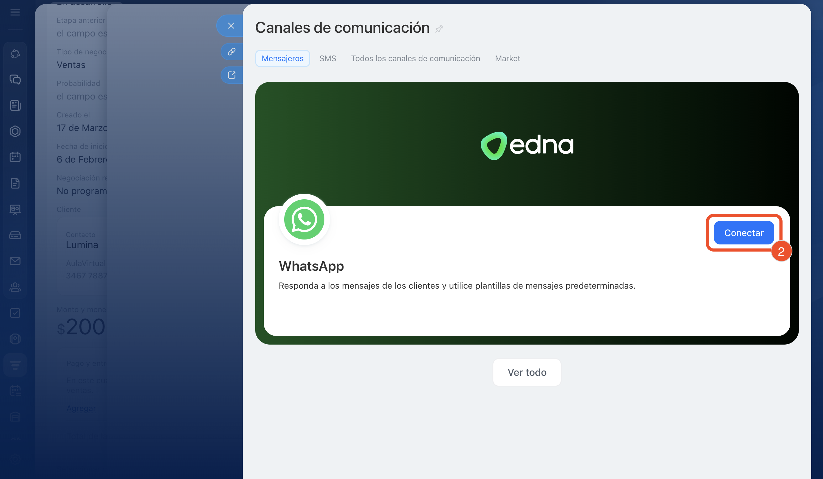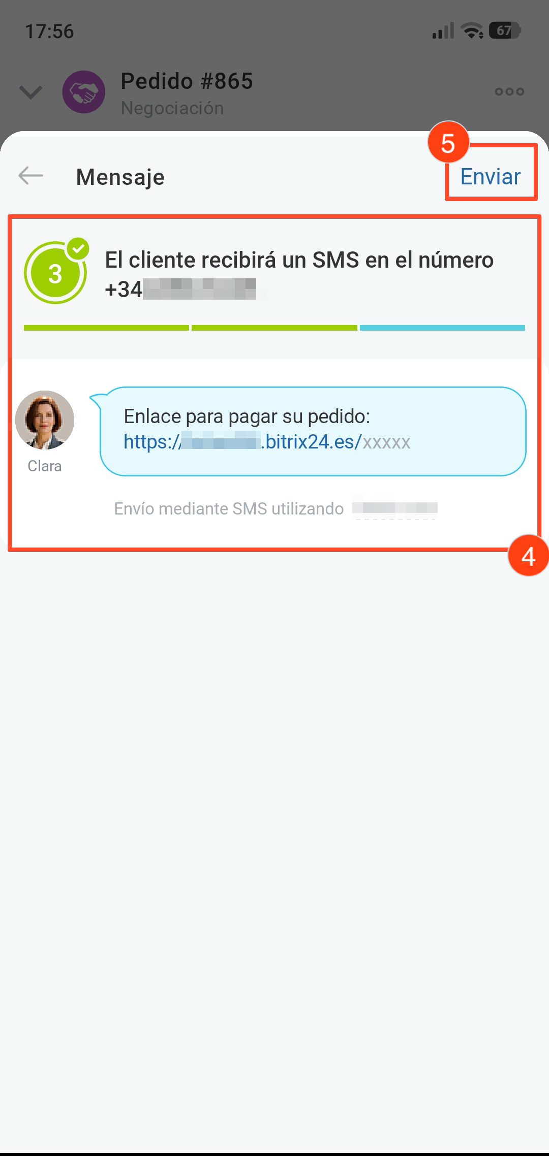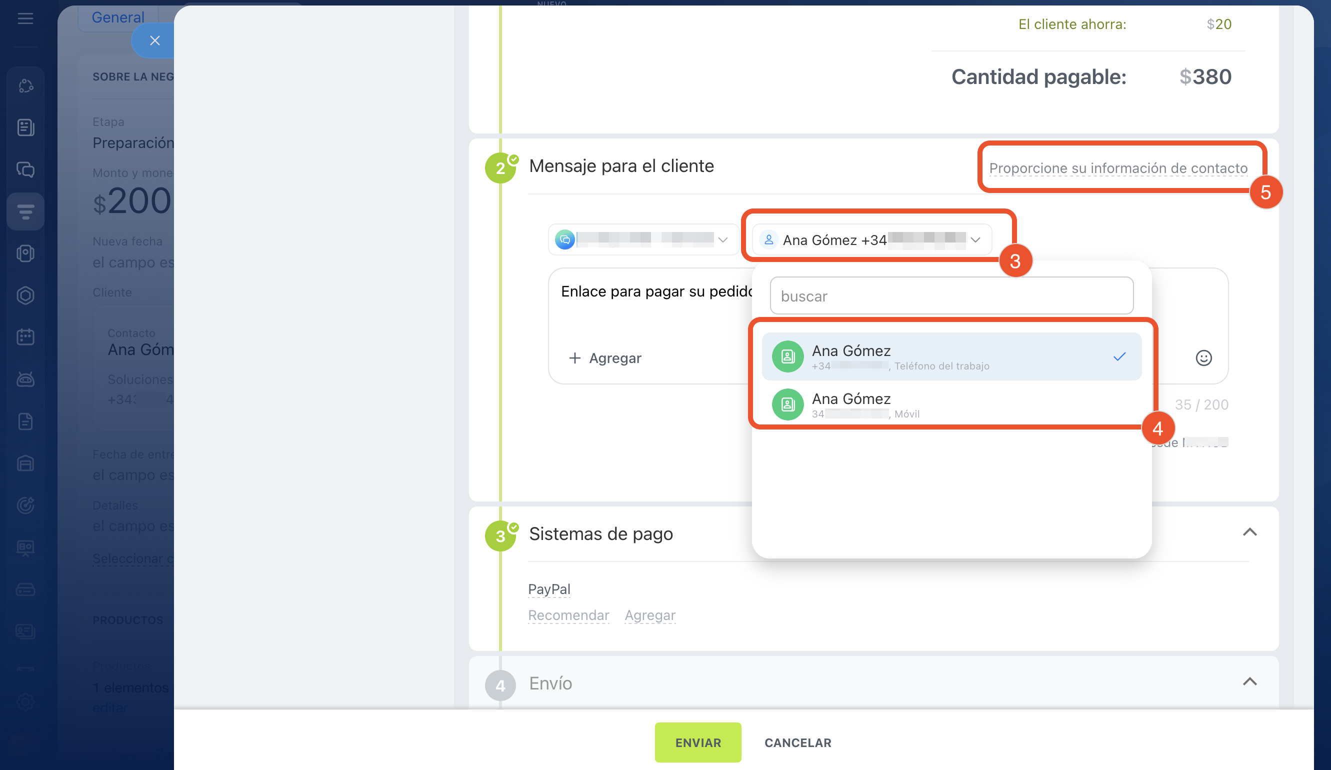 3–4. El campo con los datos de contacto se completa automáticamente: desde la negociación se insertan el nombre del cliente y el número de teléfono utilizado en la última comunicación. Si necesitas enviar el mensaje a otro número, abre la lista y selecciona el adecuado.