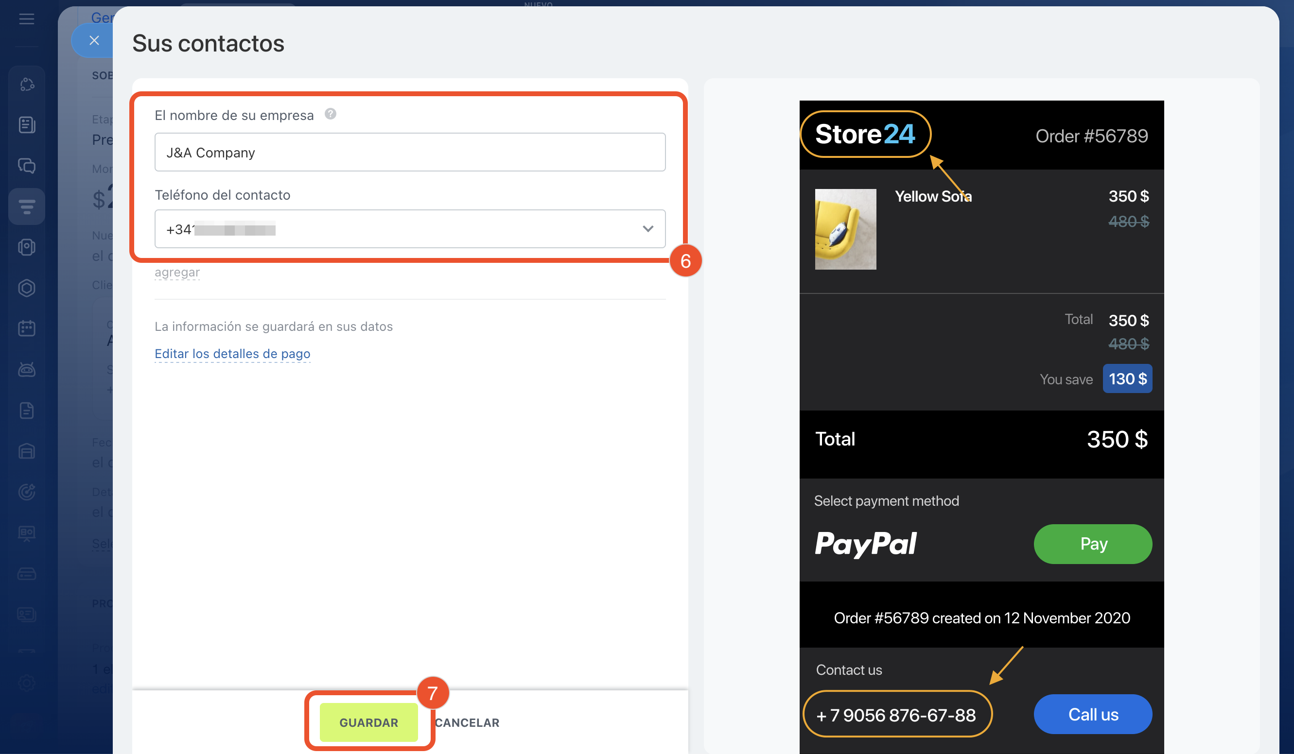 5–7. Haz clic en Proporcione su información de contacto para configurar la información que el cliente verá en la página de pago. En el slider puedes seleccionar el número de teléfono y cambiar el nombre de la empresa: los datos se guardarán en tus datos de empresa. Guarda los cambios.