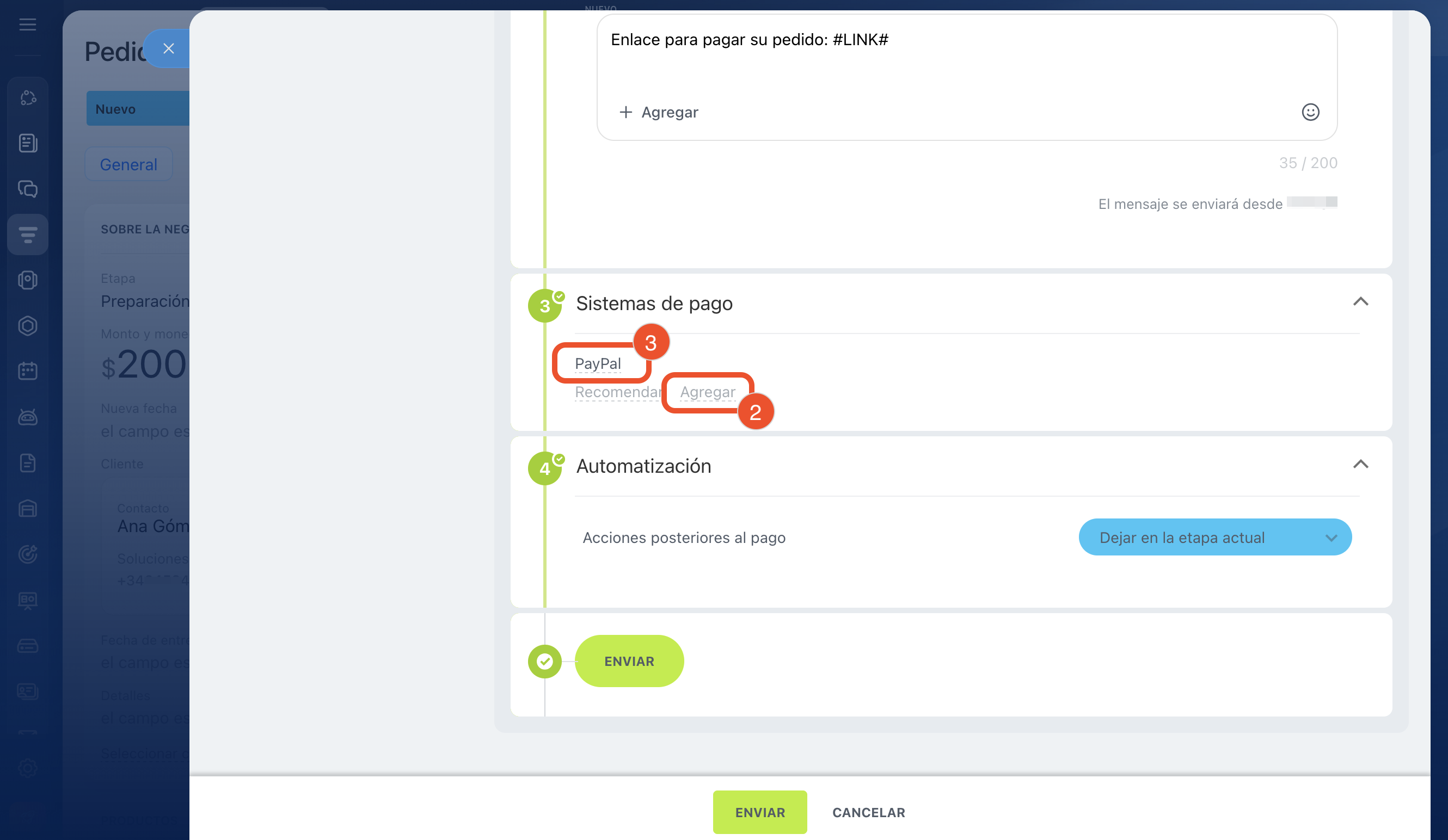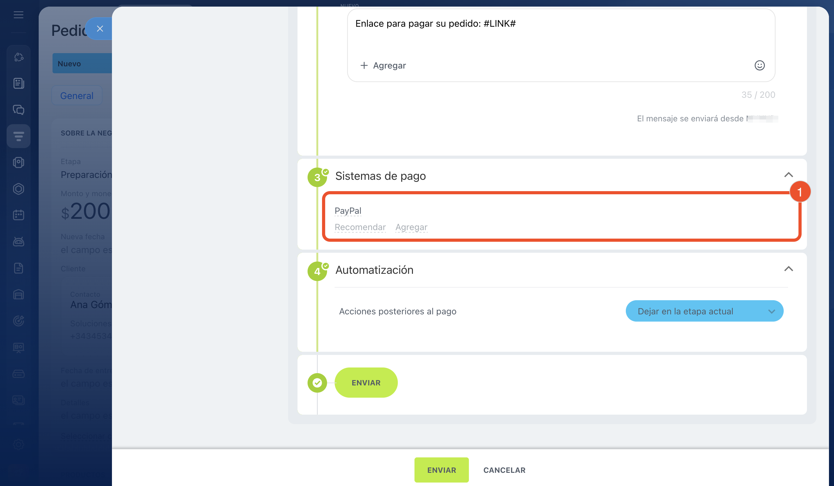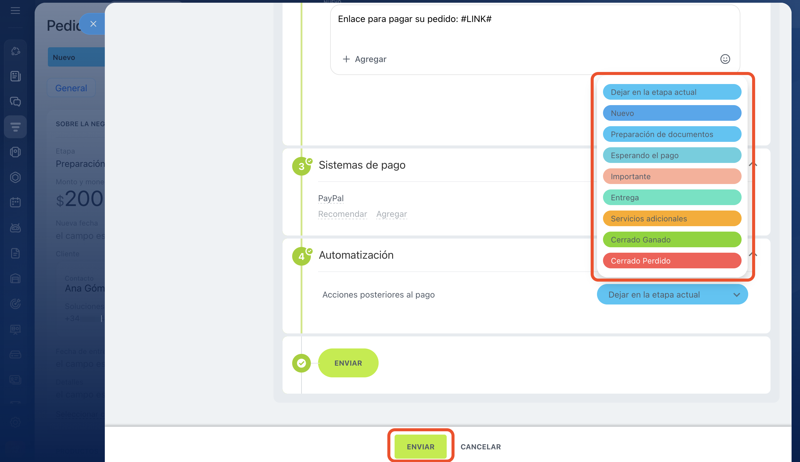 Automatización. Elige a qué etapas se moverá automáticamente la negociación después del pago, para no mover la ficha manualmente. Por defecto, la ficha permanece en la etapa actual. Haz clic en Enviar.