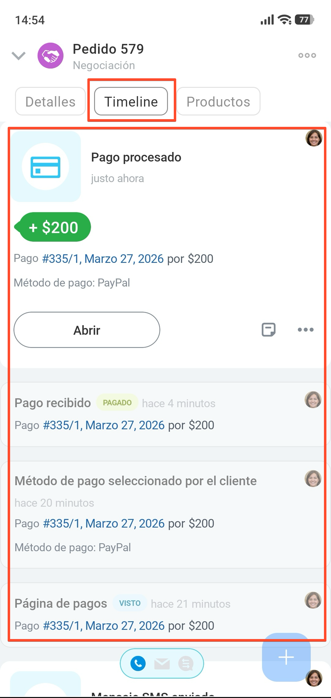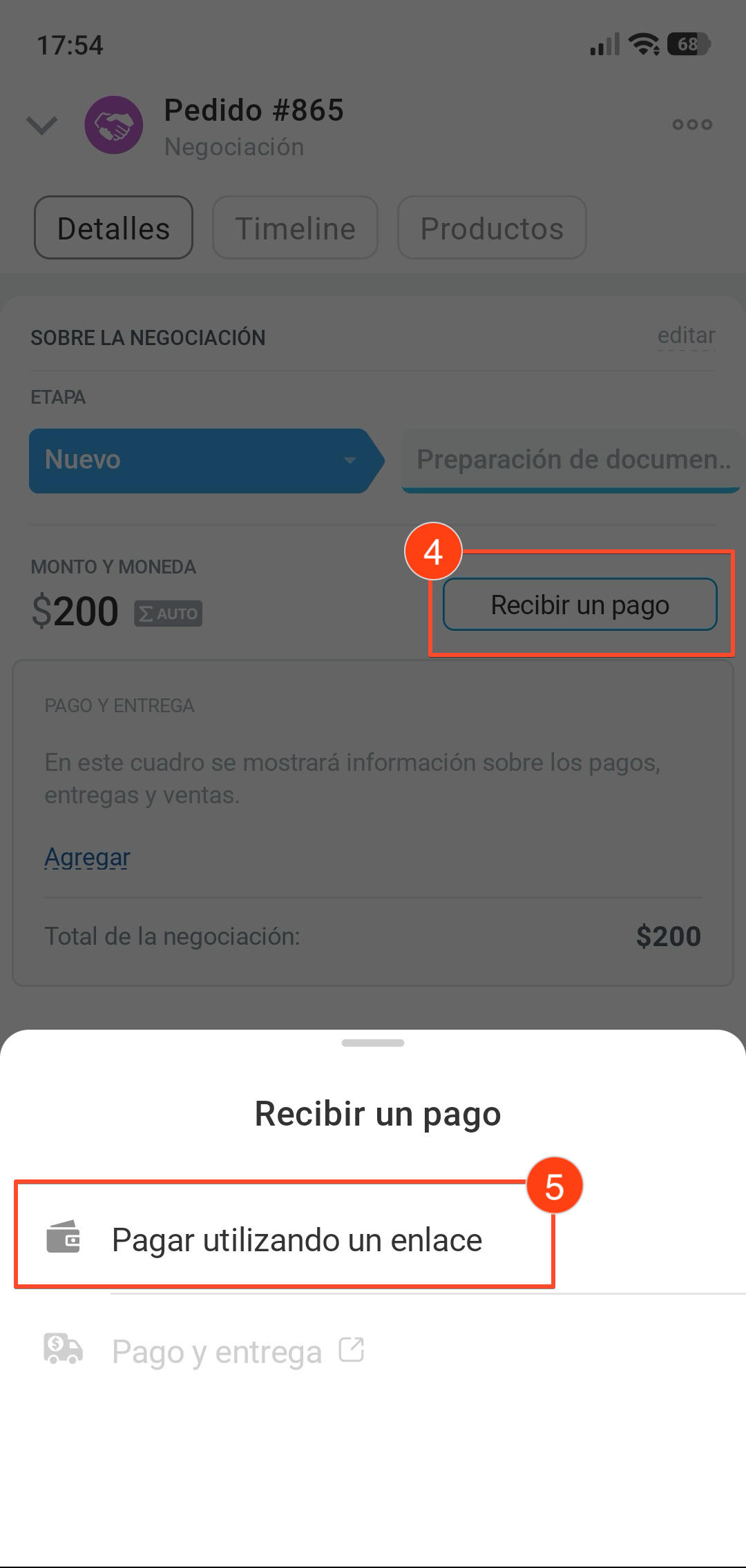 La información sobre el mensaje y el pago se guardará en el timeline de la negociación. Si el cliente no recibió el enlace de pago, envíalo otra vez: en la actividad del mensaje haz clic en Enviar de nuevo.