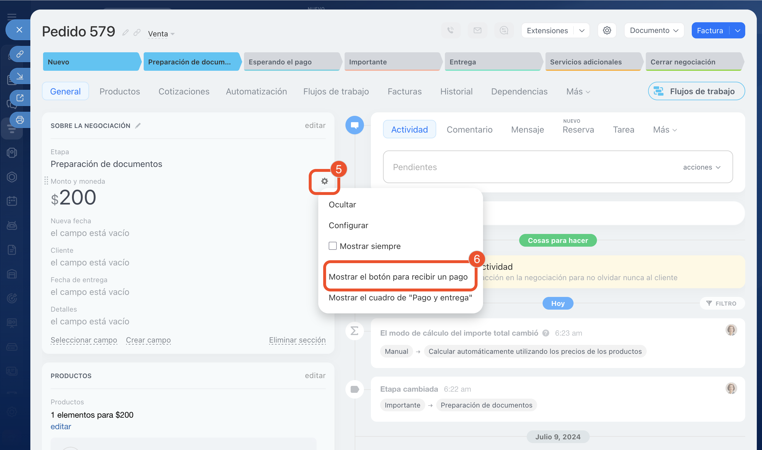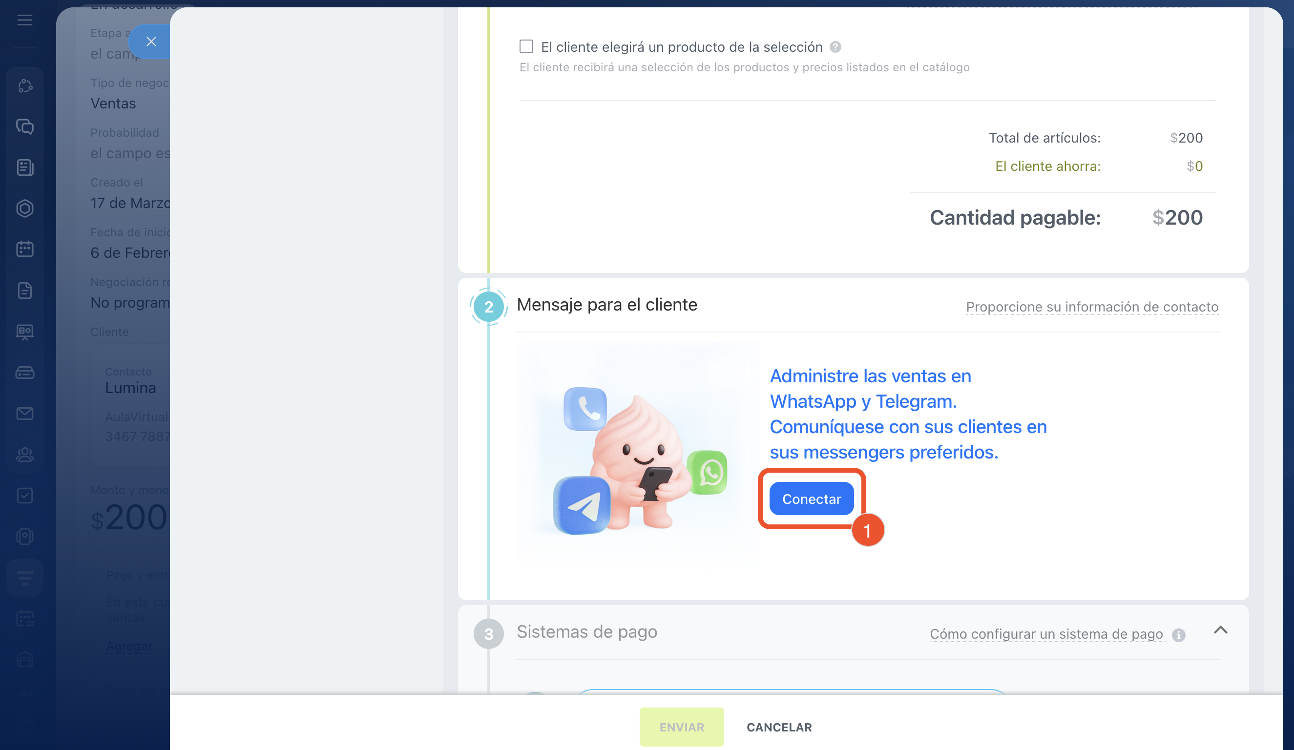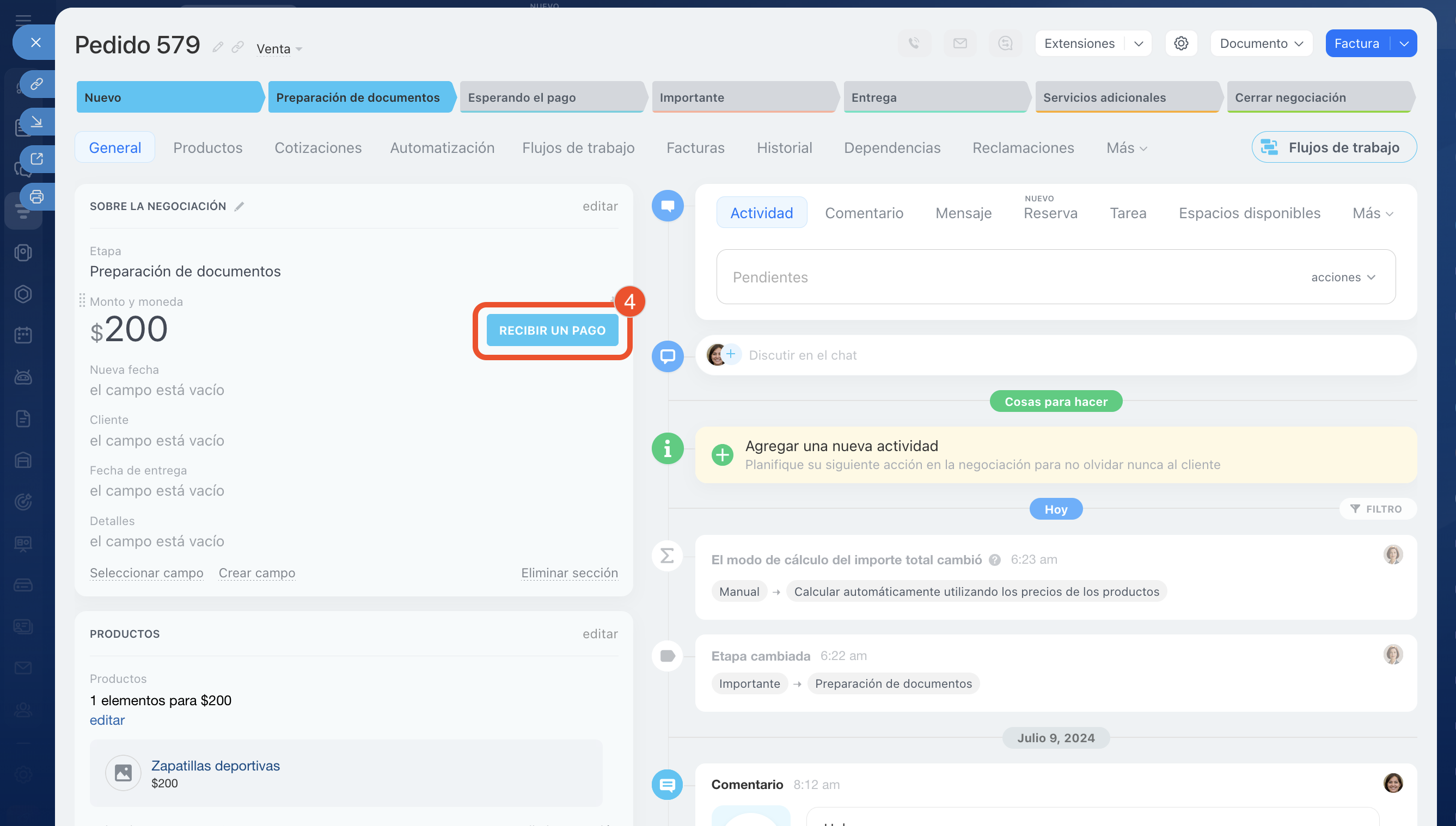 - Para enviar el enlace de pago al cliente, en la ficha de la negociación haz clic en Recibir un pago. Edita la composición del pedido, conecta el canal de comunicación, los sistemas de pago y configura la automatización.