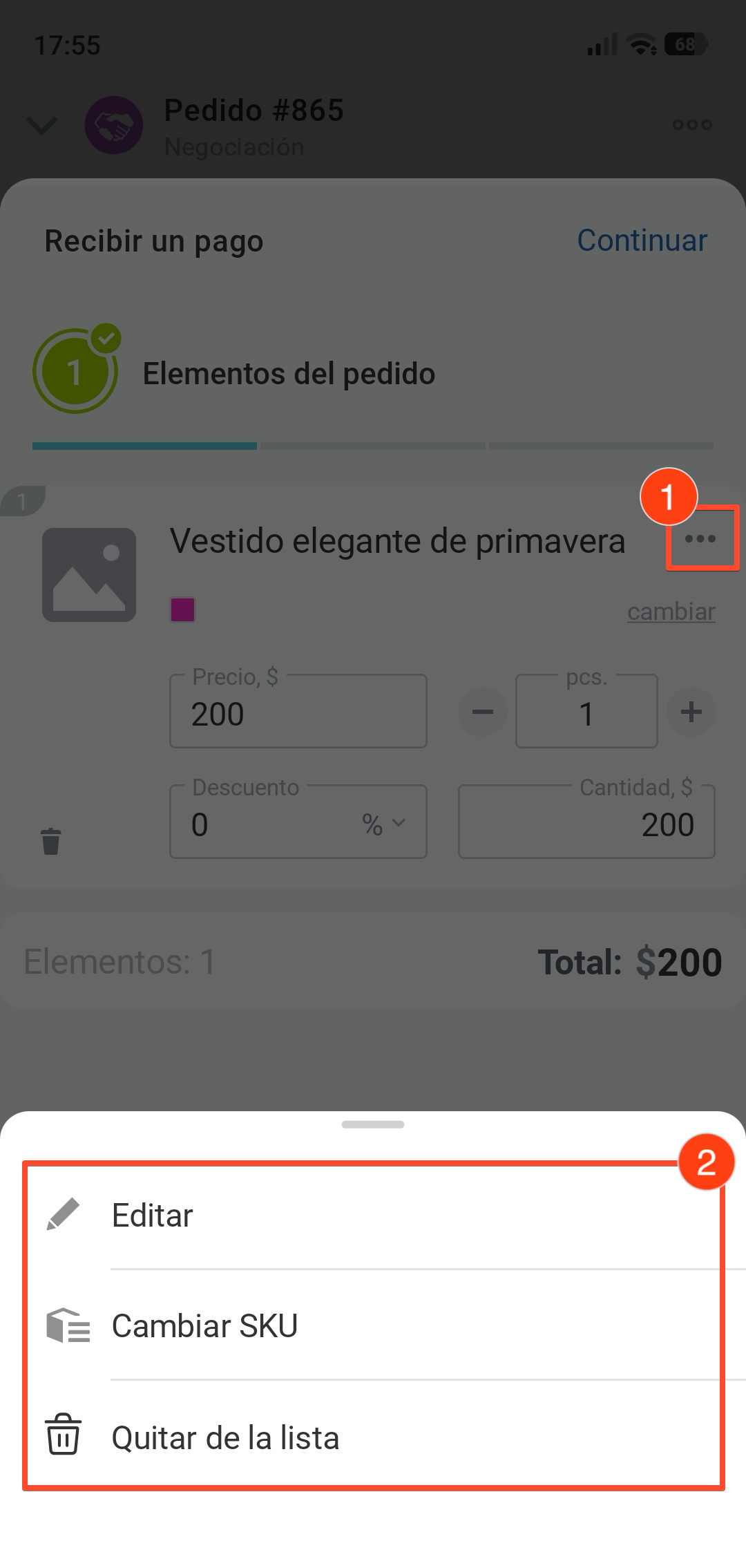 1–2. Pulsa Tres puntos (...) para cambiar la variante, editar o eliminar el producto del pedido.