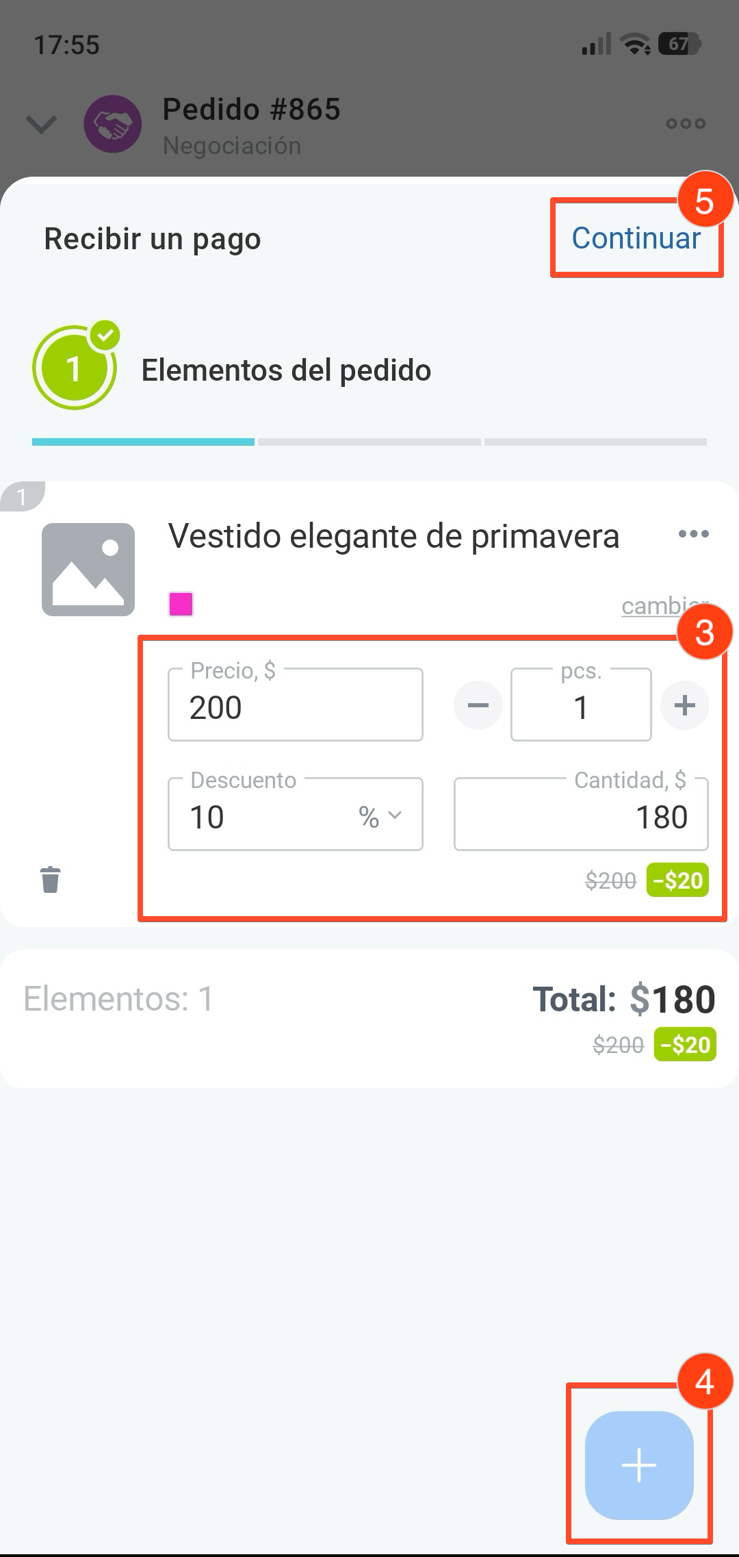 3. Si es necesario, establece un descuento en porcentaje o en moneda, edita la cantidad o el precio del producto. Al cambiar el precio en el pedido, los datos del catálogo de productos no cambian.