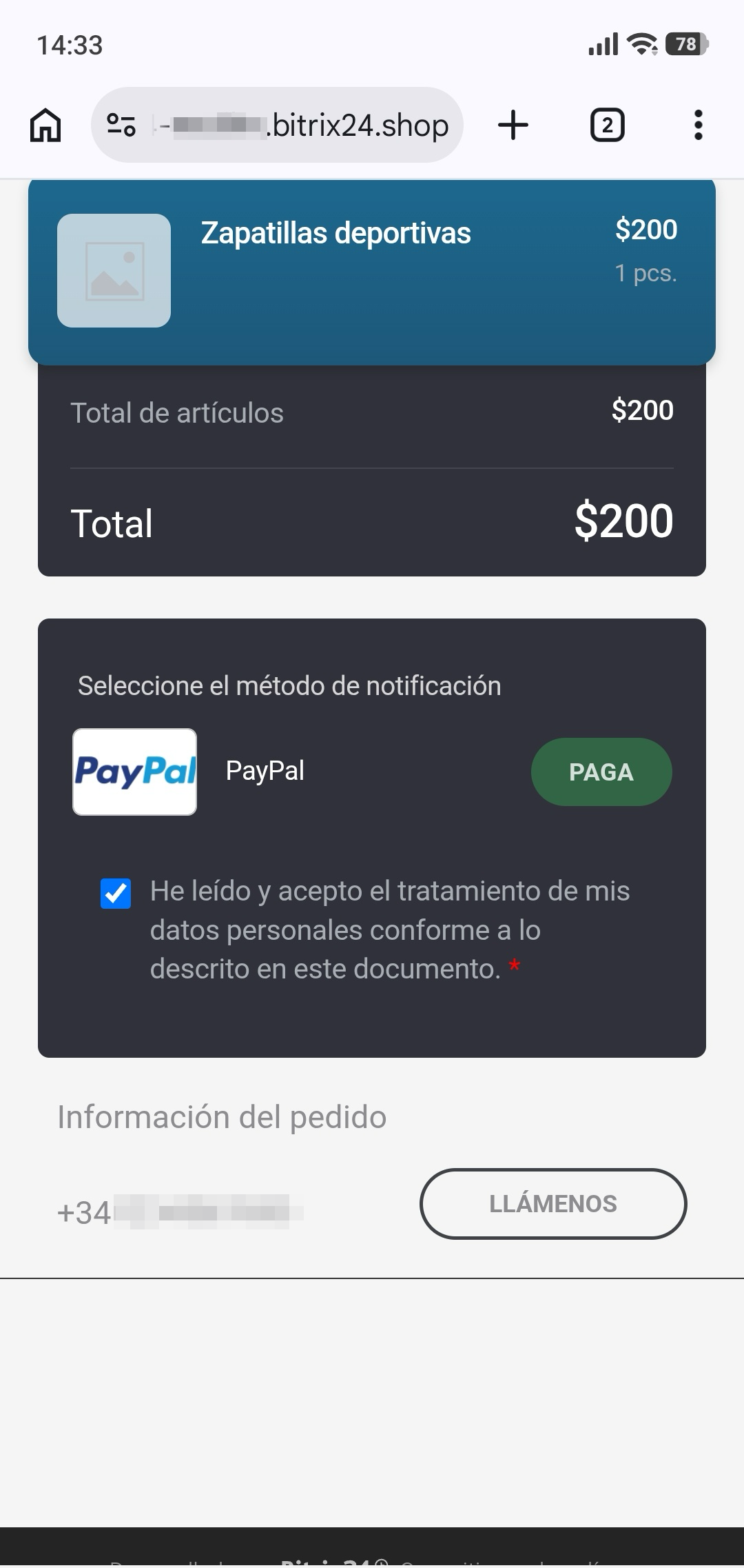 El cliente recibirá un mensaje con un enlace a la página de pago, donde podrá comprobar los detalles del pedido y realizar el pago.