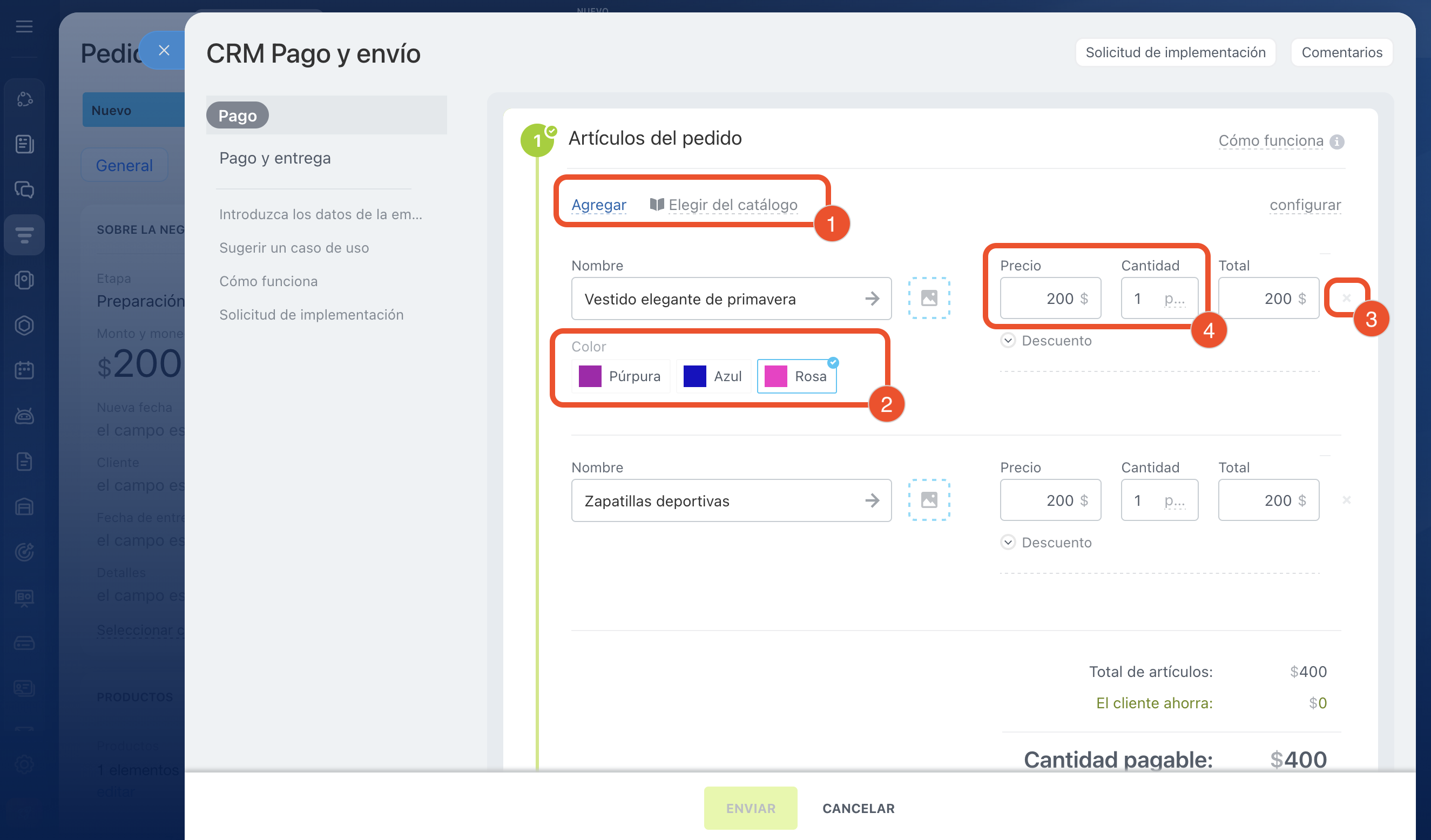 4. Si es necesario, edita la cantidad o el precio. Al cambiar el precio en el pedido, los datos del catálogo de productos no cambian.
