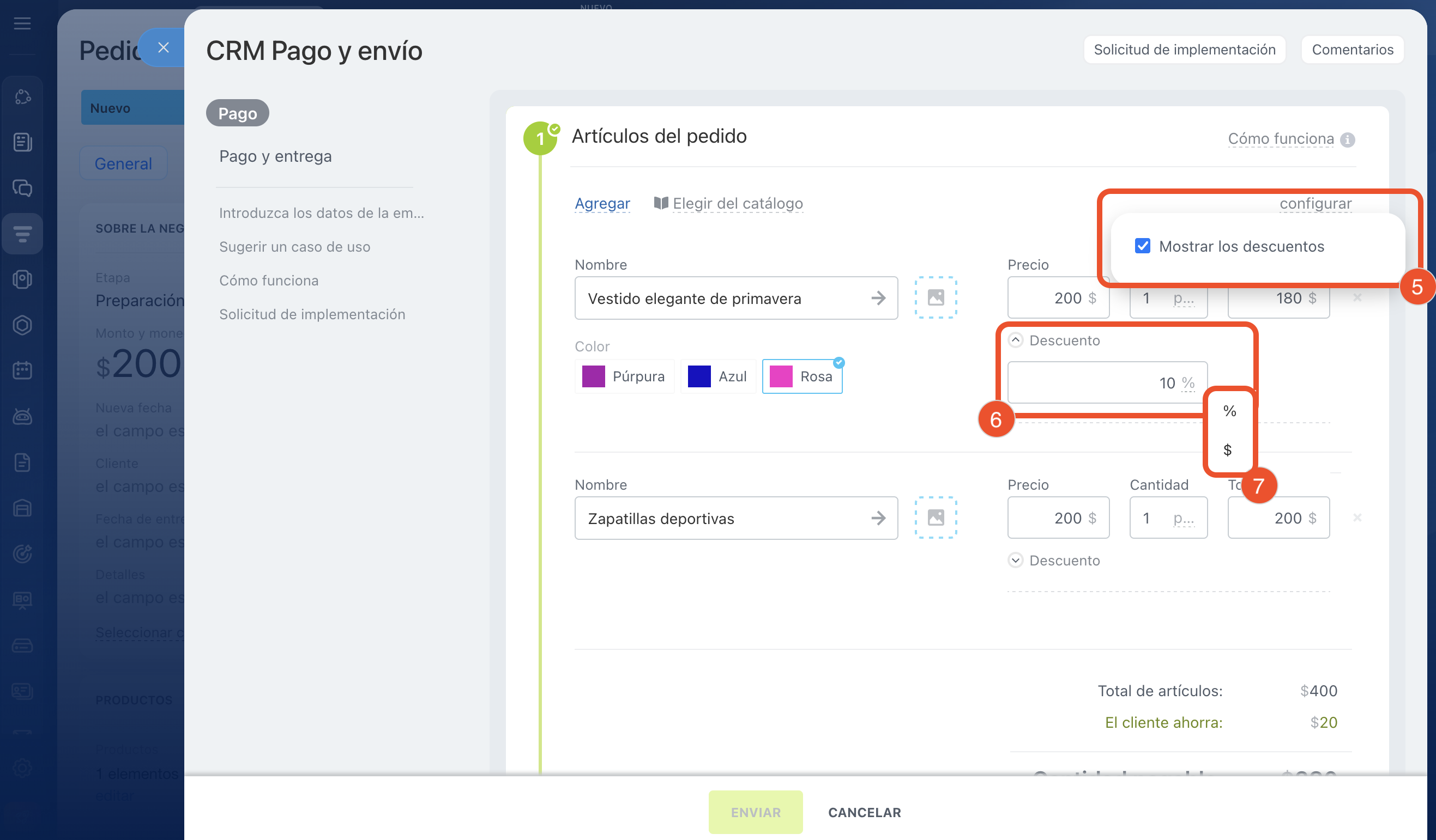 5–7. Para ofrecer un descuento al cliente, haz clic en Configurar en la esquina superior derecha del bloque y activa la opción Mostrar los descuentos. Abre el campo Descuento debajo del precio, selecciona la unidad de medida e indica el valor. Durante el pago, el cliente verá ambas cifras: el precio completo y el precio con descuento.