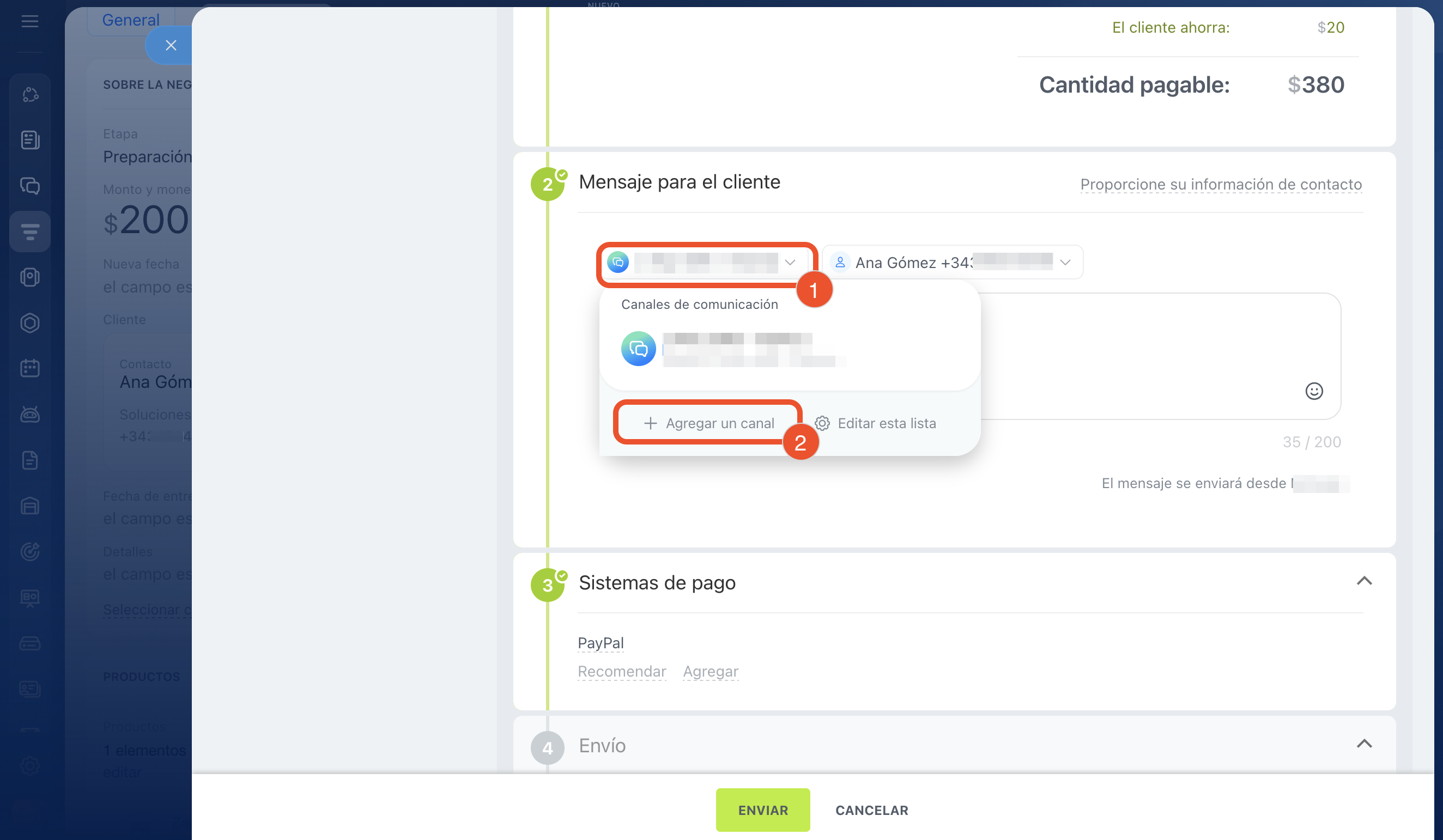 Recibir un pago. Desde este bloque puedes ver a qué número y mediante qué canal de comunicación se enviará el mensaje con el enlace de pago. Por defecto se utiliza el número de teléfono que se usó en la última comunicación con el cliente.