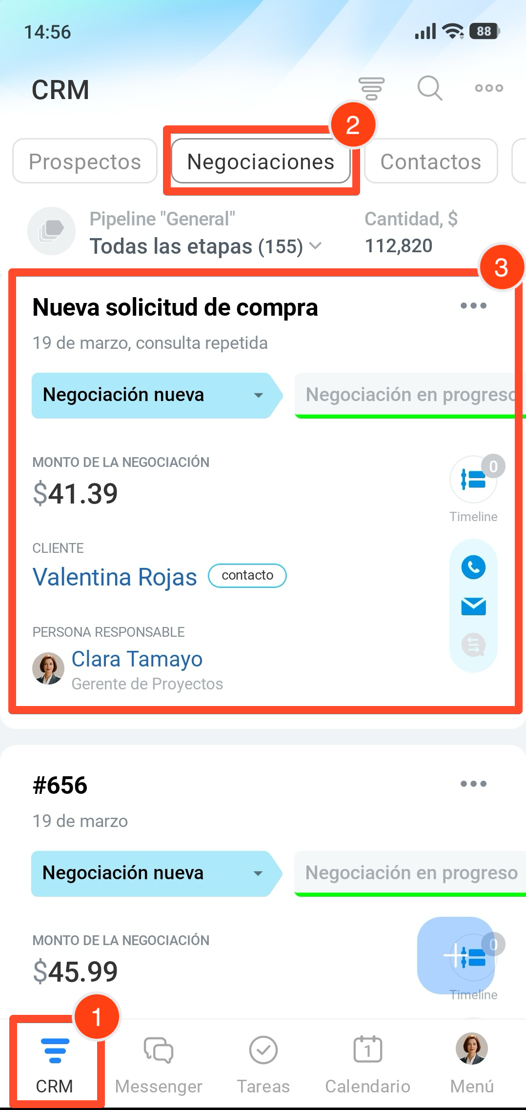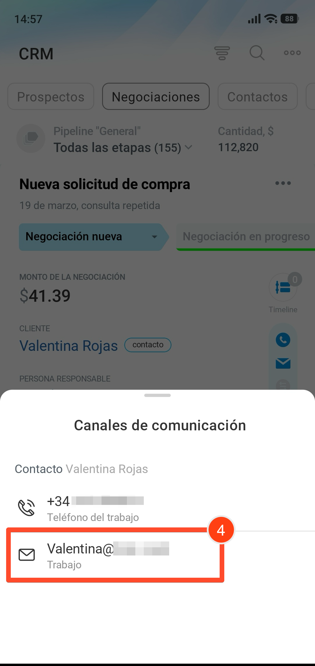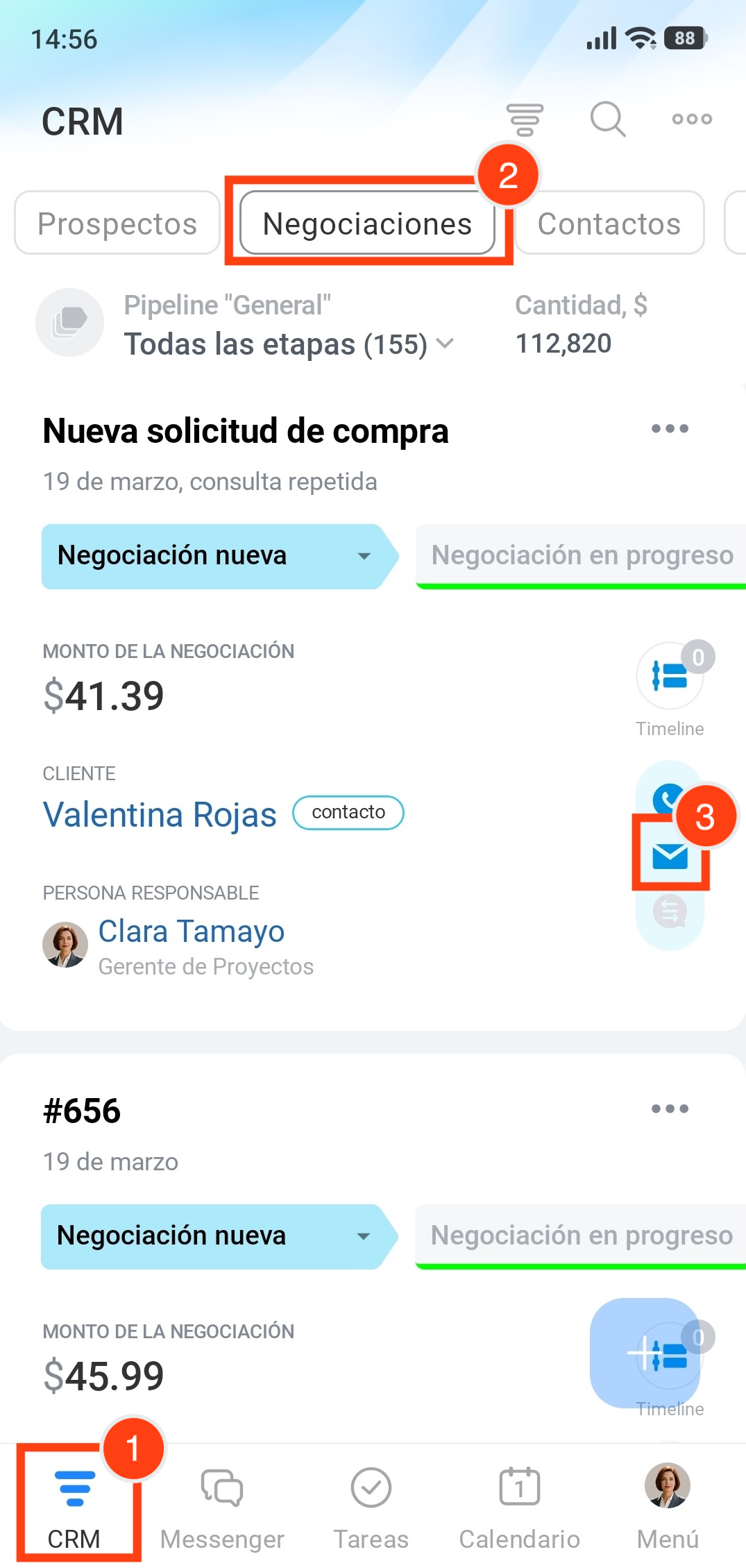 Desde la ficha del CRM. Este método es conveniente si ya estás trabajando con la ficha y quieres ver todo el historial de comunicación con el cliente.