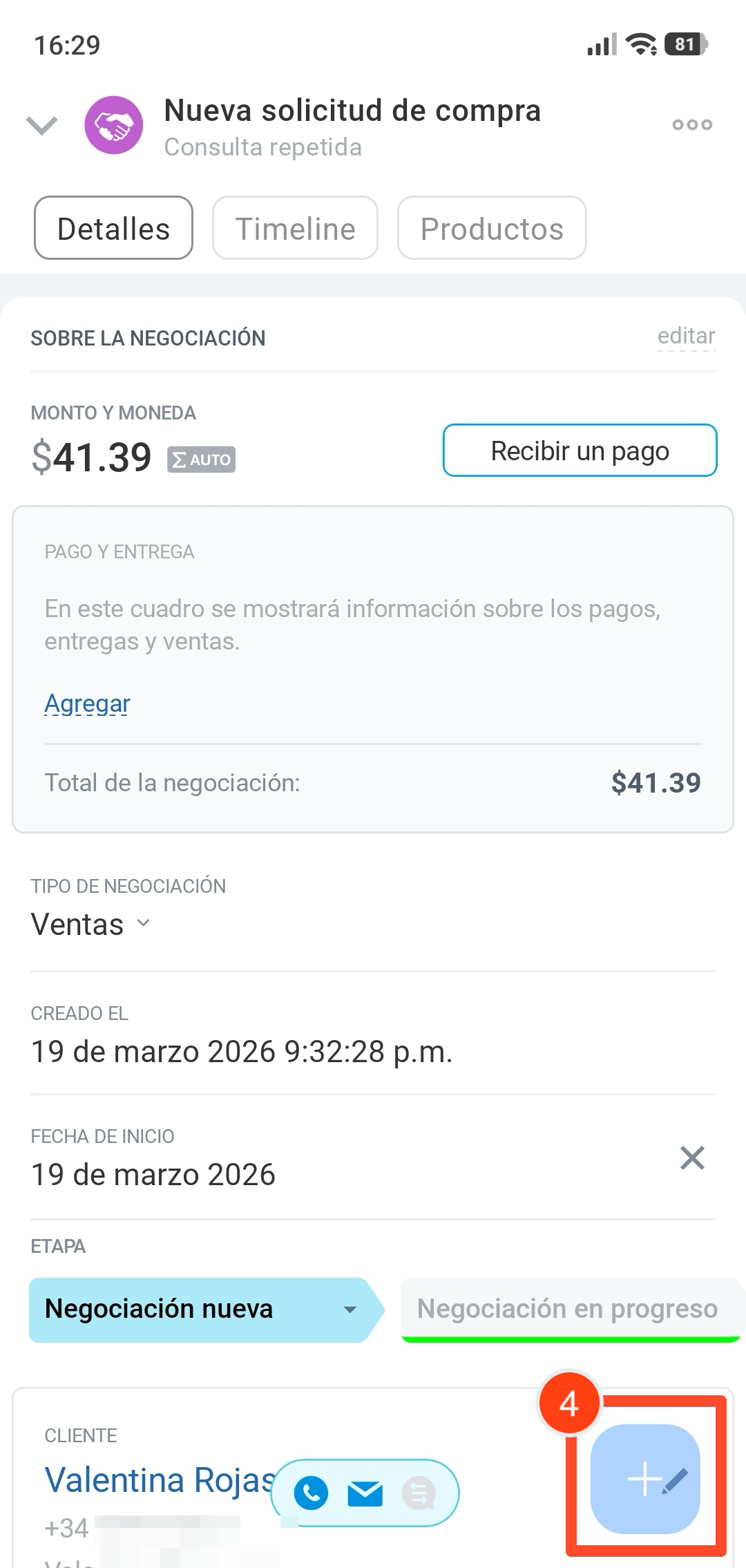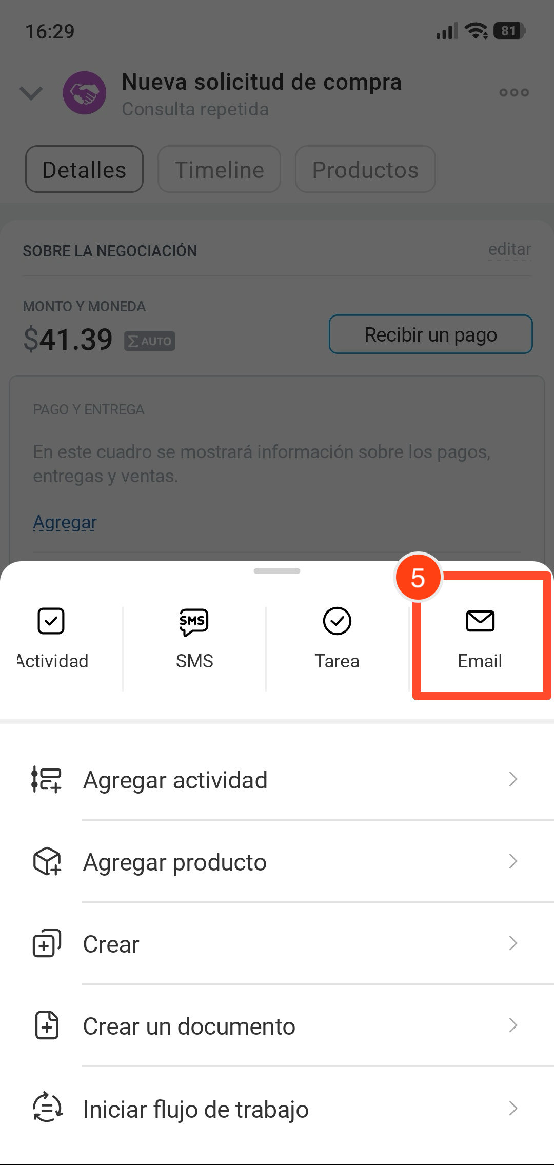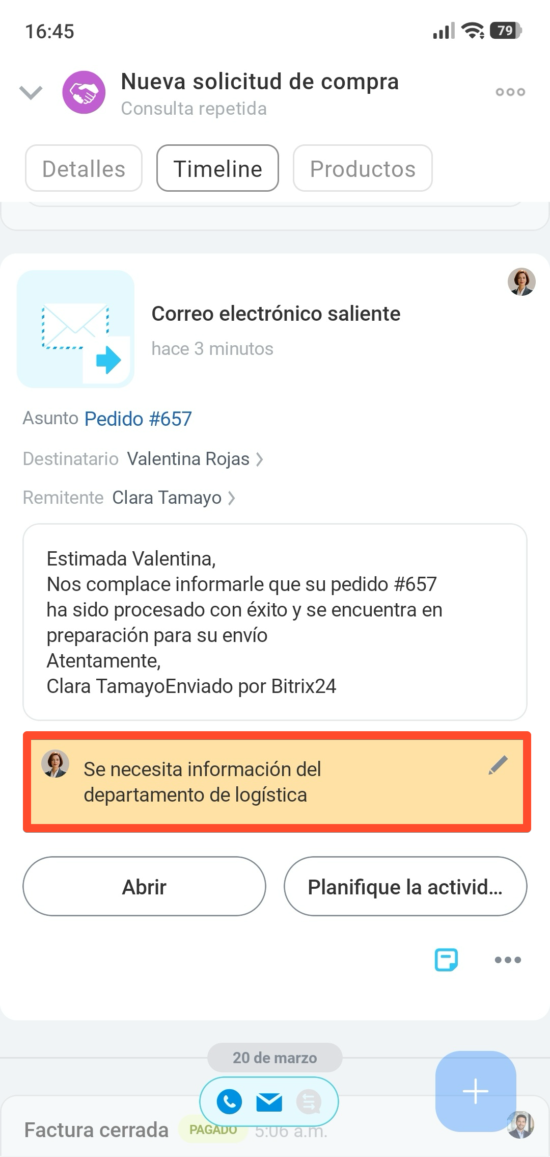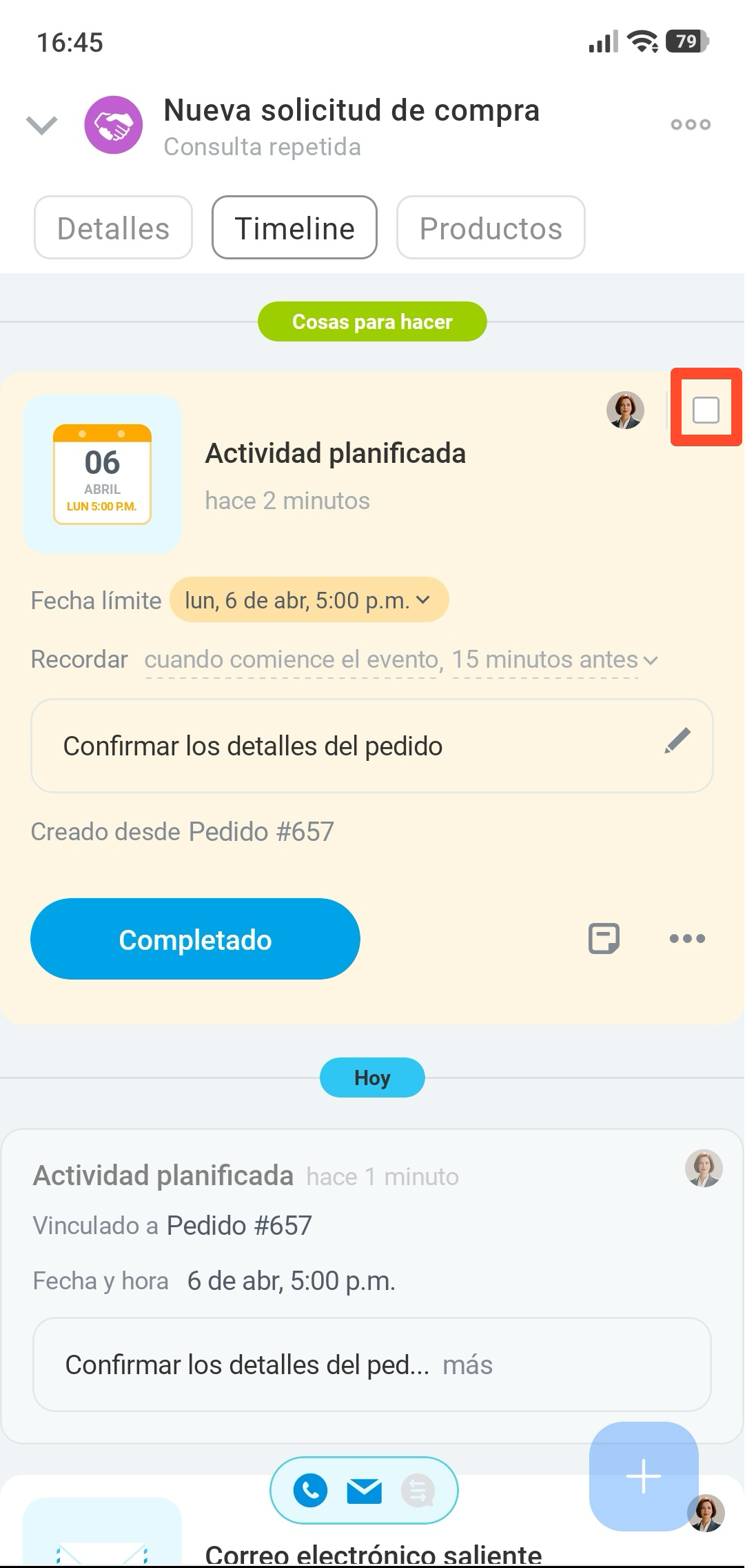 Desde la ficha del CRM. Este método es conveniente si ya estás trabajando con la ficha y quieres ver todo el historial de comunicación con el cliente.