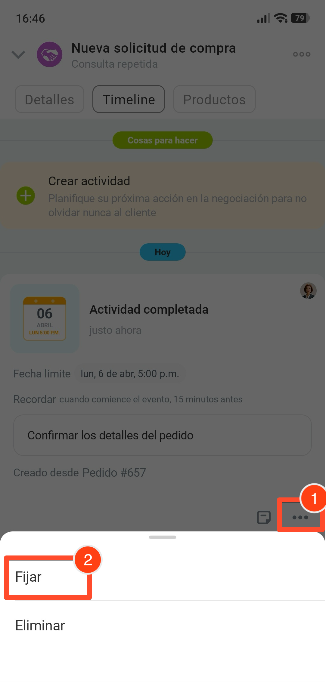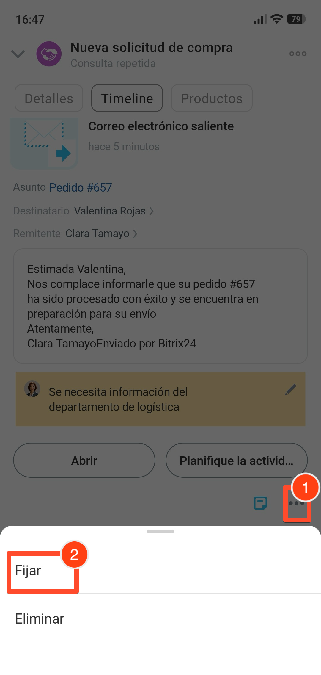 En el timeline, en los registros del correo o la actividad, pulsa Tres puntos (...) > Fijar.