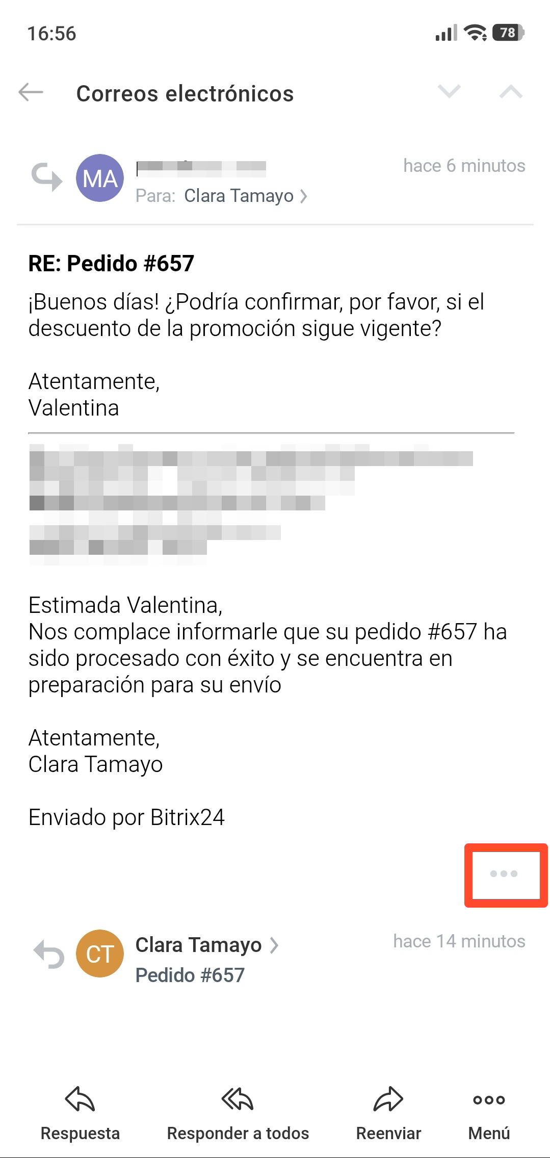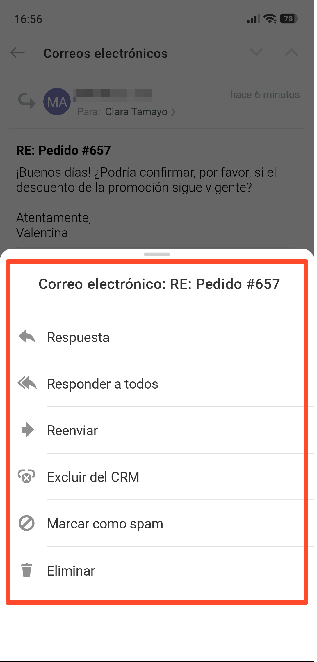 - Desde un correo entrante puedes responder o reenviar el mensaje, así como marcarlo como spam, excluirlo del CRM o eliminarlo.
