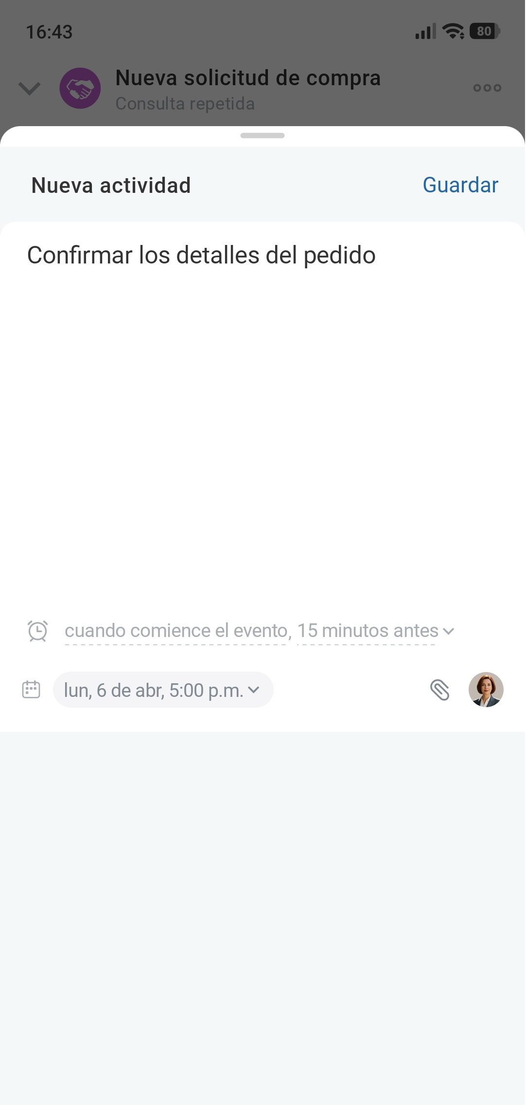Los correos entrantes y salientes se pueden fijar en la ficha del CRM, añadir una nota o una actividad al correo. Por ejemplo, después de enviar una cotización por correo, puedes planificar una llamada y confirmar la decisión del cliente.