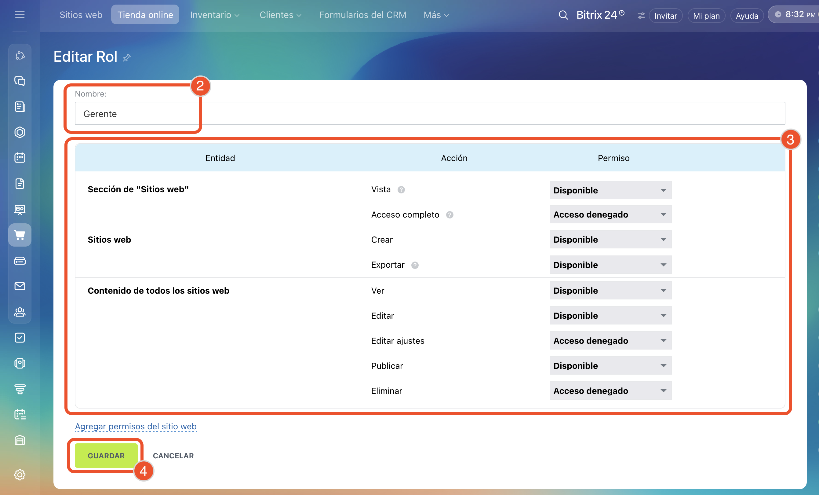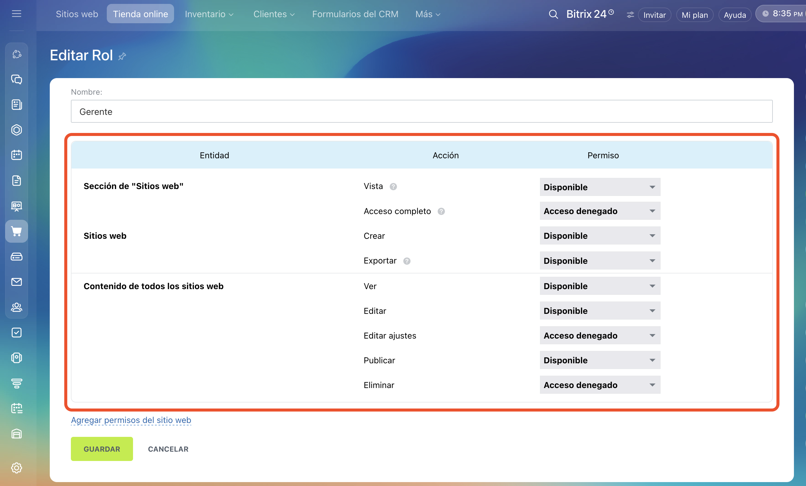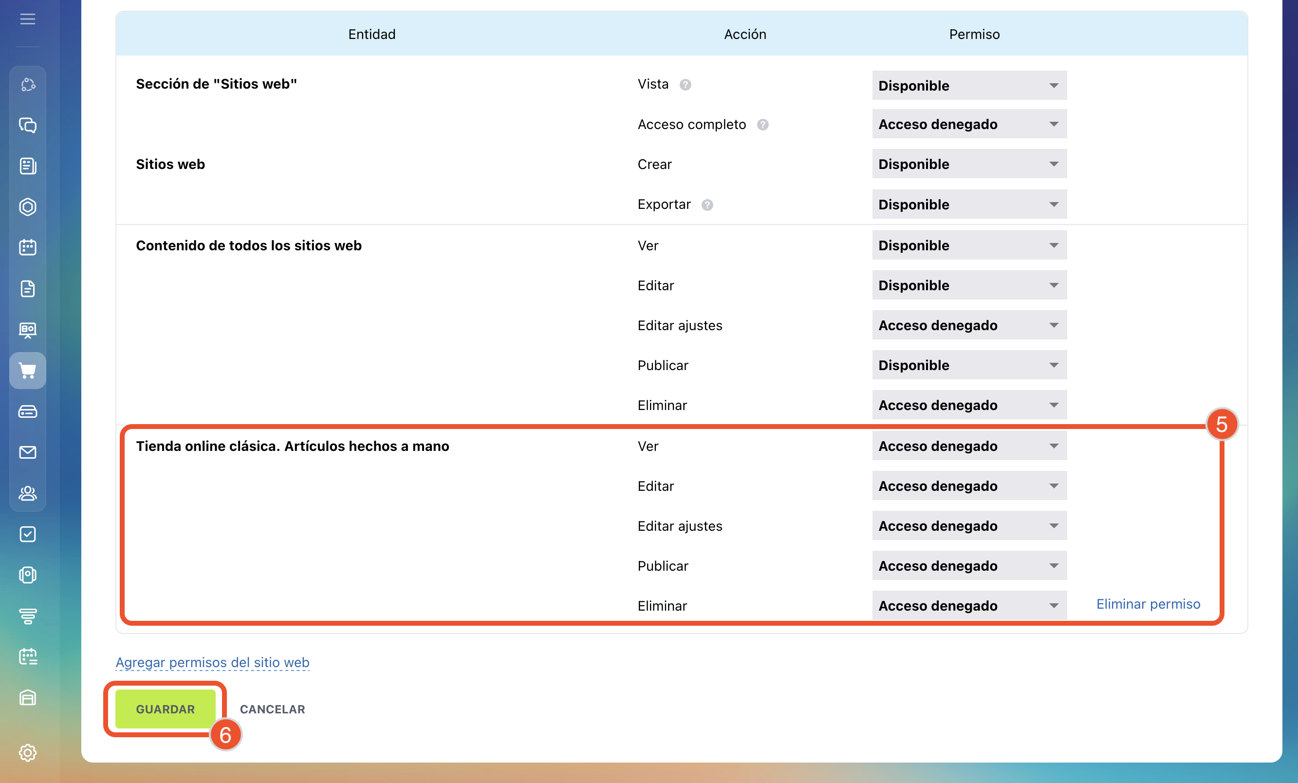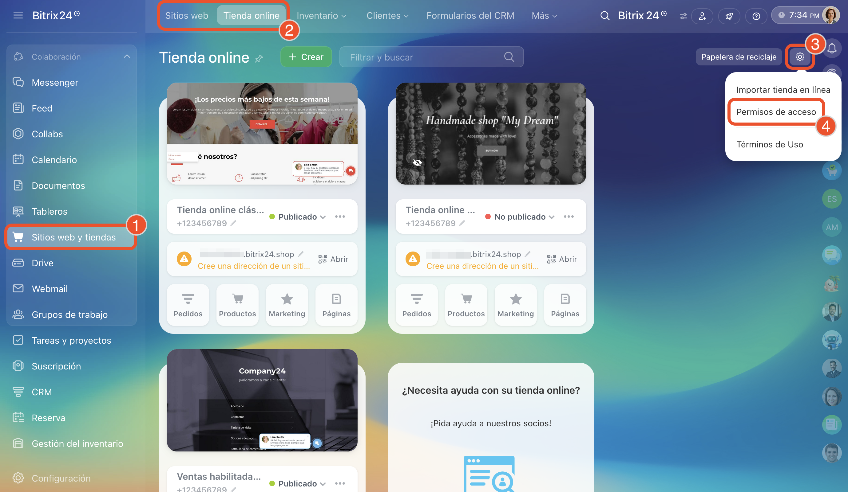 - Los permisos de acceso para sitios y tiendas online son comunes. Si los cambias en la sección Sitios web, también se aplicarán a la sección Tienda online.