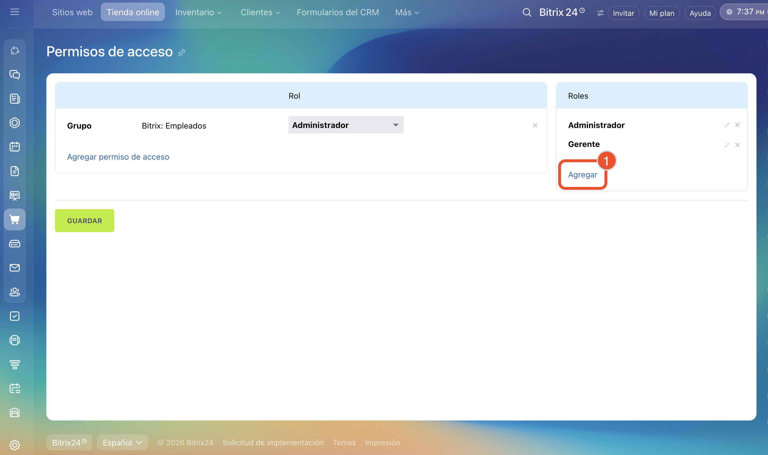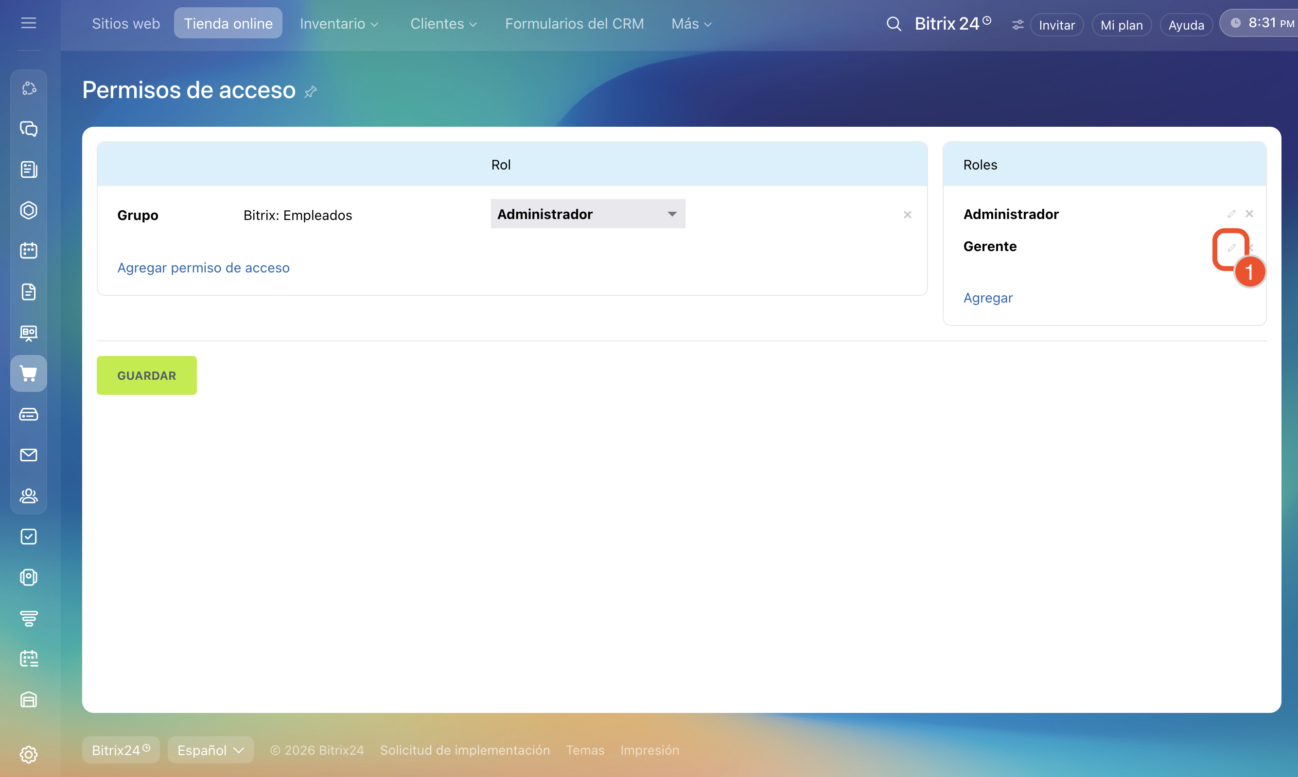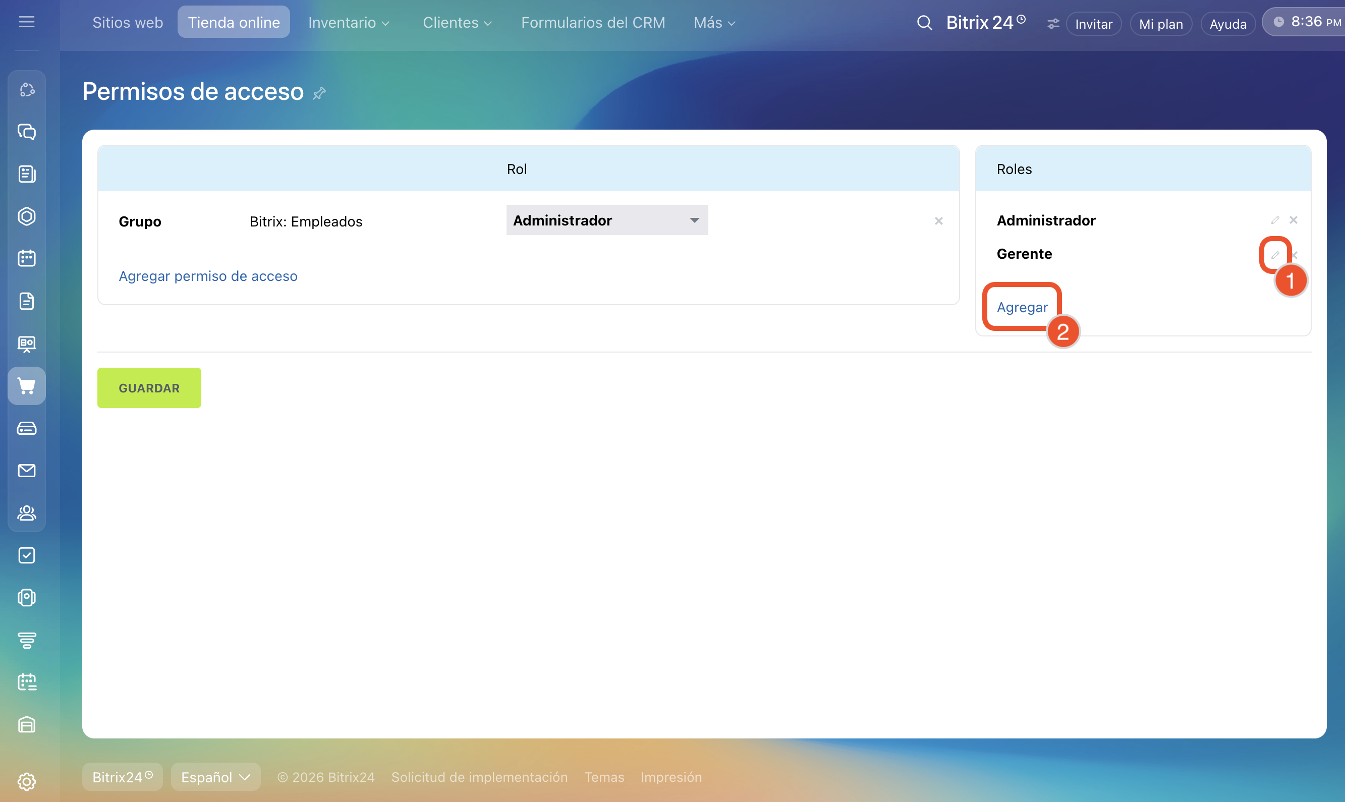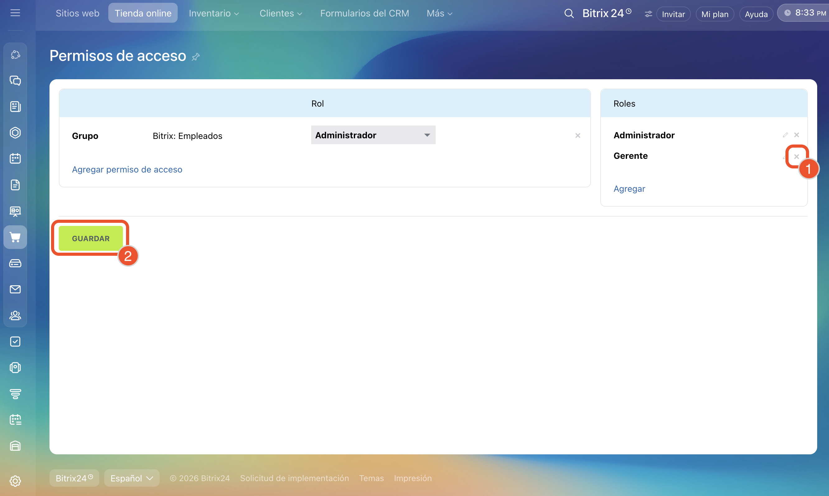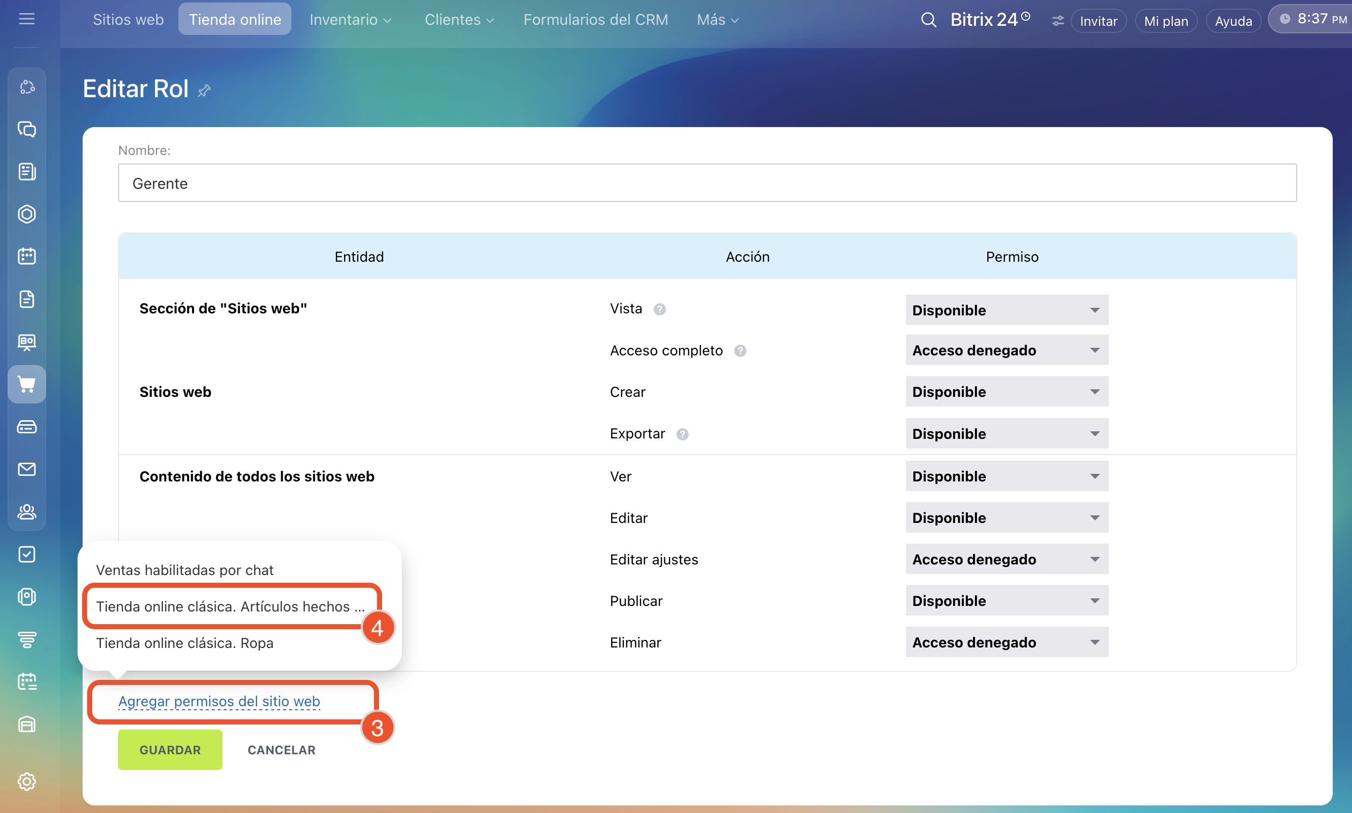 - Los permisos de acceso para sitios y tiendas online son comunes. Si los cambias en la sección Sitios web, también se aplicarán a la sección Tienda online.