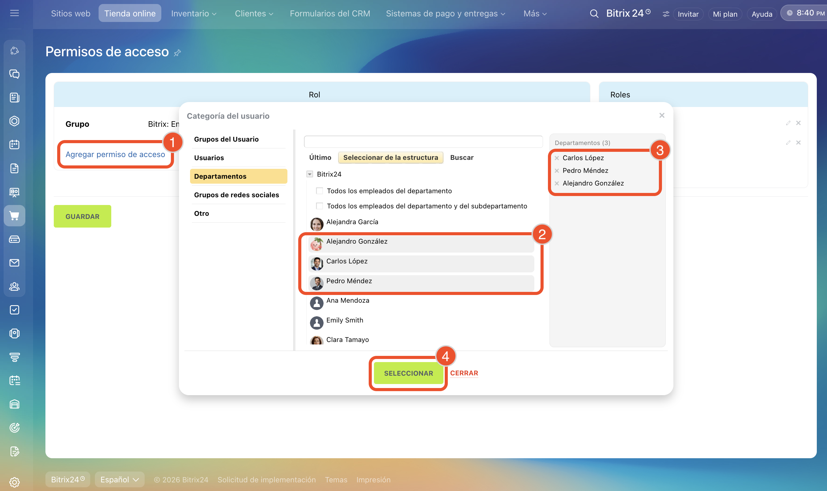 1–4. Haz clic en Agregar permiso de acceso. Selecciona un empleado, departamento o grupo; aparecerán en la lista a la derecha. Haz clic en Seleccionar para pasar a la selección de roles.