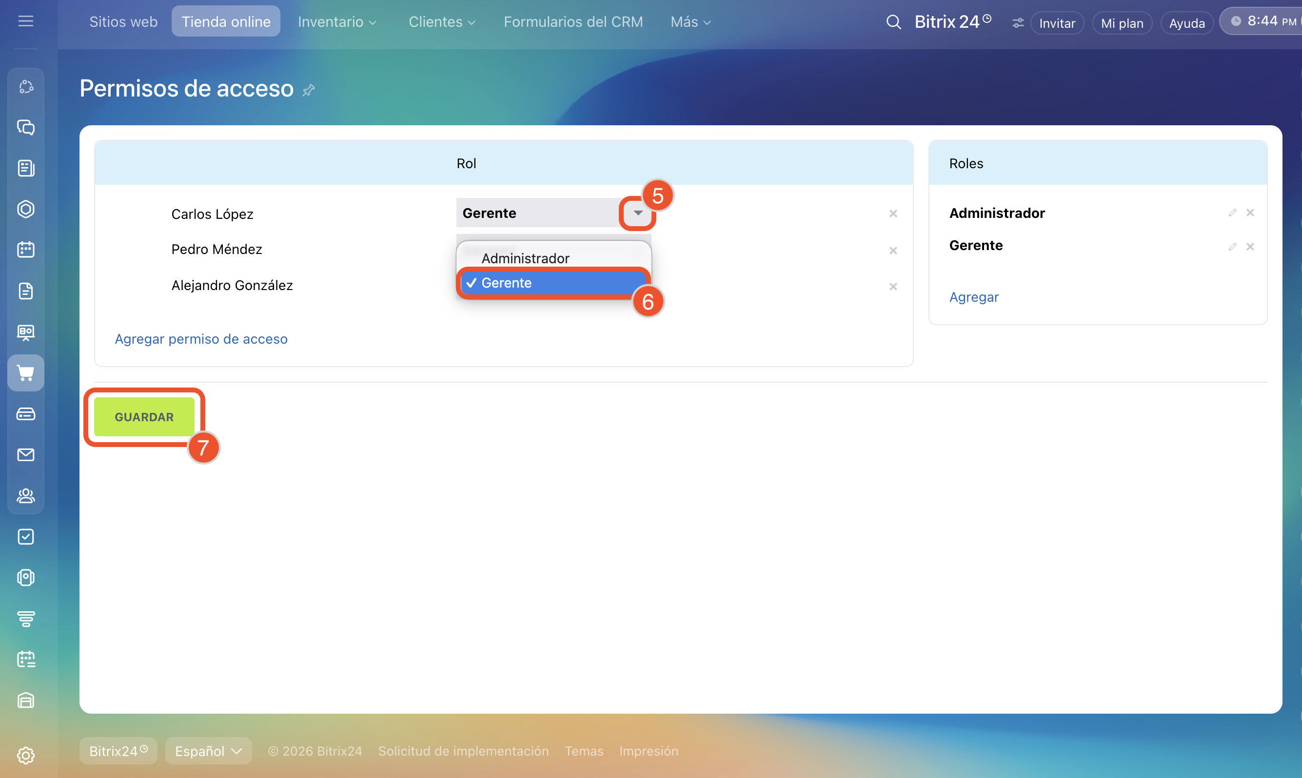 Con la configuración de permisos puedes elegir quién y cómo trabajará con los sitios y las tiendas online. Por ejemplo, el administrador del sitio tendrá acceso a todas las configuraciones, y el gestor de contenido podrá crear y editar páginas.