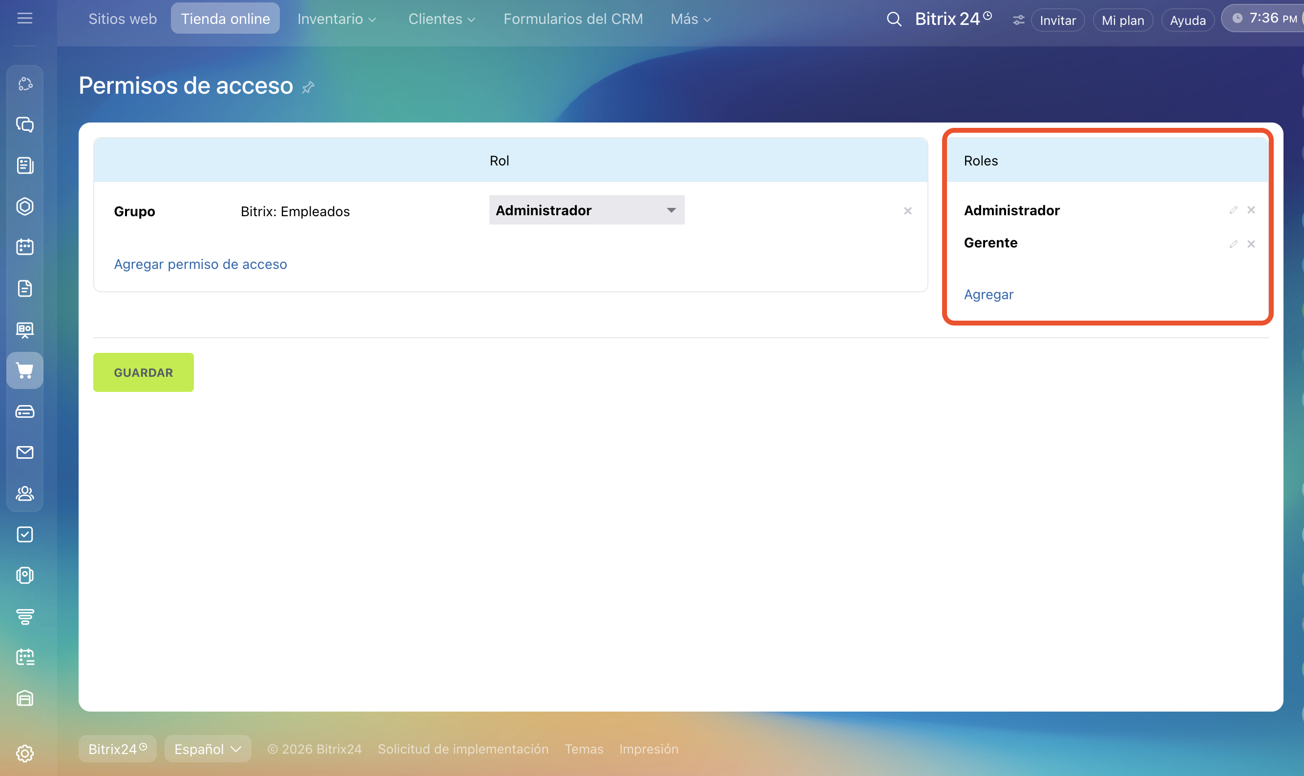 Un rol es un conjunto de permisos de acceso que se puede asignar a un usuario. En la configuración de permisos para sitios y tiendas online hay dos roles estándar: