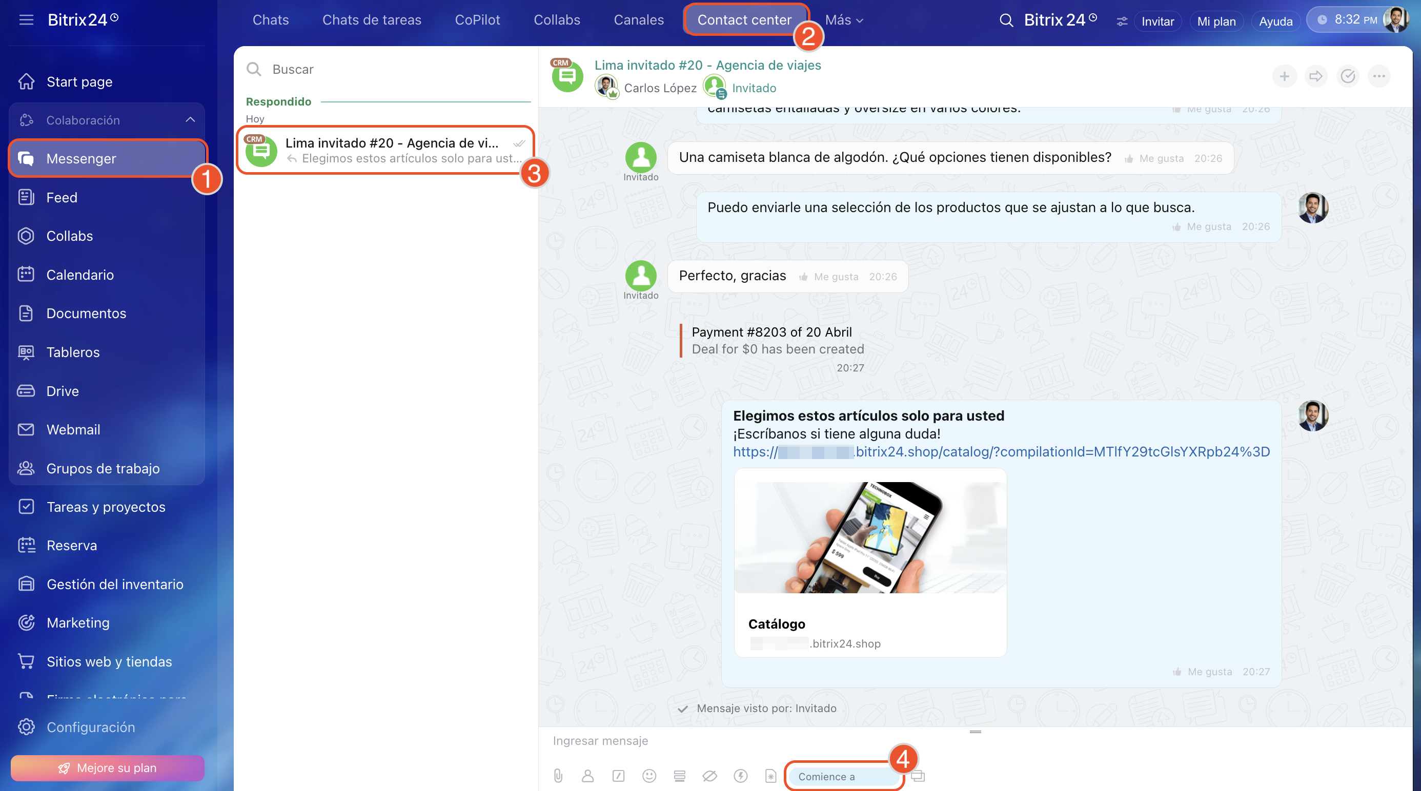 1–4. Ve a Messenger > Contact Center. Abre el chat con el cliente. En la parte inferior haz clic en Comience a vender.