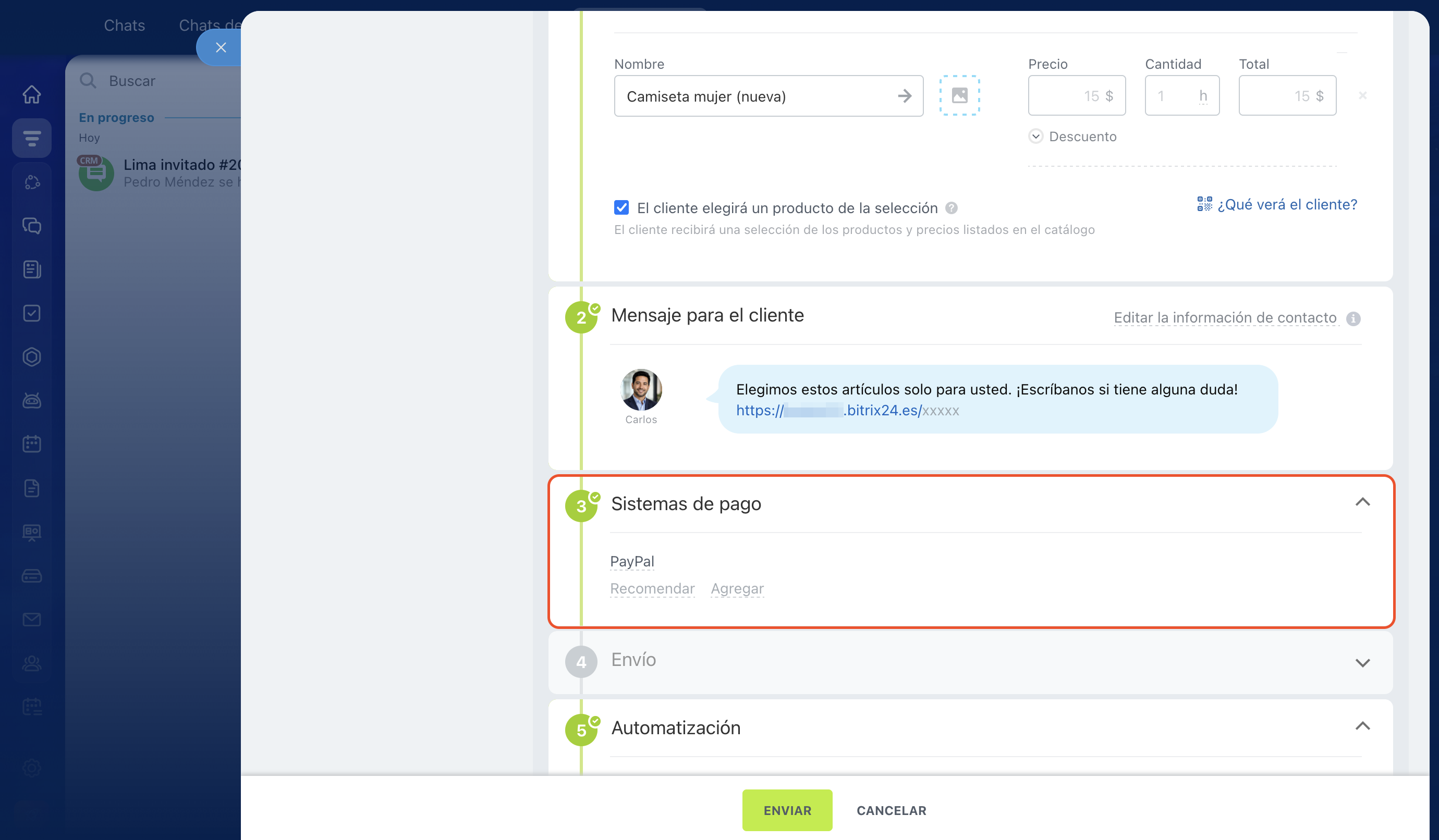 Si envías la selección desde el chat, el enlace aparecerá en la conversación. Si la envías desde la negociación, el cliente la recibirá por SMS.
