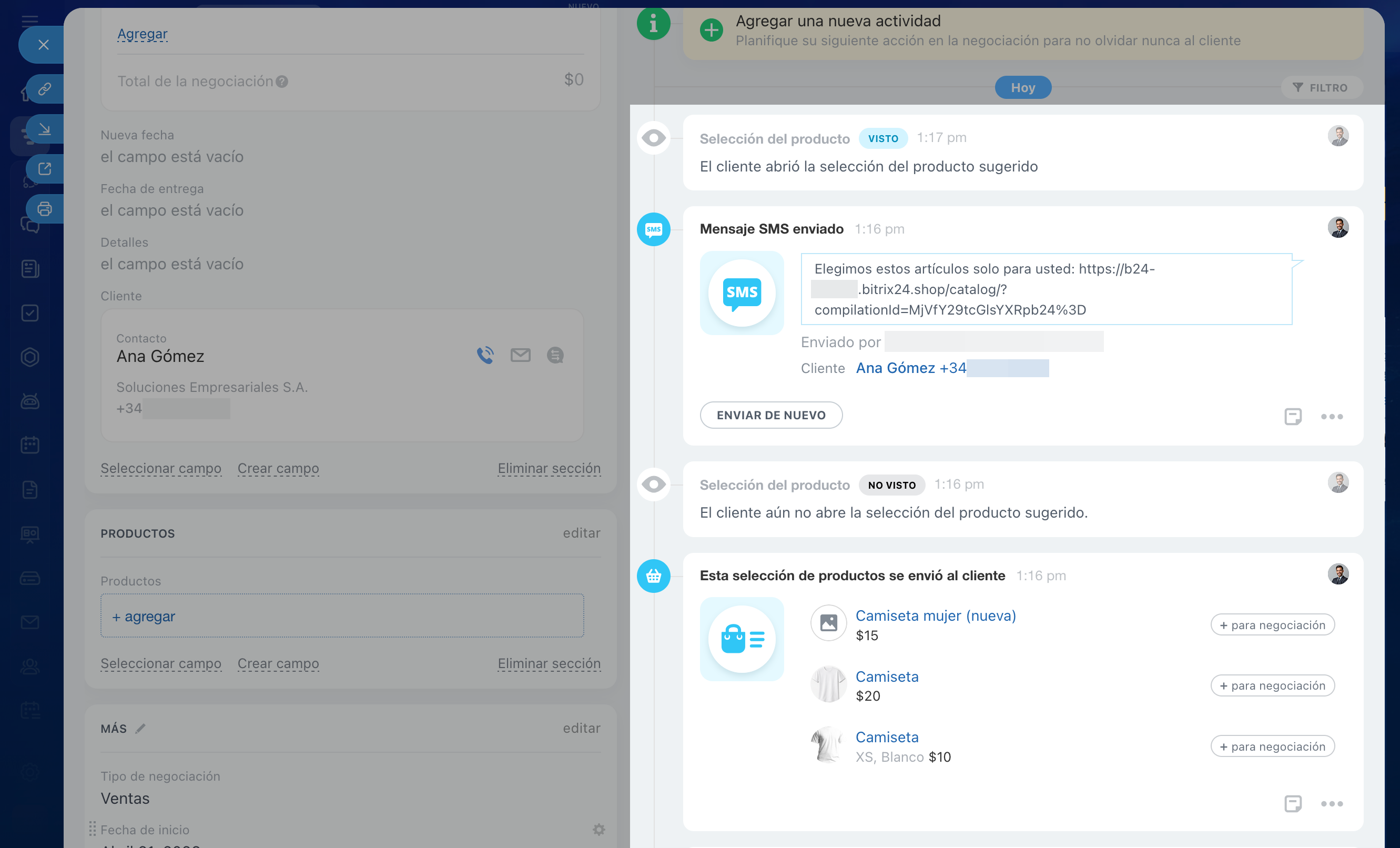 Desde la negociación. Si ya trabajas con el cliente en el CRM, envía la selección desde la ficha de la negociación. El cliente recibirá el enlace por SMS.