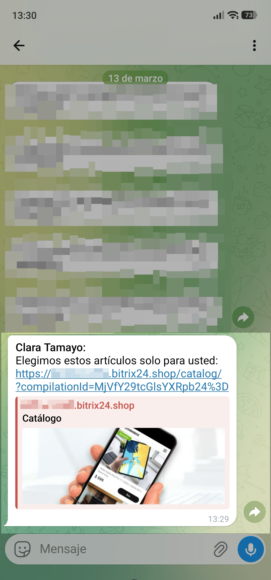 En Bitrix24 puedes reunir varios productos en una selección y enviarla al cliente mediante un solo enlace. Esto es conveniente cuando el cliente elige entre varias opciones: no es necesario enviar cada producto en un mensaje separado.