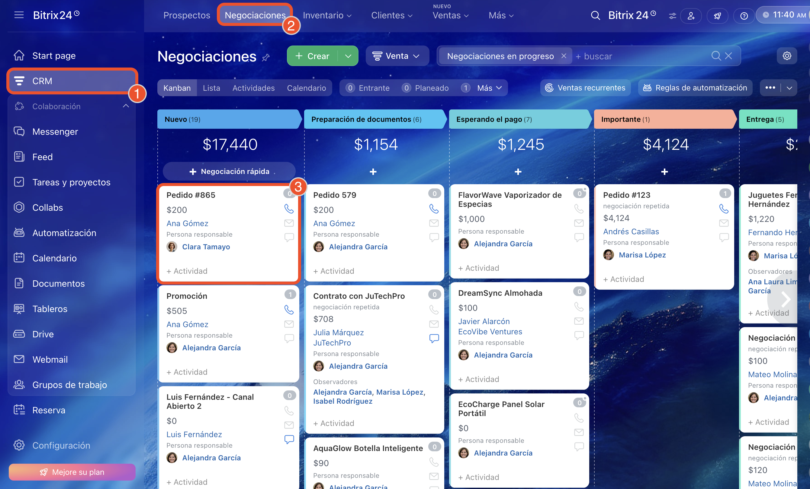 1–3. Ve a CRM > Negociaciones. Abre la negociación necesaria.