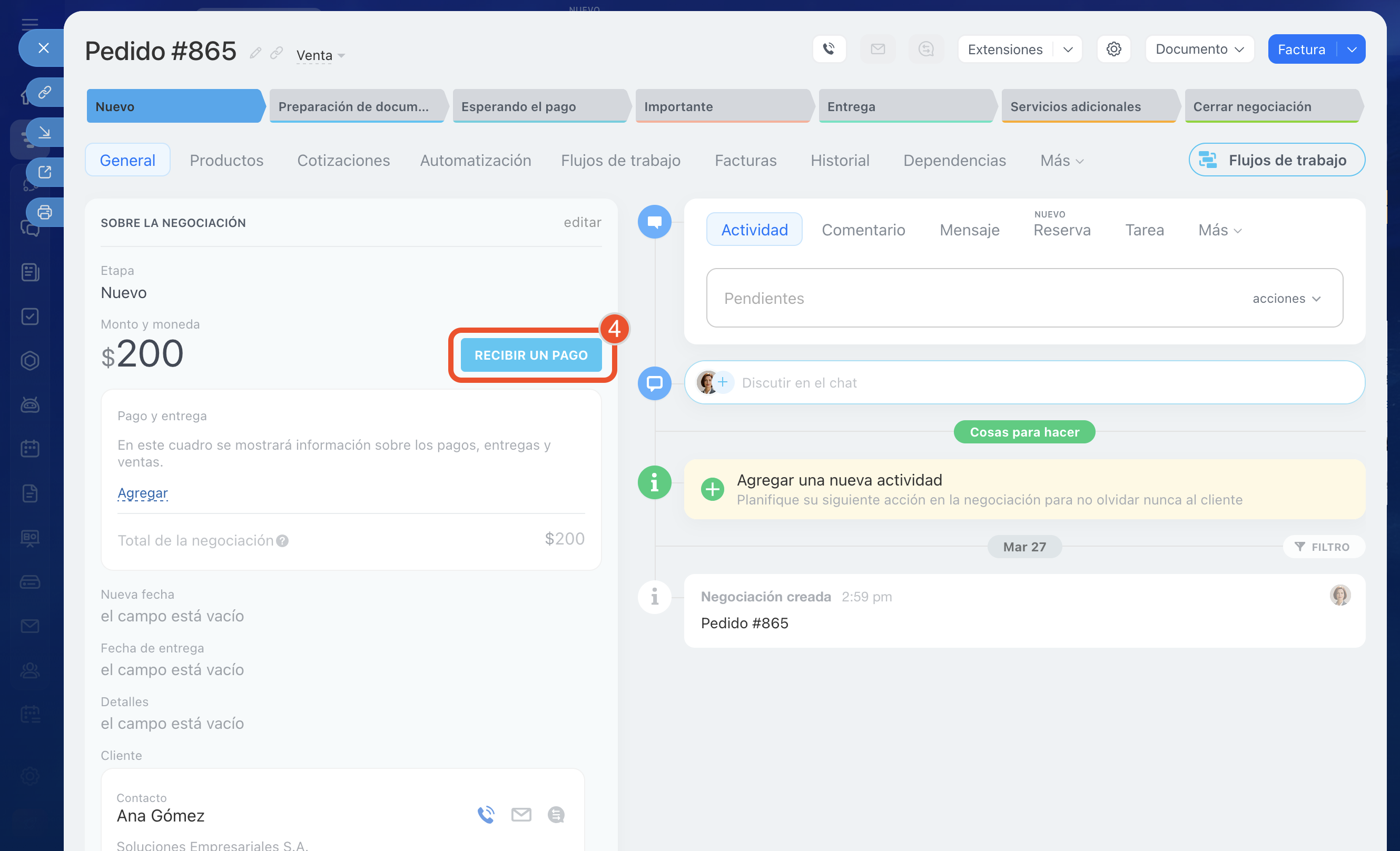 4. En la ficha de la negociación haz clic en Recibir un pago.