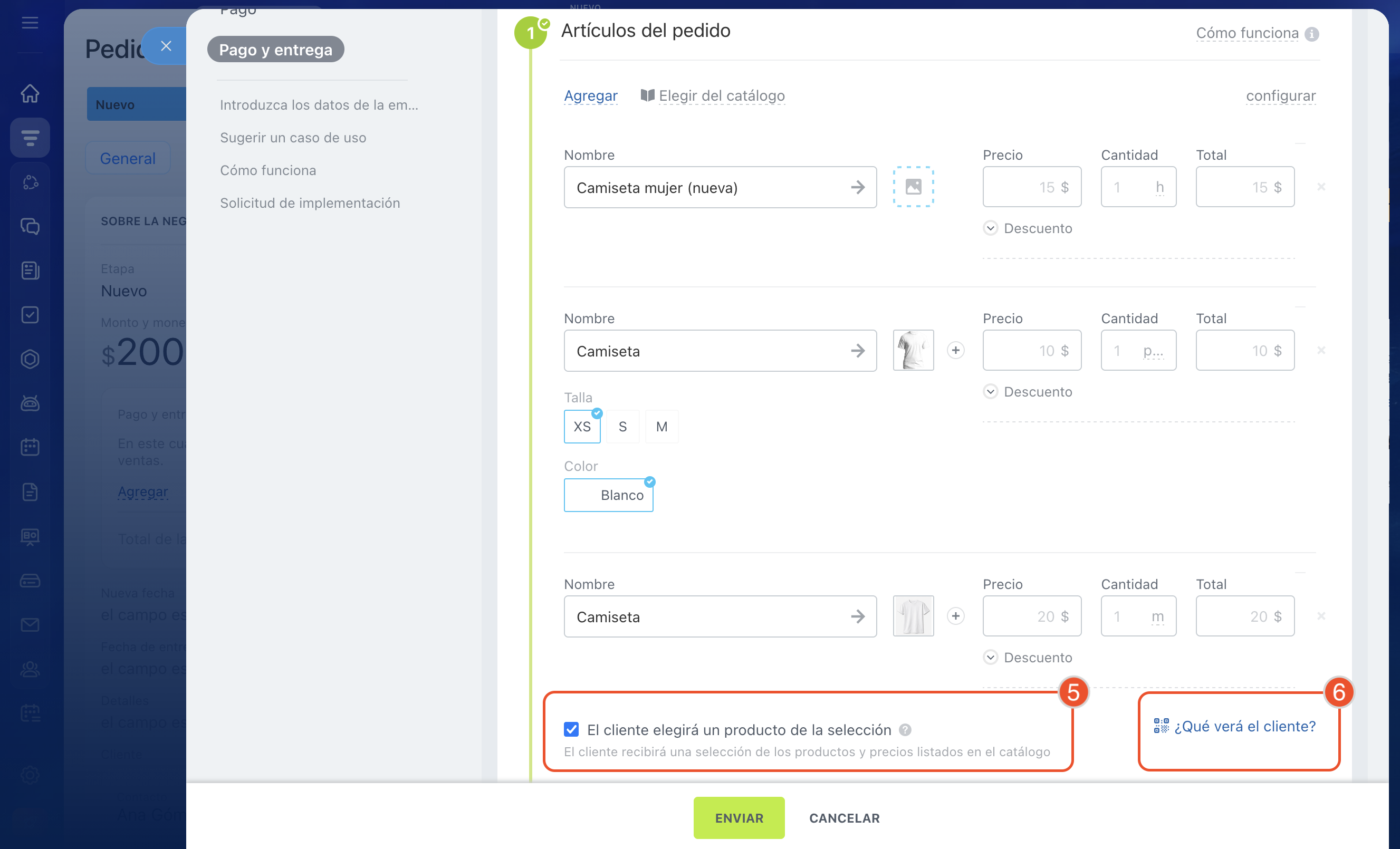 - En la negociación se muestra cómo el cliente interactúa con la selección: cuando abre el enlace aparece una notificación y, después de realizar el pedido, los productos seleccionados se añadirán a la ficha de la negociación.