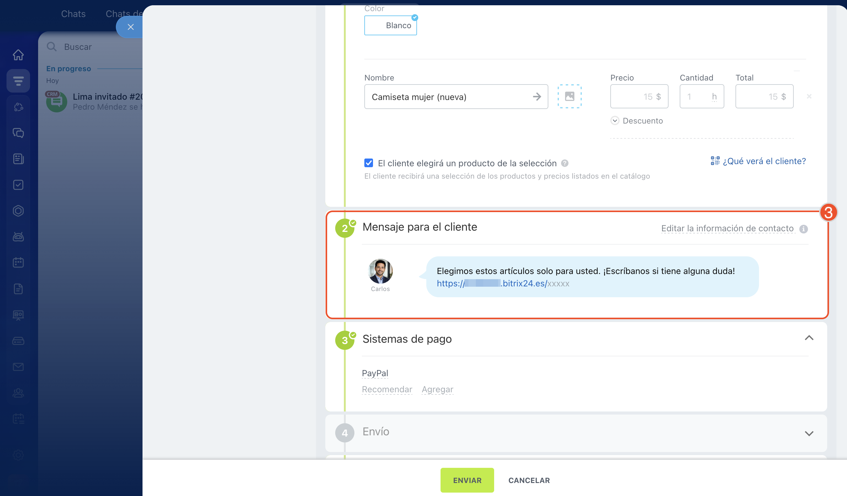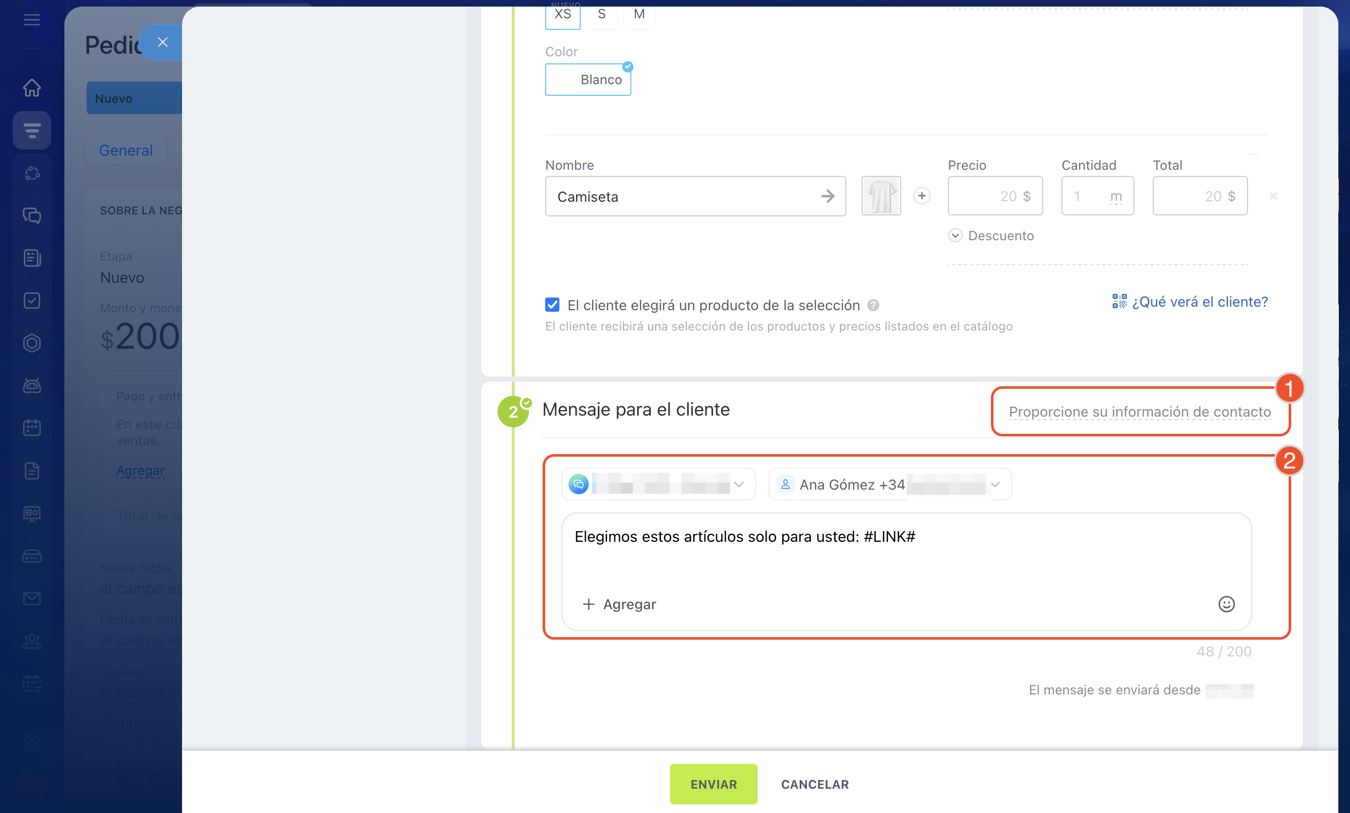 Mensaje para el cliente. Verifica los datos del cliente y selecciona los parámetros de envío. Dependen de si envías la selección por SMS o mediante el chat del canal abierto.